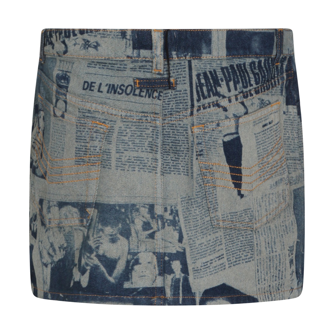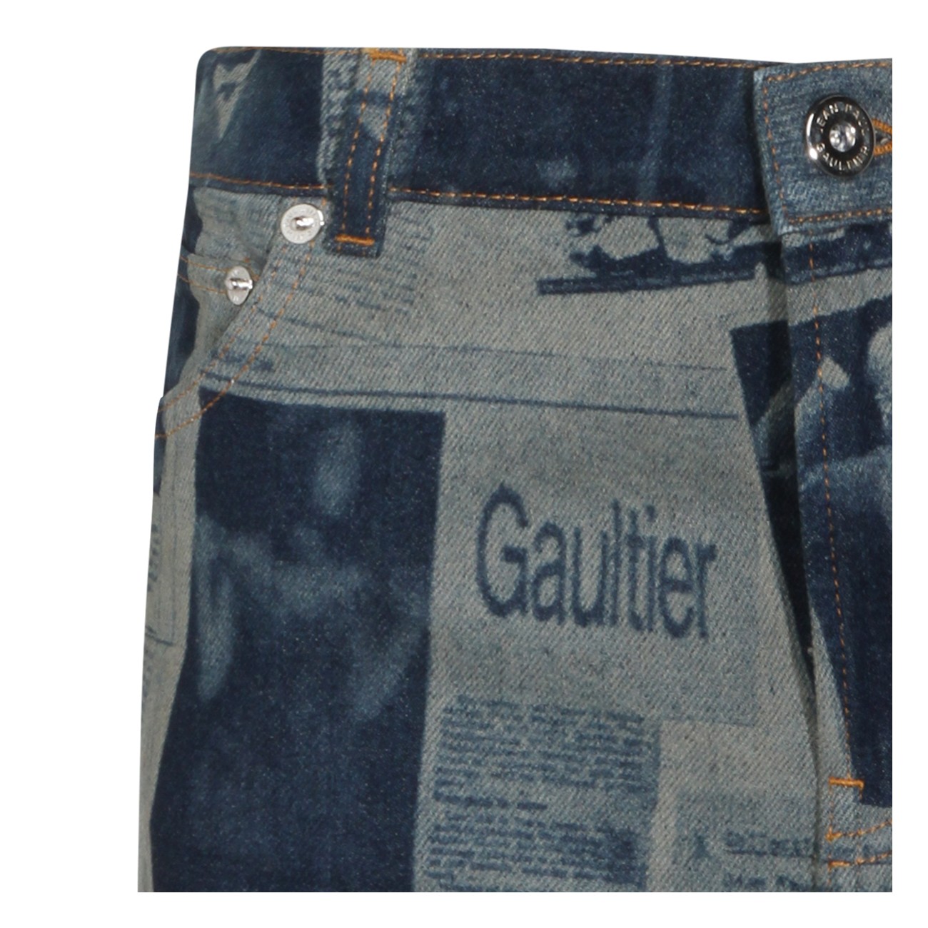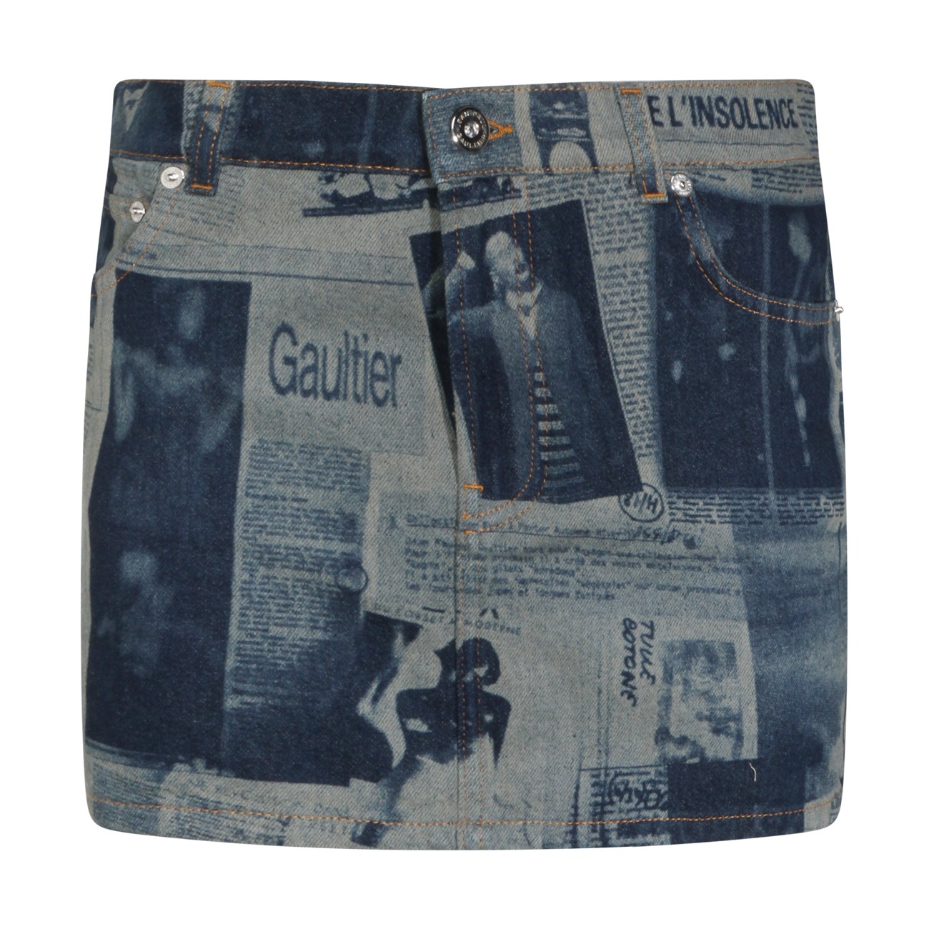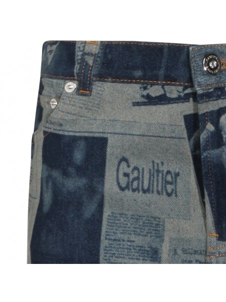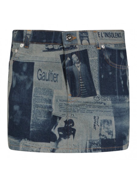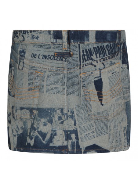 Blue and beige cotton skirt from Jean Paul Gaultier featuring low waist, belt loops, zip fastening, pockets, all over stamp and short length.