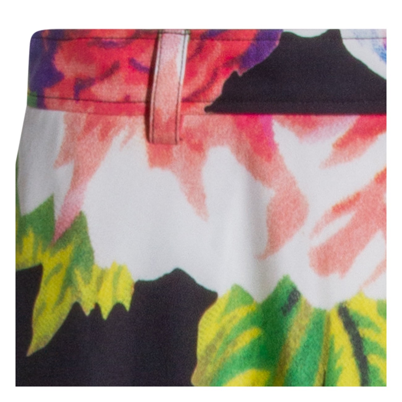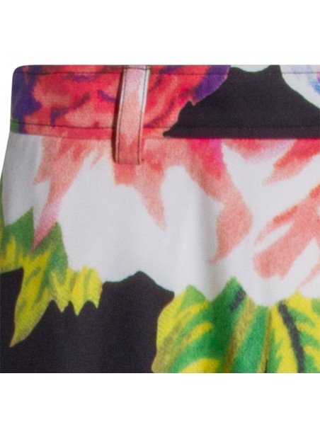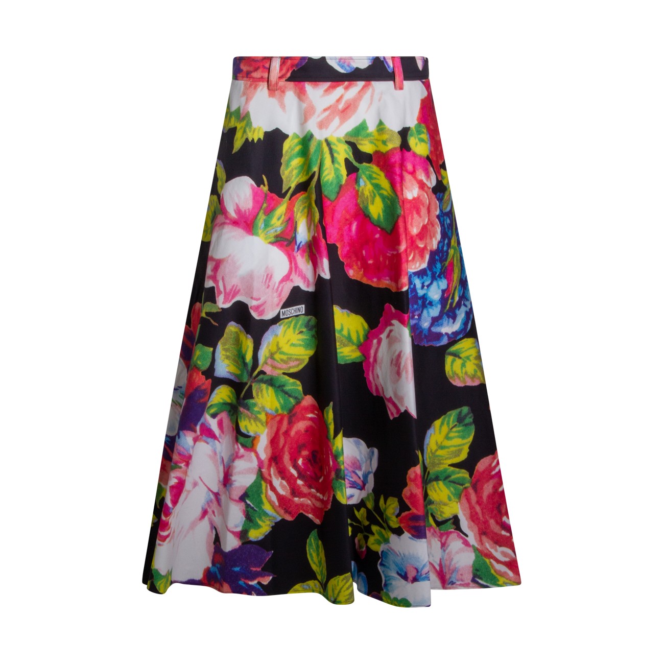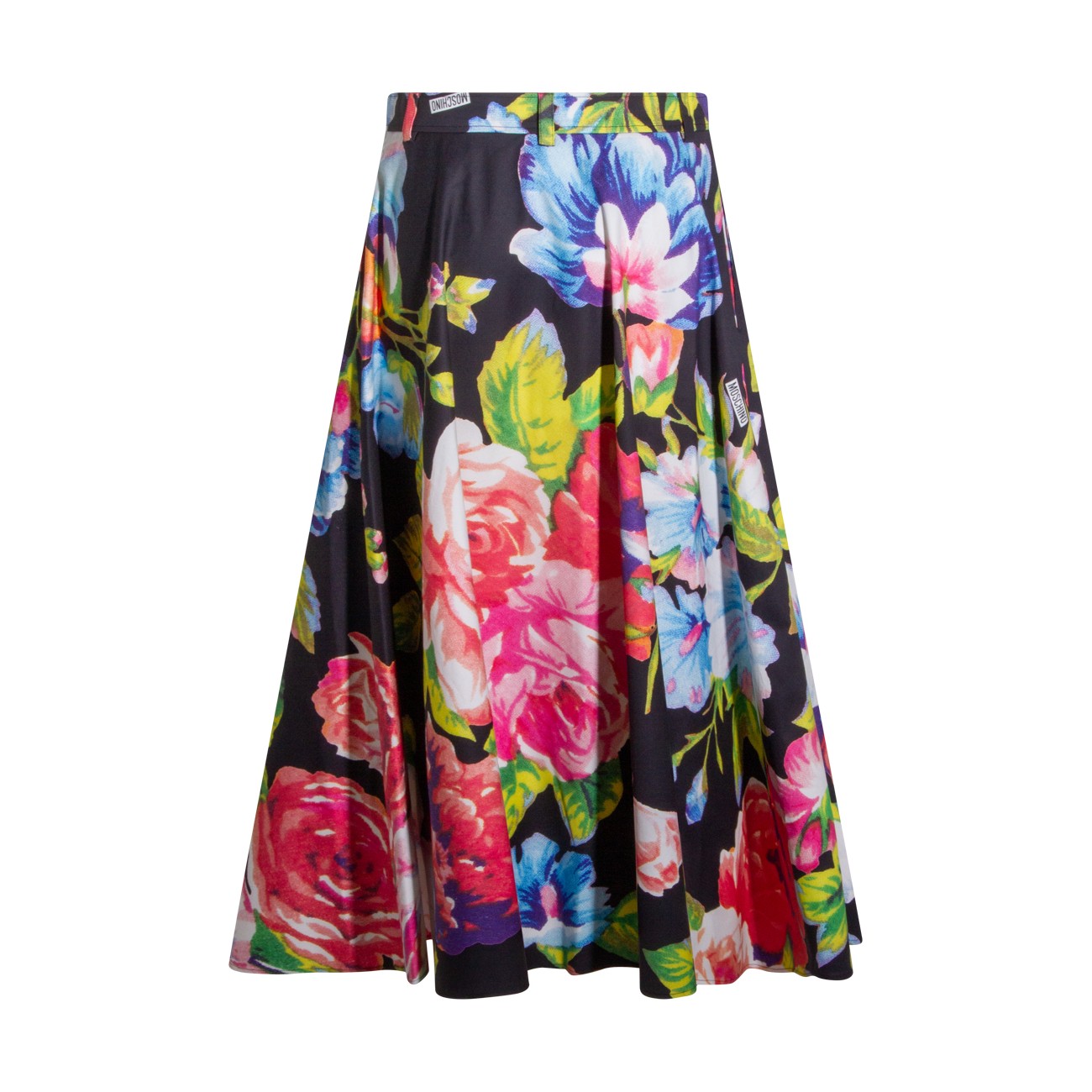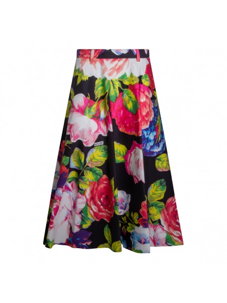 Black cotton skirt from Moschino featuring high waist, belt loops, all over length, floral stamp and oversize vestibility.