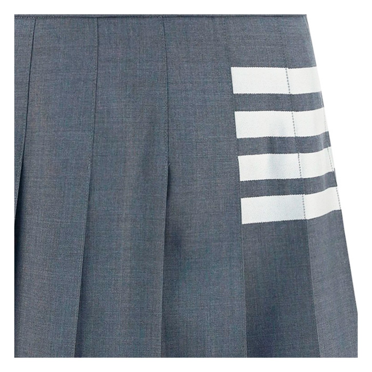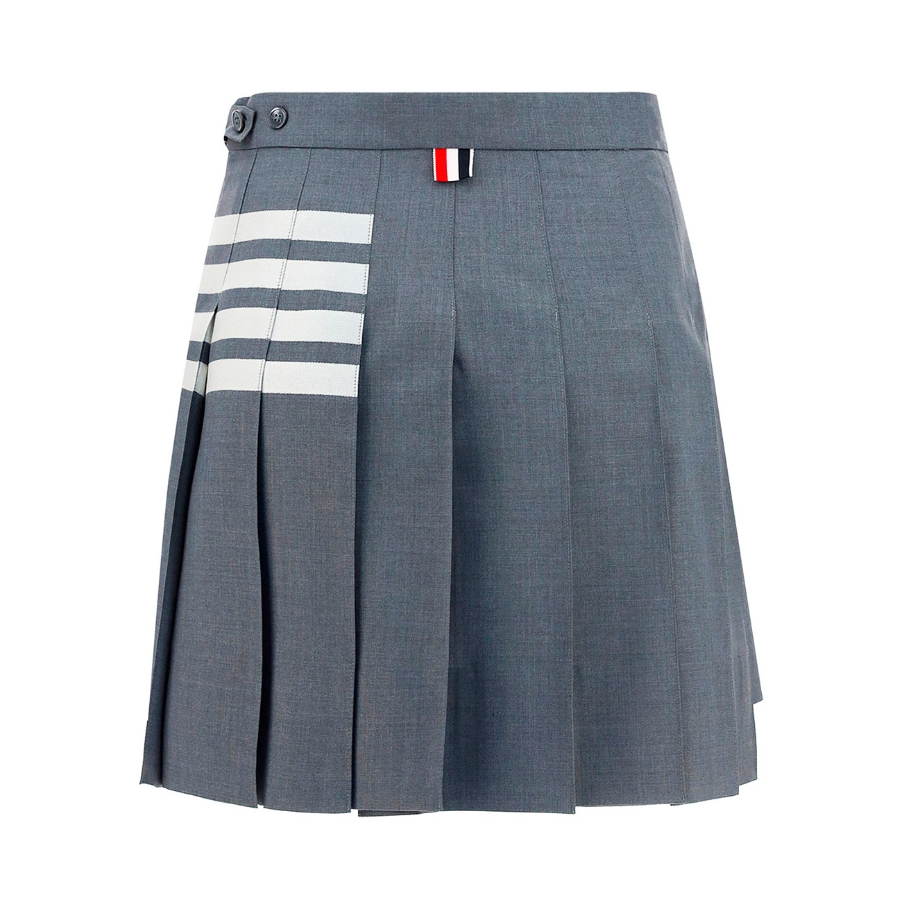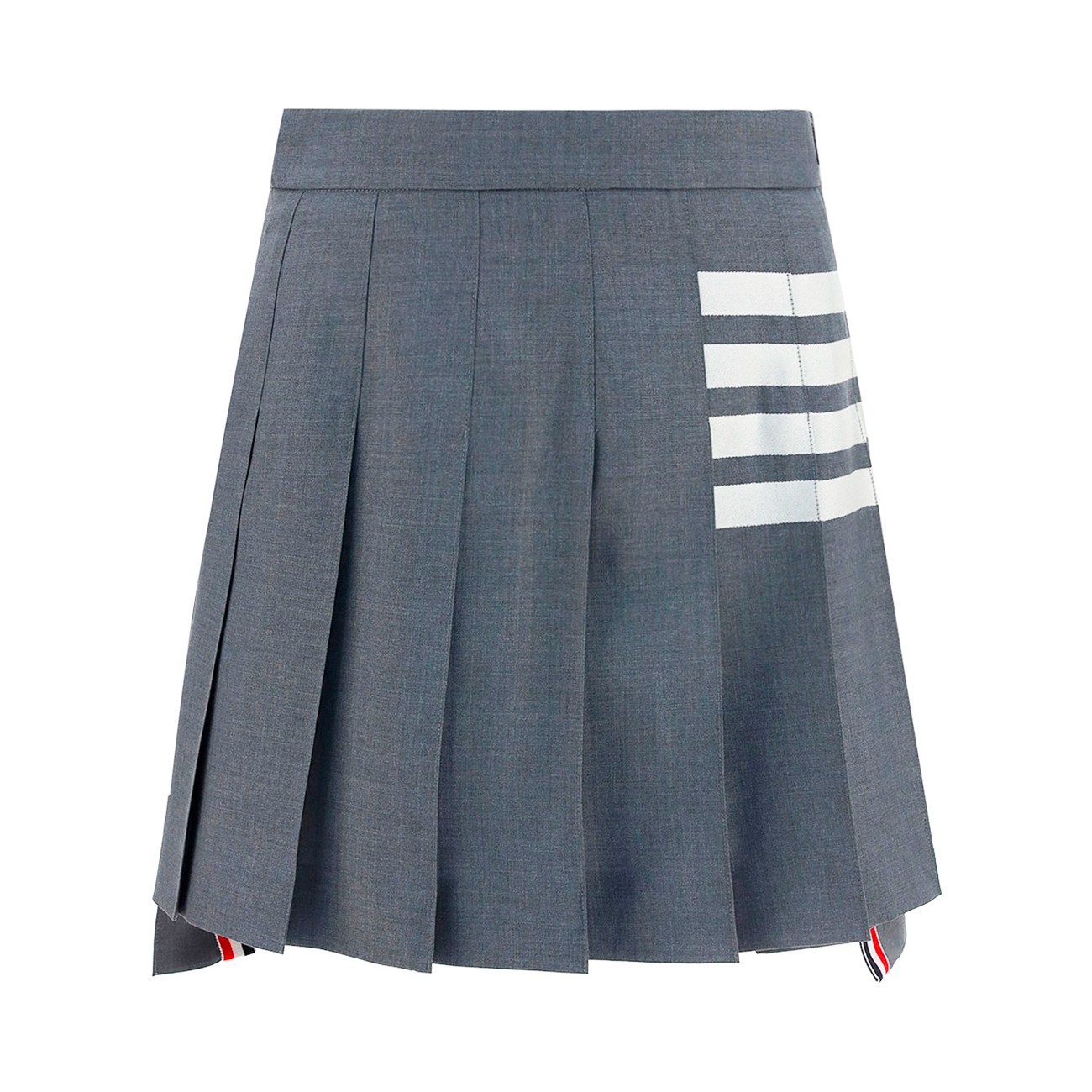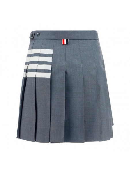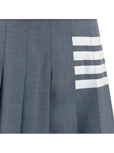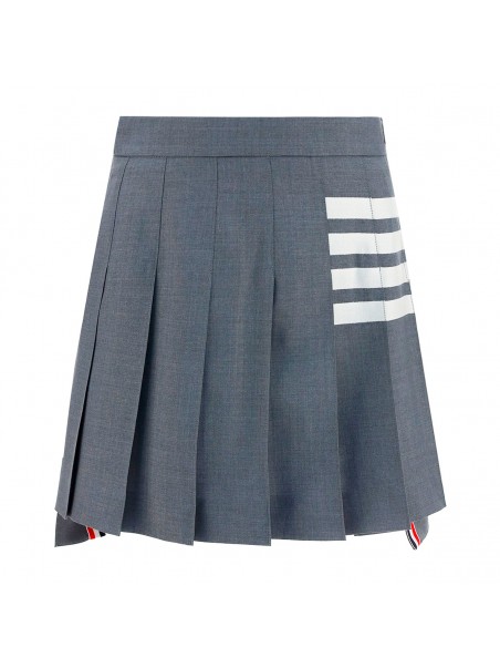 Grey and white wool skirt from Thom Browne featuring high waist, pleated details, side slits, short length, 4-Bar stripes and RWB details.