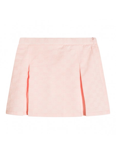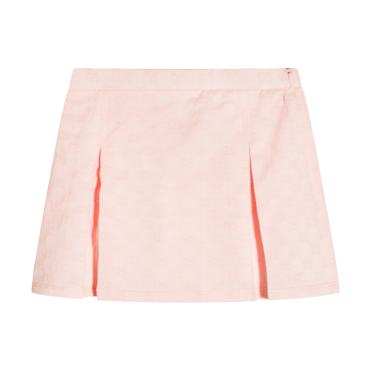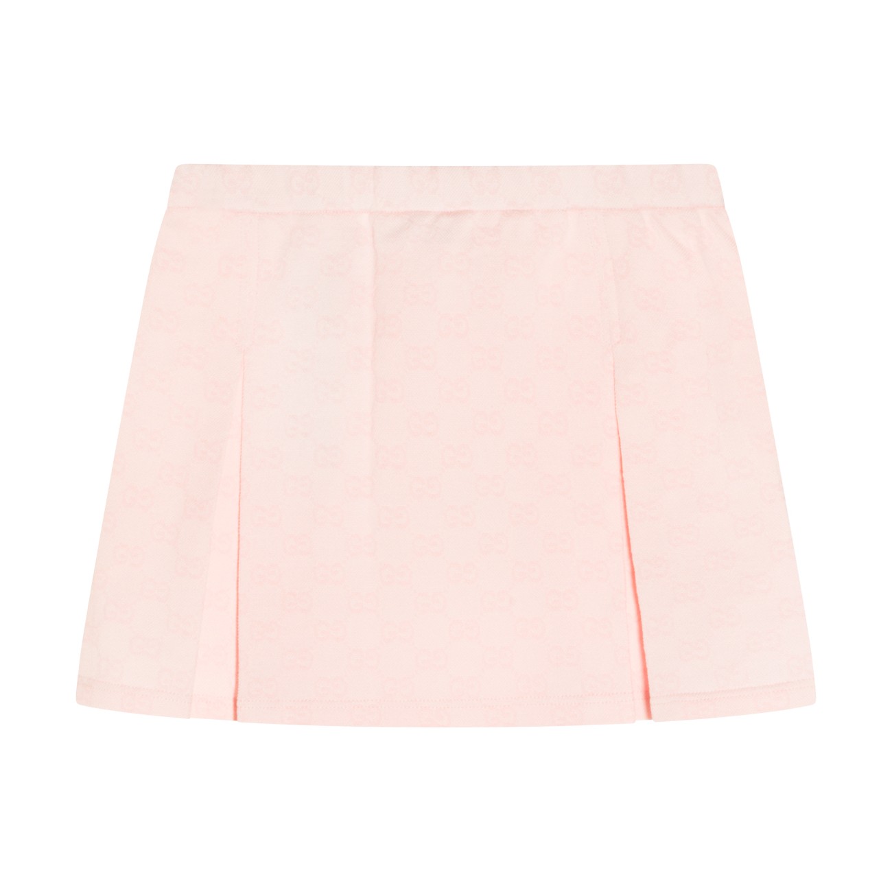 Baby pink cotton skirt from Gucci featuring short length, all over iconic GG stamp and regular vestibility.