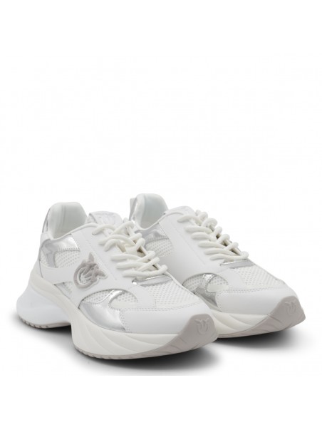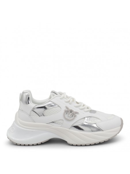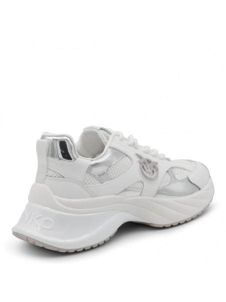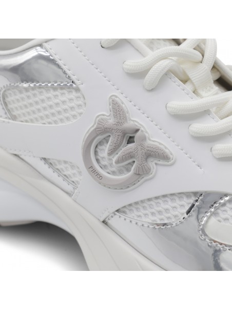 White and silver sneakers from Pinko featuring round toe, silver tone details, lateral logo and rubber sole.