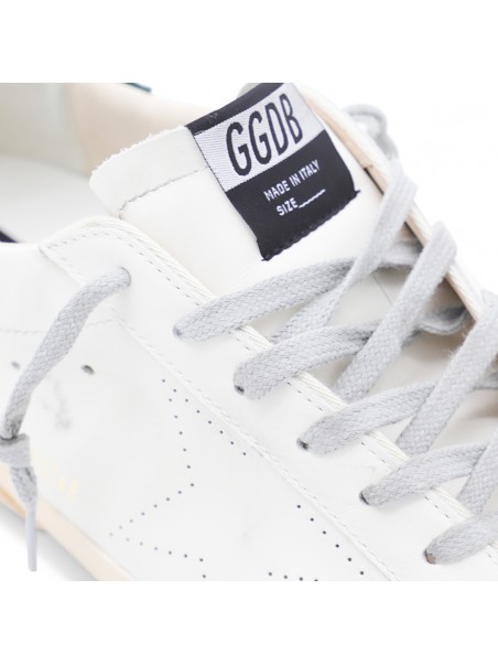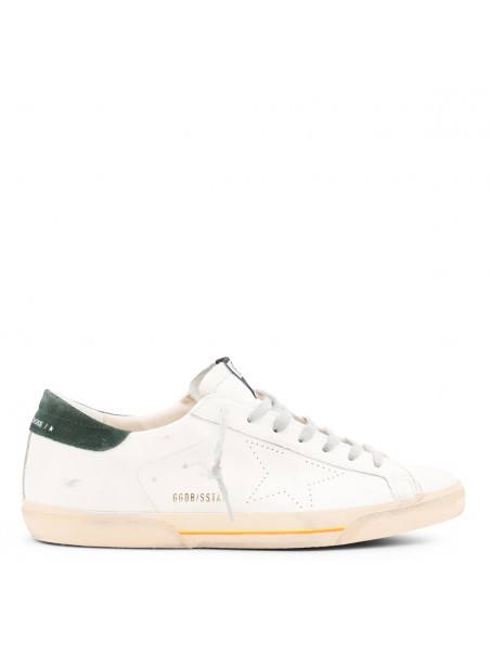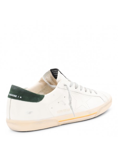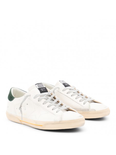 White and green leather Super Star sneakers from Golden Goose featuring round toe, cotton laces fastening, suede details on the heel, rubber sole, branded insole, logo and star patch.