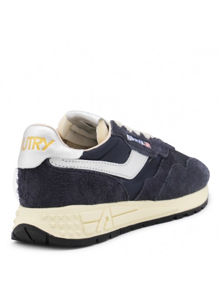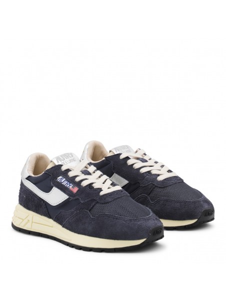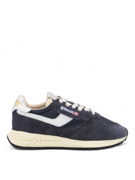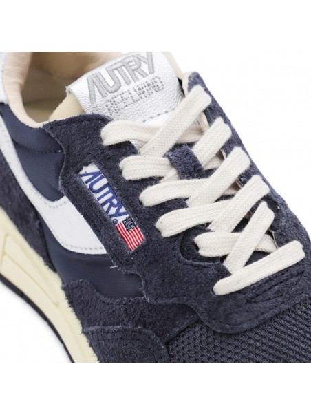 Dark blue and white leather Reelwind sneakers from Autry featuring round toe, cotton lace-up fastening, lateral logo, reinforced heel, suede details, rubber sole and branded tongue.