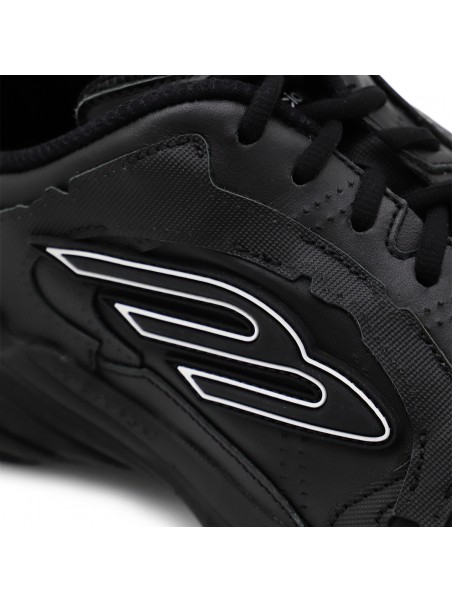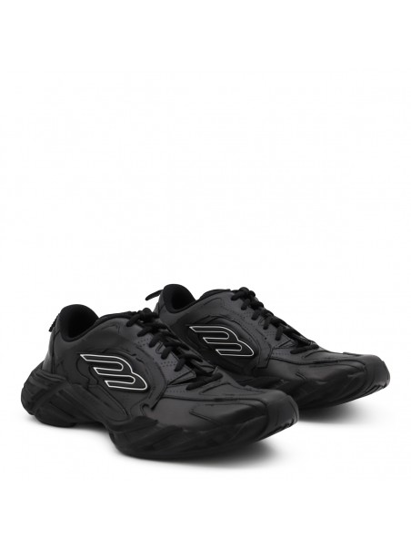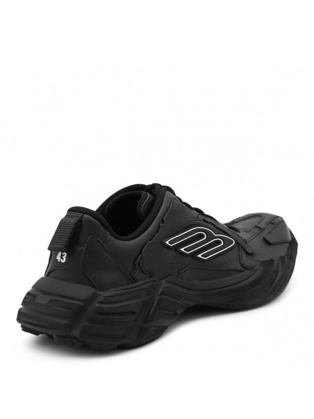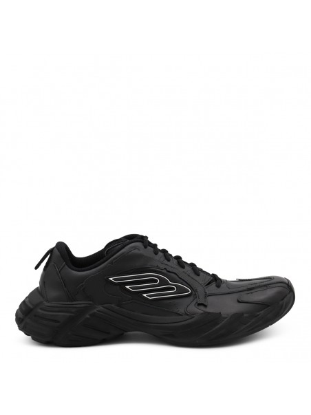 Black leather Monday sneakers from Balenciaga featuring round toe, visible stitchings, logo, loop on the heel and rubber sole.