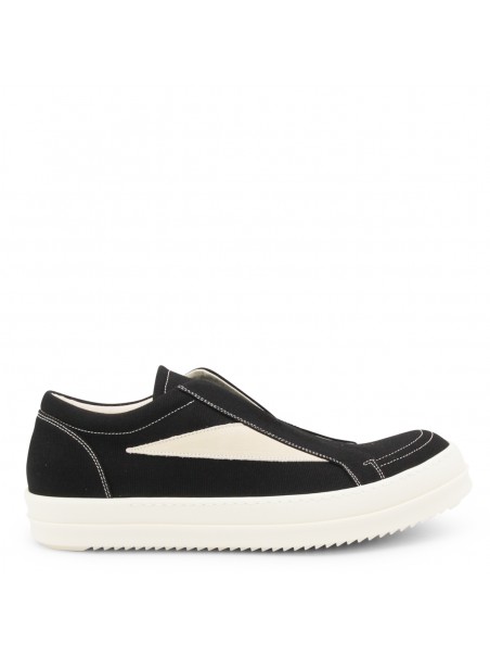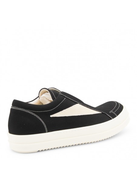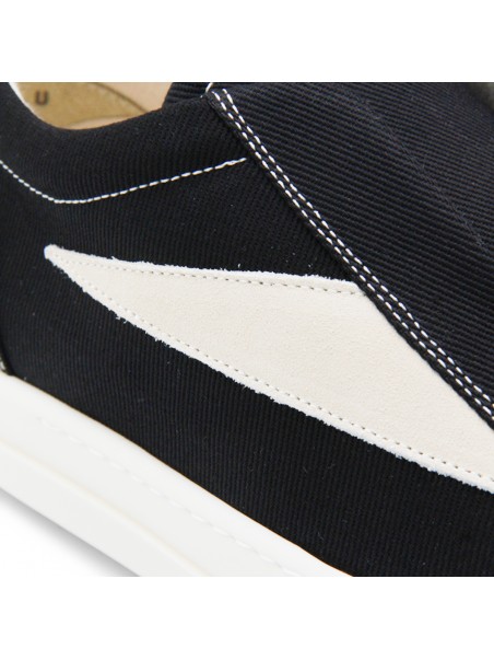 Black and white sneakers from Rick Owens DRKSHDW featuring round toe, leather sole and shark tooth sole.