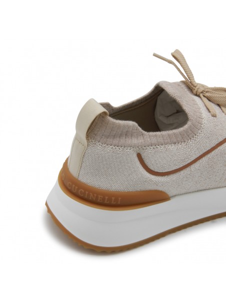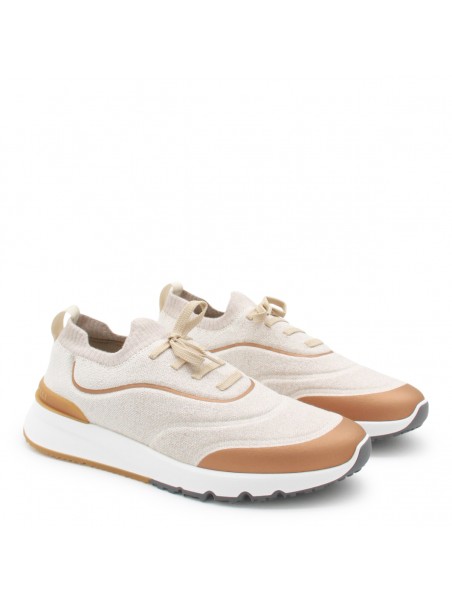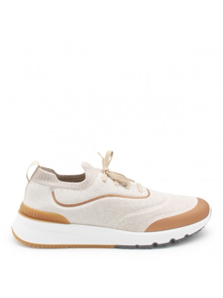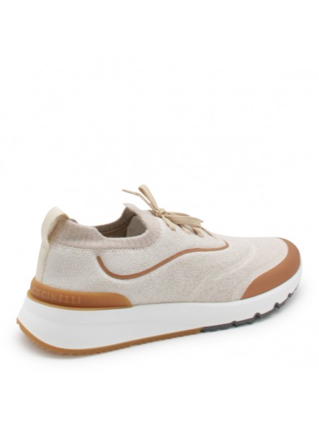 Beige and brown sneakers from Brunello Cucinelli featuring round toe, cotton laces fastening, panelled design and rubber sole.