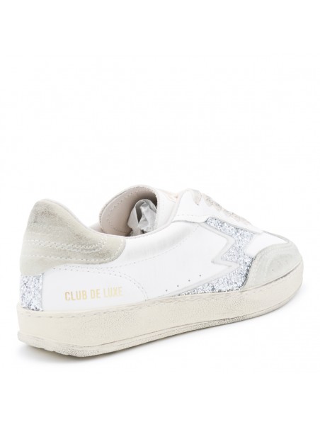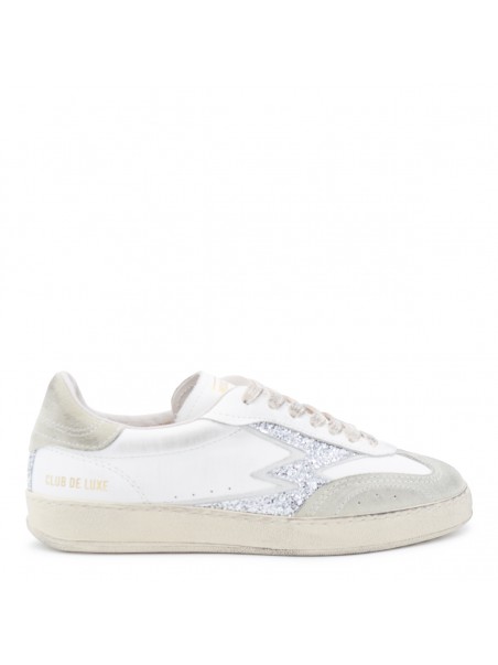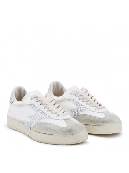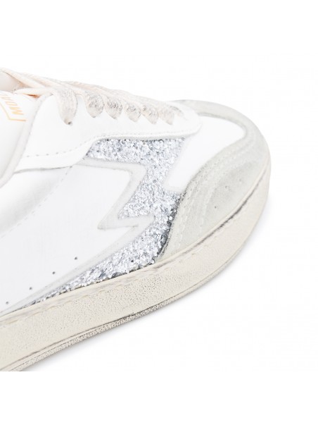 Silver and white leather sneakers from Moaconcept featuring round toe, laces fastening, logo print and rubber sole.