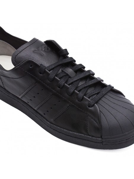 Black Y-3 superstar sneakers from Adidas Y-3 featuring round toe, laces fastening, leather sole and details.