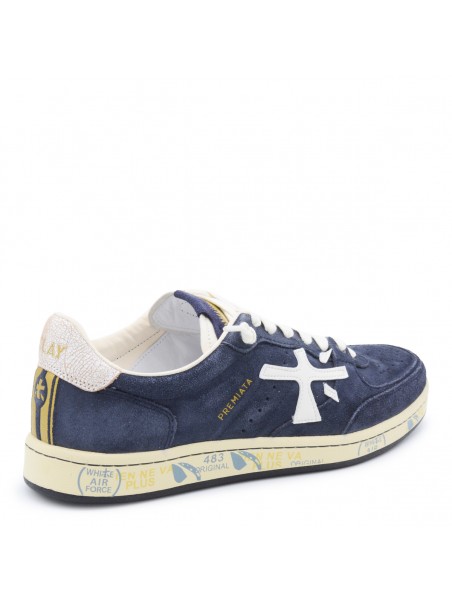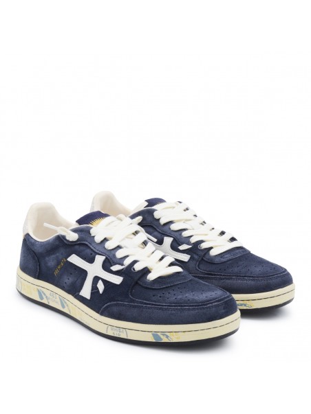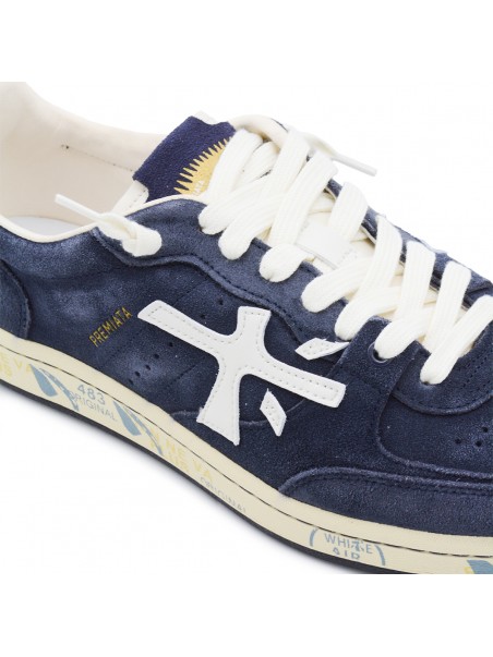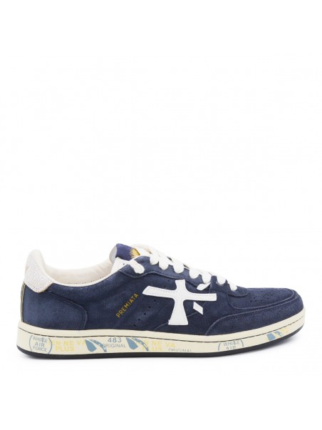 Navy Basket Clay sneakers from Premiata featuring round toe, laces fastening, lateral logo print, contrasting heel and rubber sole.