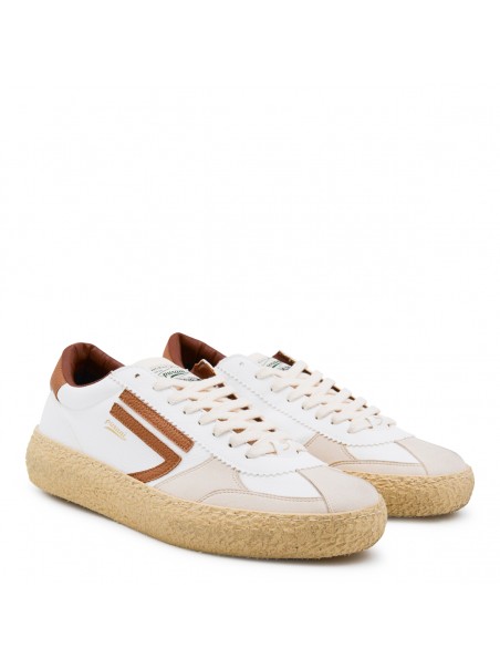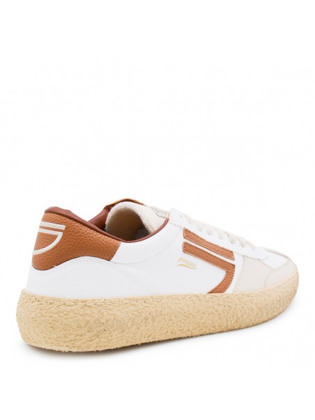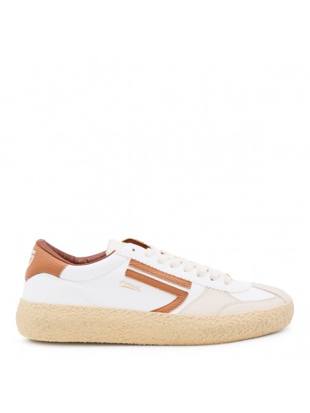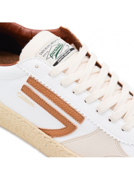 White leather sneakers from Puraai featuring round toe, laces fastening, side logo, contrasting heel counter and flat rubber sole.