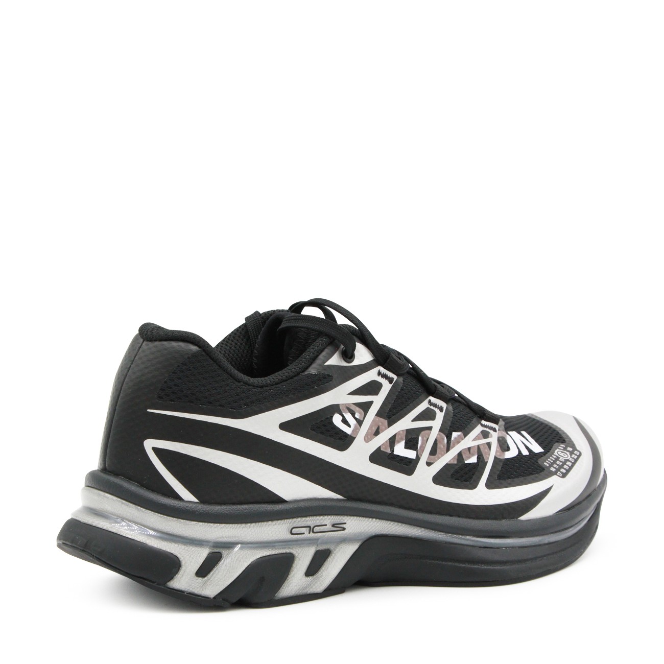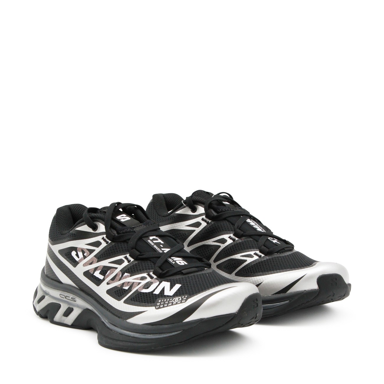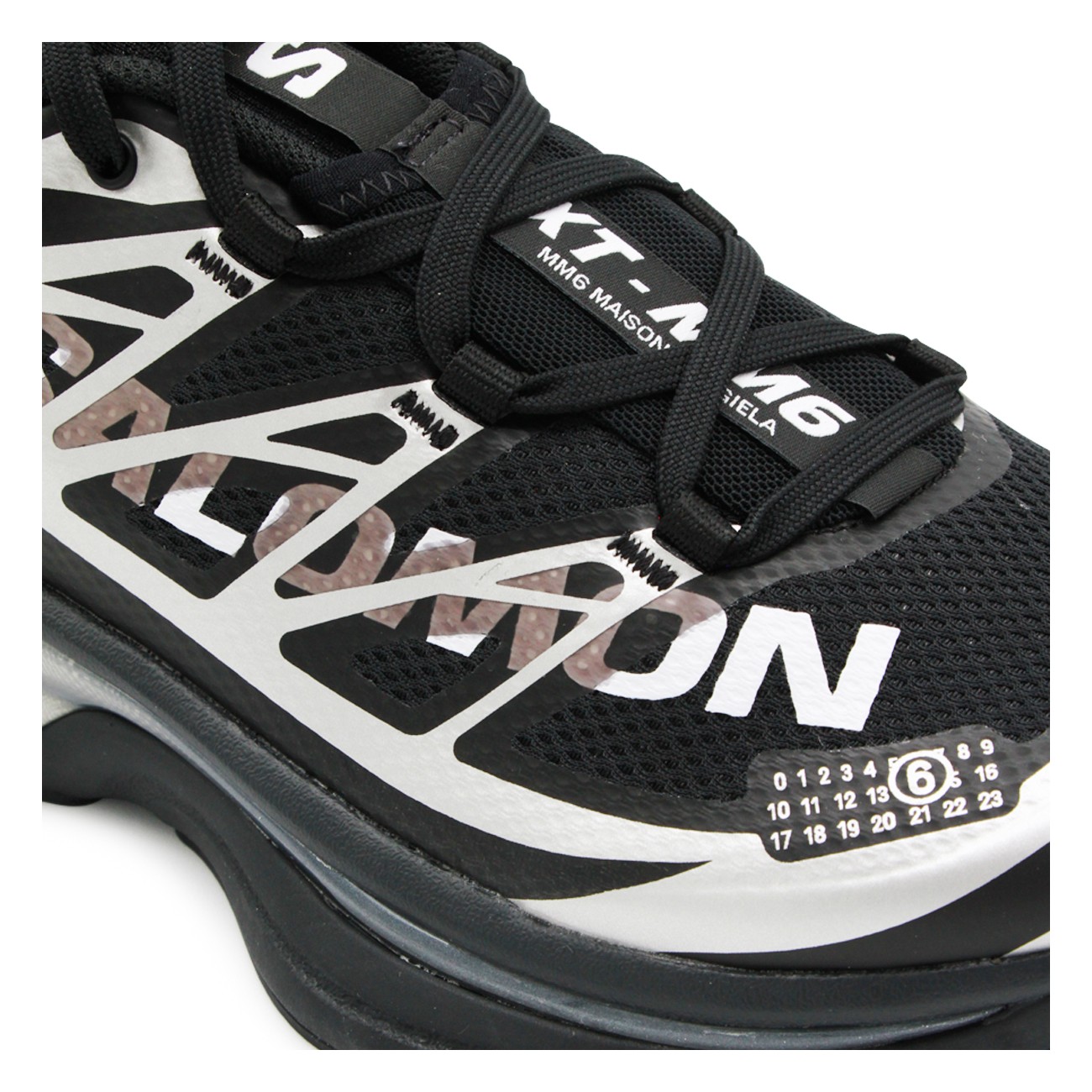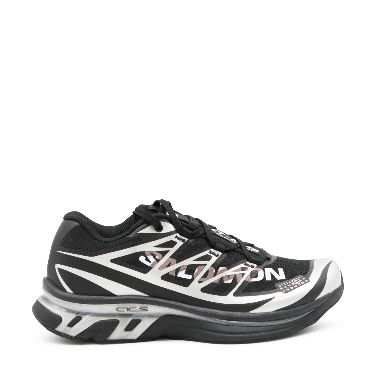 Black sneakers from Mm6 Maison Margiela x Solomon featuring round toe, laces fastening, lateral logo and rubber sole.
