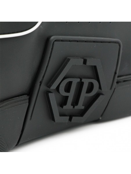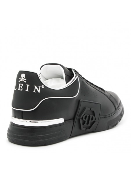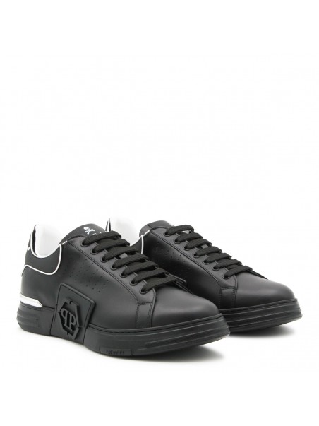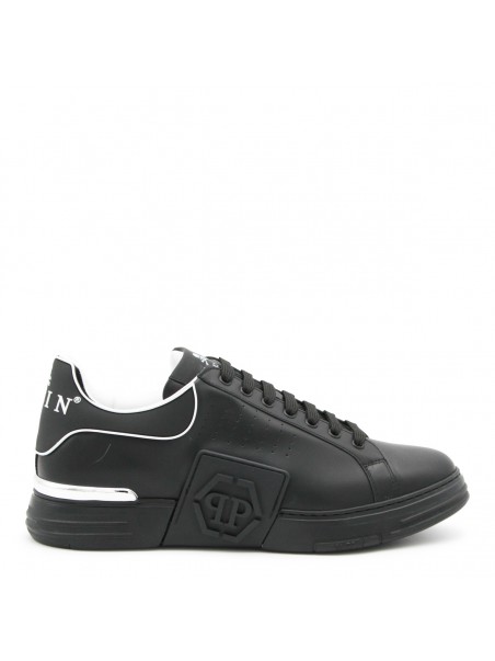 Black leather Hexagone sneakers from Philipp Plein featuring round toe, laces fastening, branded heel counter and rubber sole.