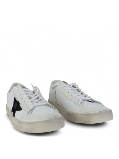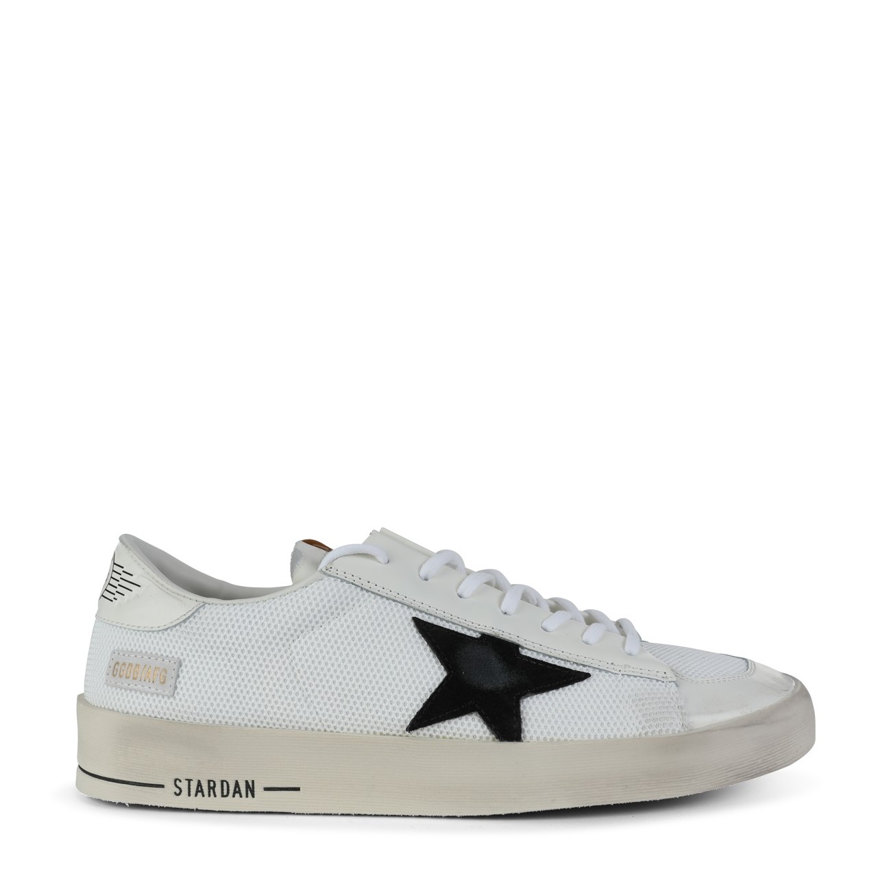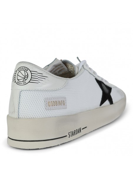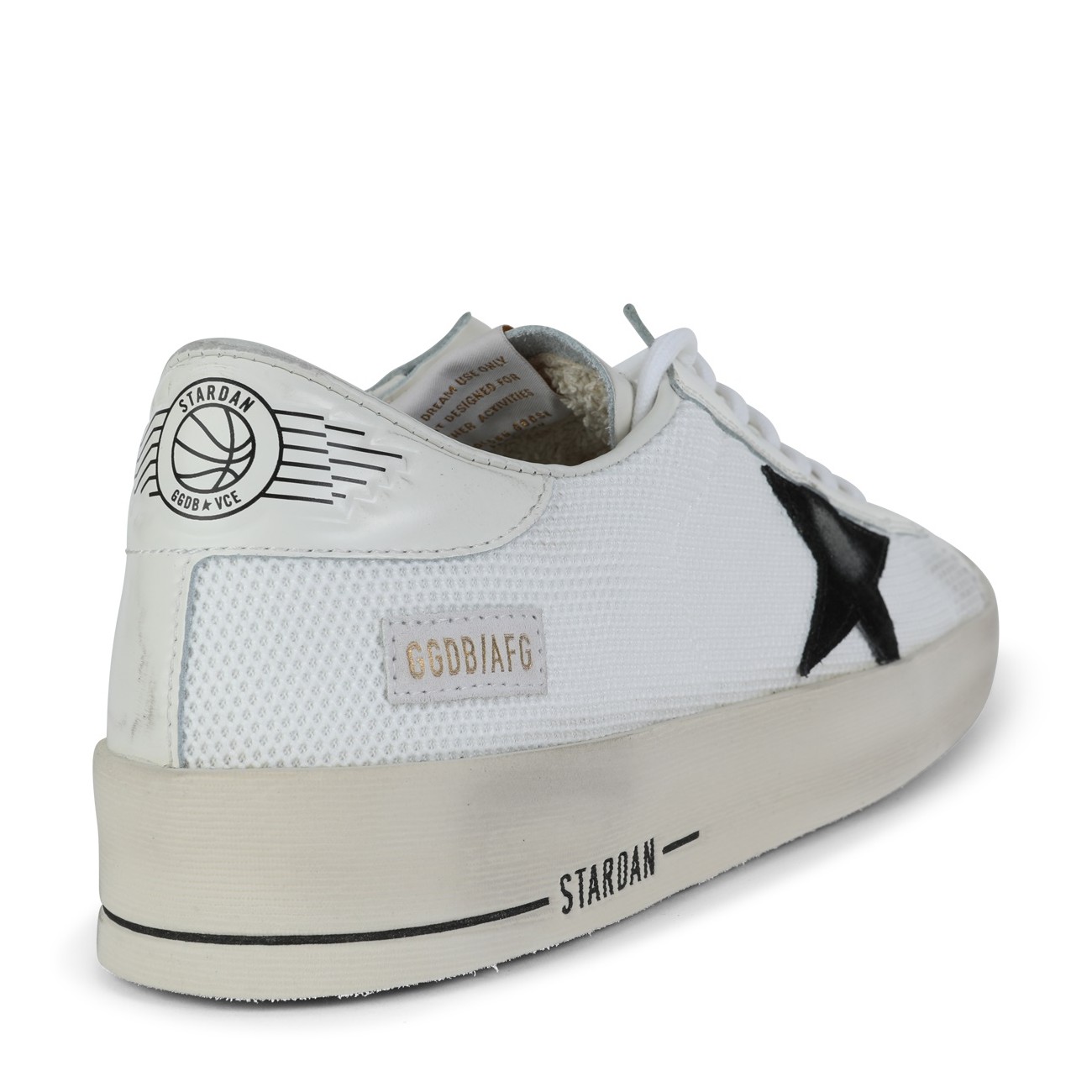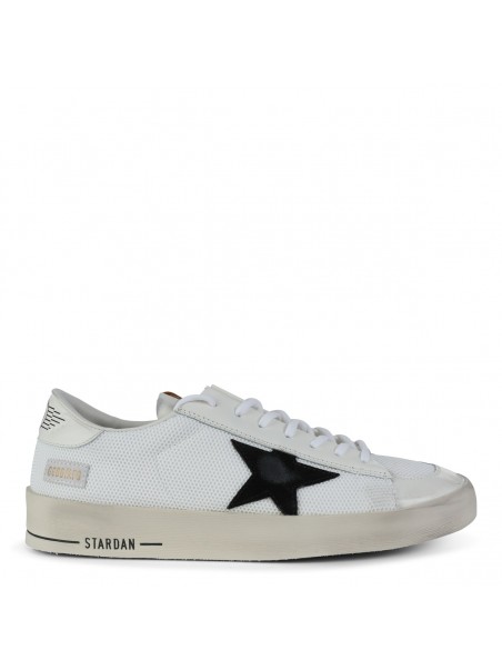White and black leather Stardan sneakers from Golden Goose featuring round toe, cotton laces fastening, flat rubber sole, reinforced heel, logo and star patch detail.