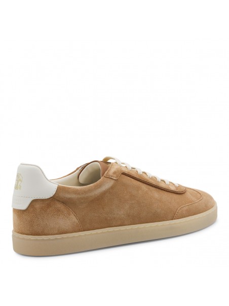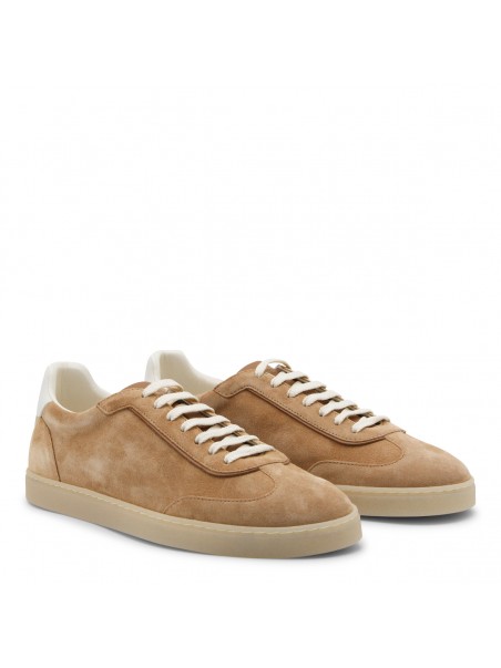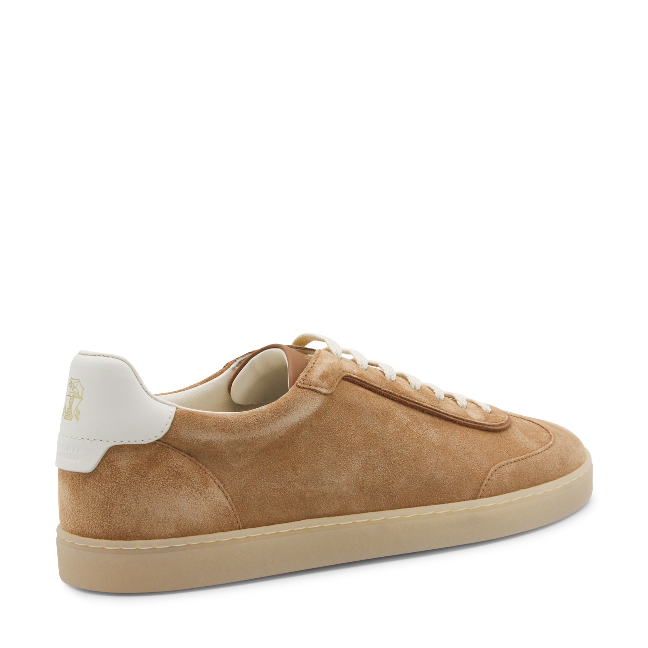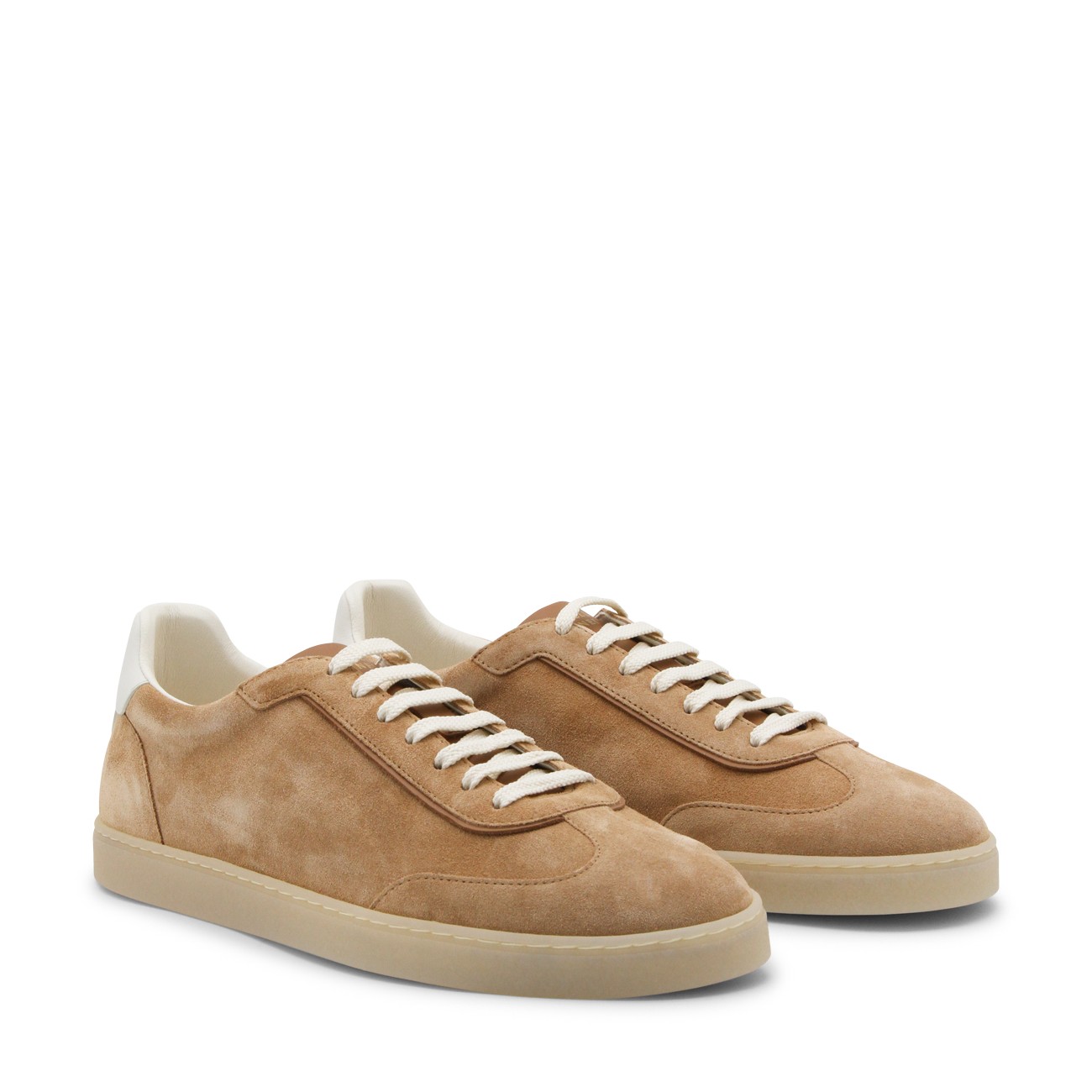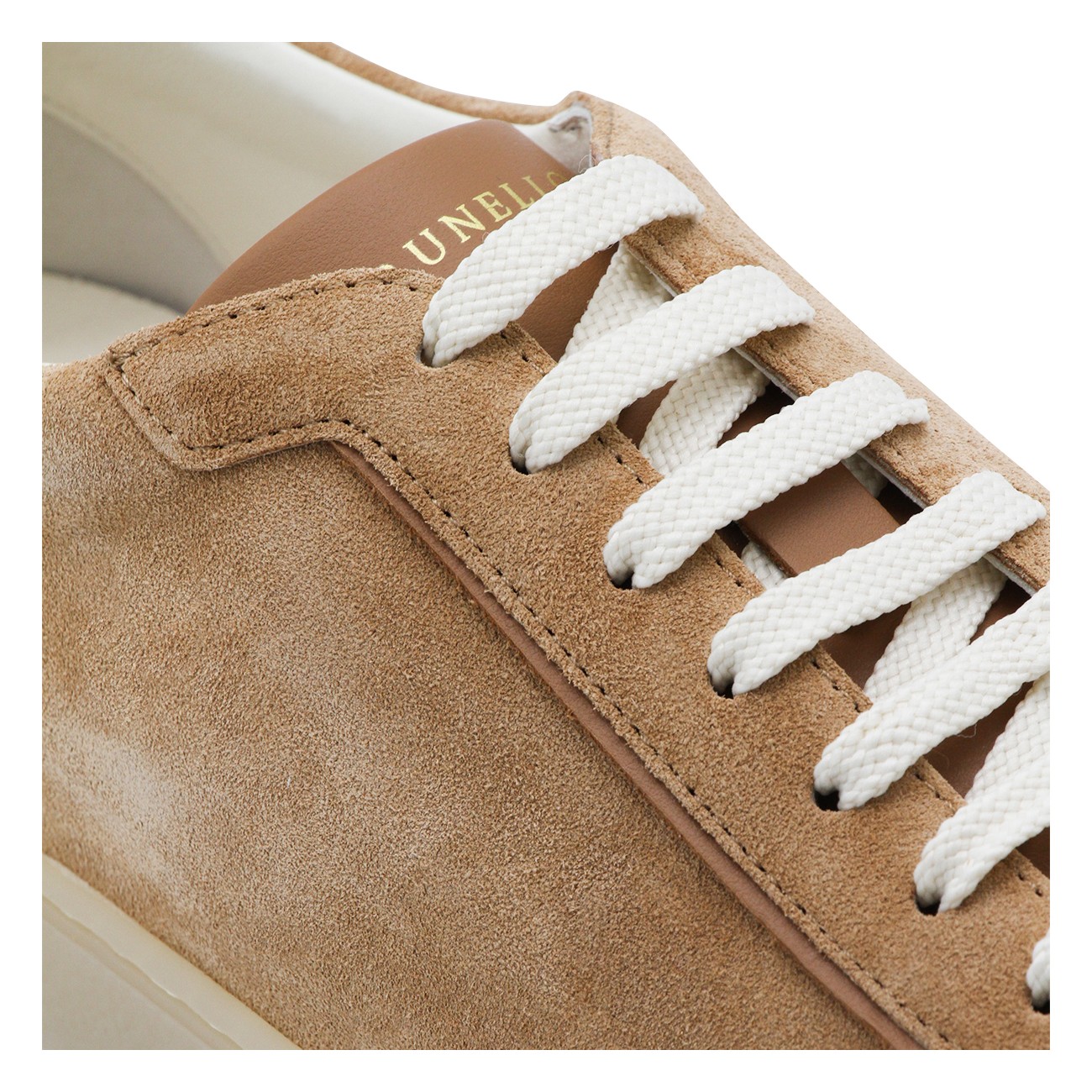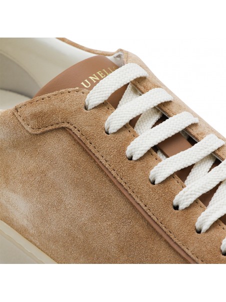 Beige leather sneakers from Brunello Cucinelli featuring round toe, lace up fastening, back logo and rubber sole.