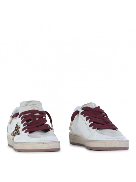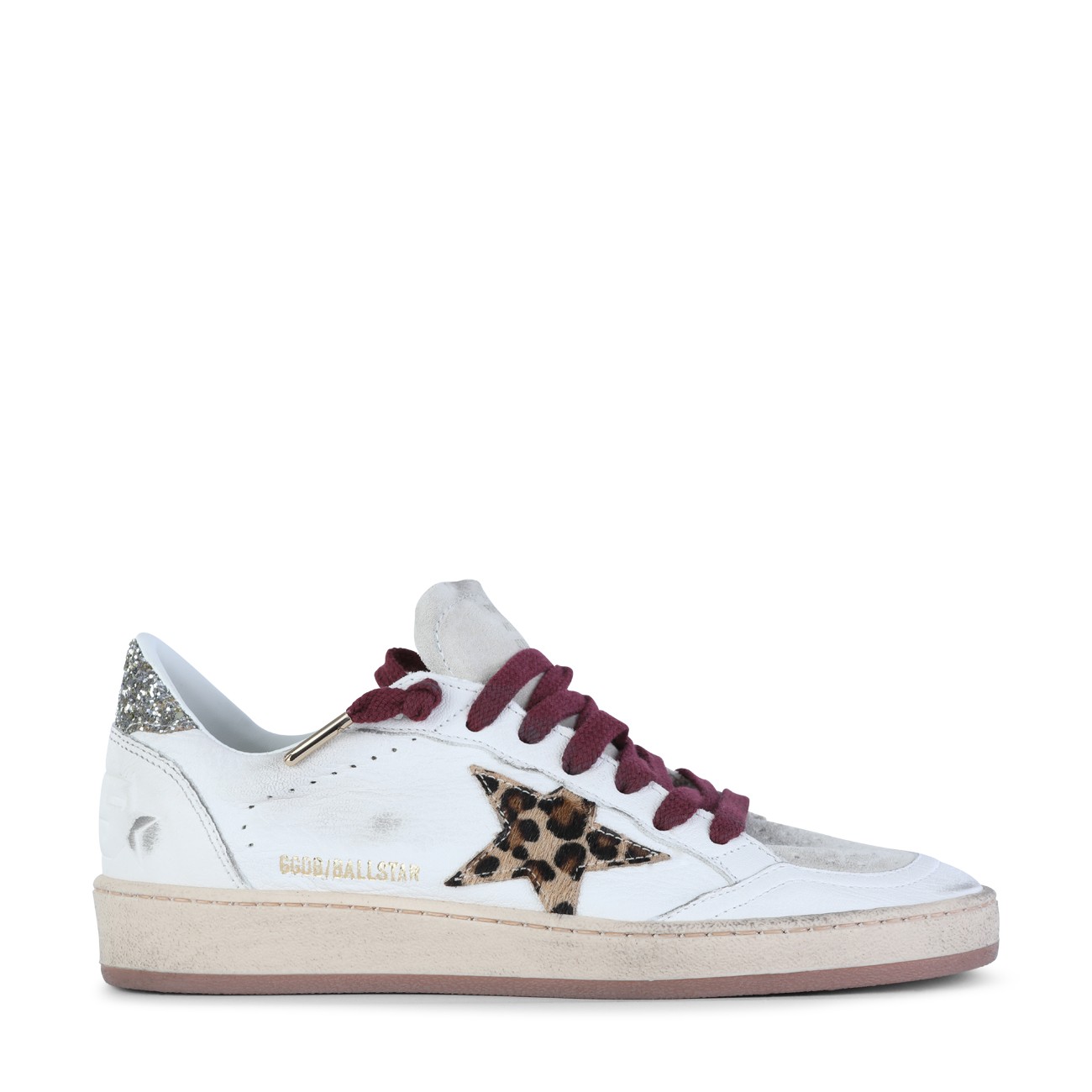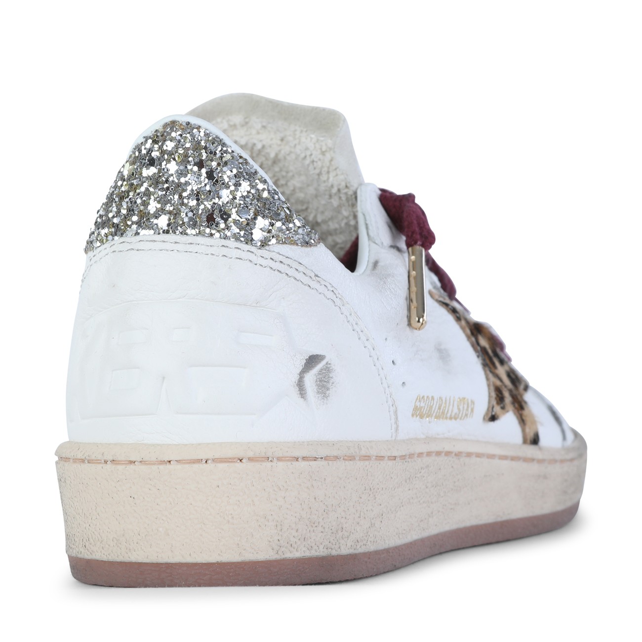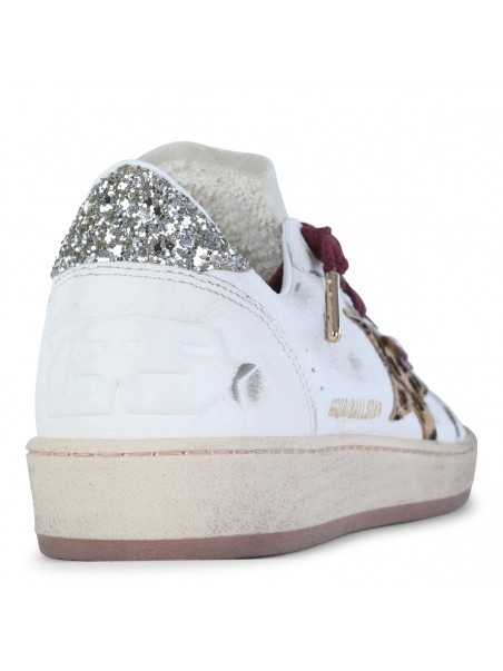 White and grey leather Super Star sneakers from Golden Goose featuring round toe, cotton laces fastening, stained effect, contrasting patch, rubber sole and branded insole.