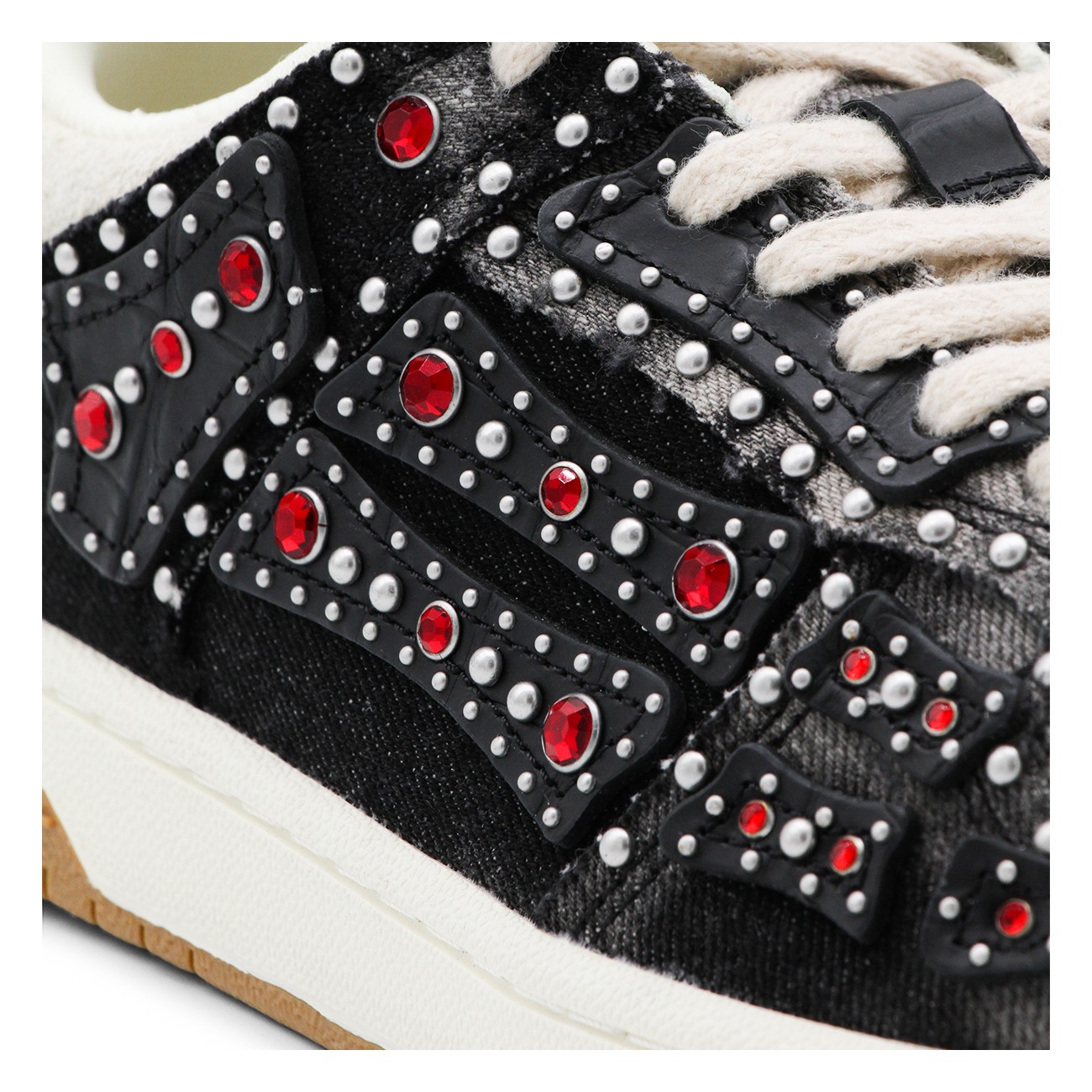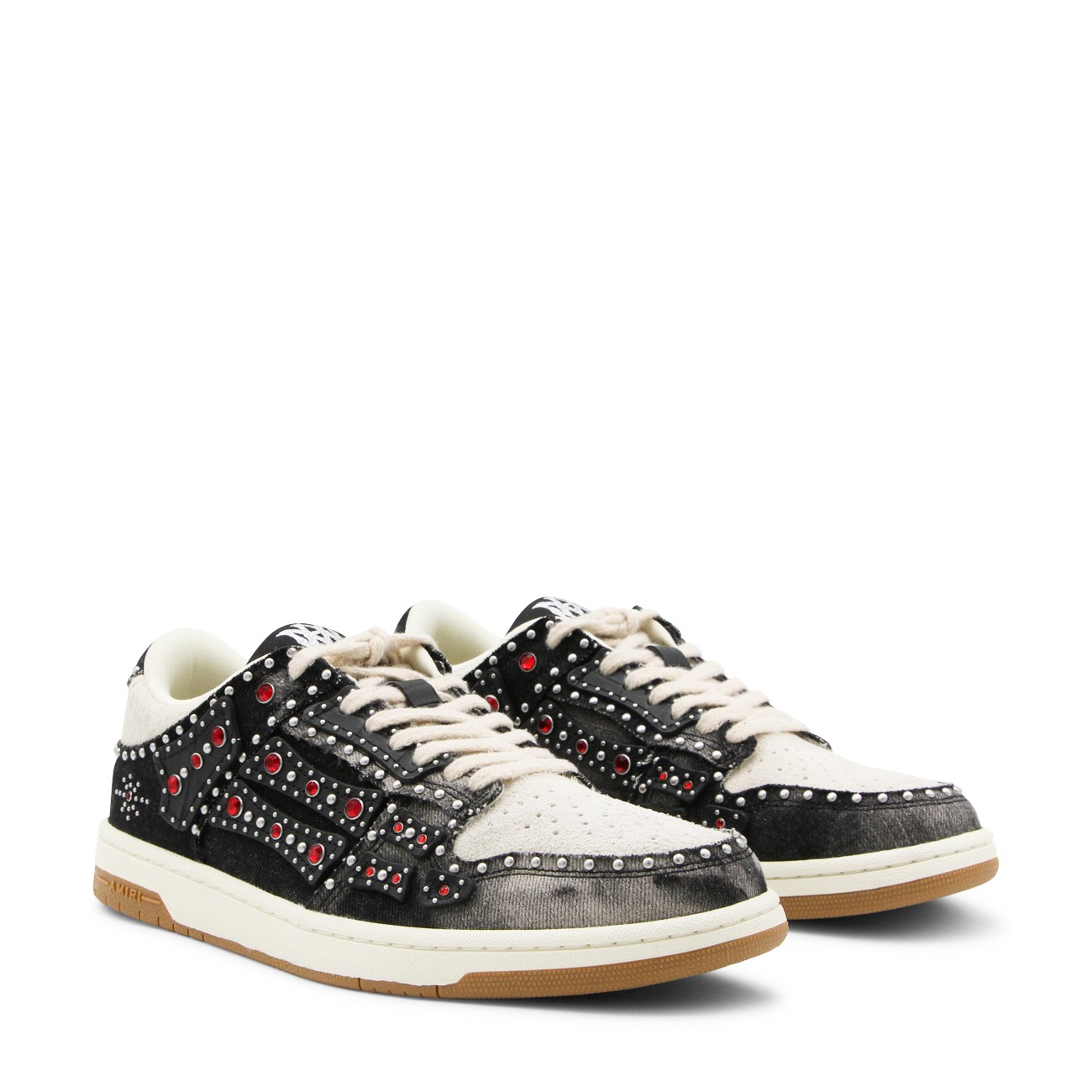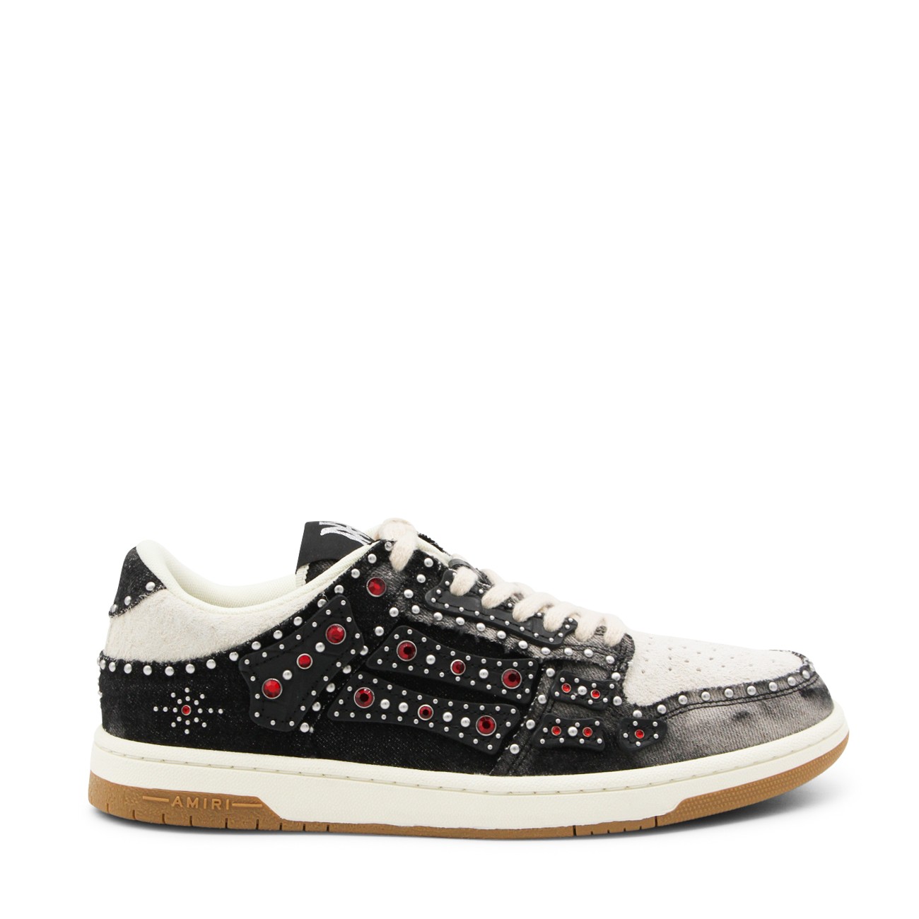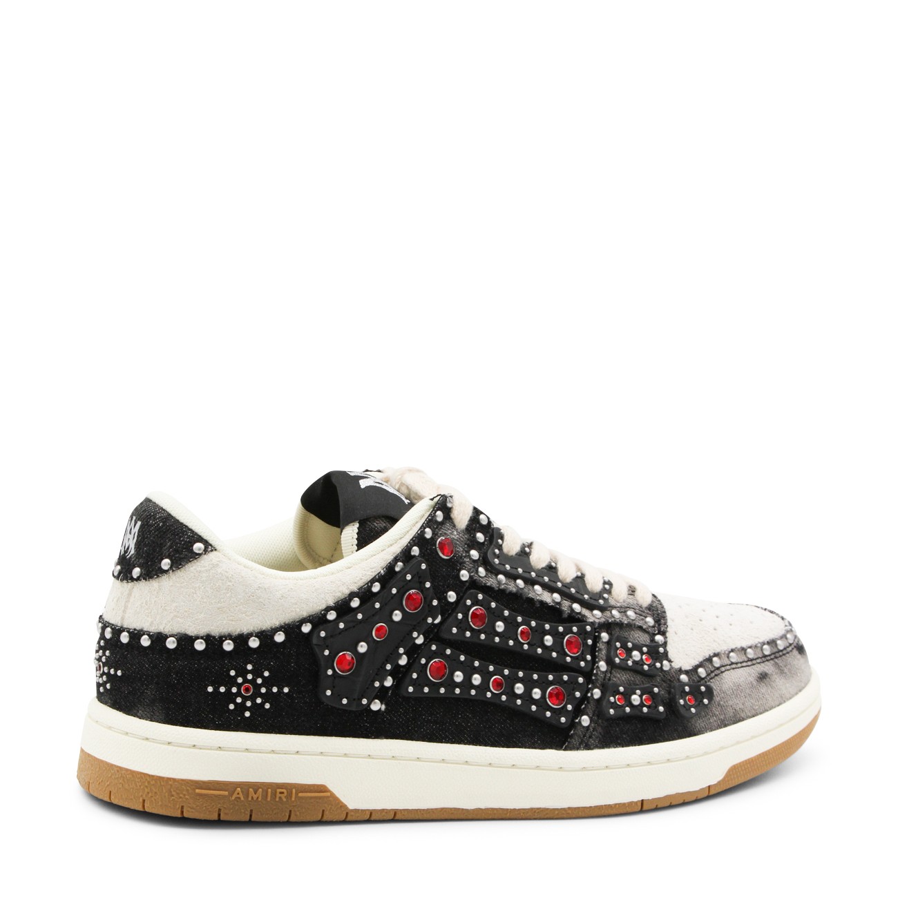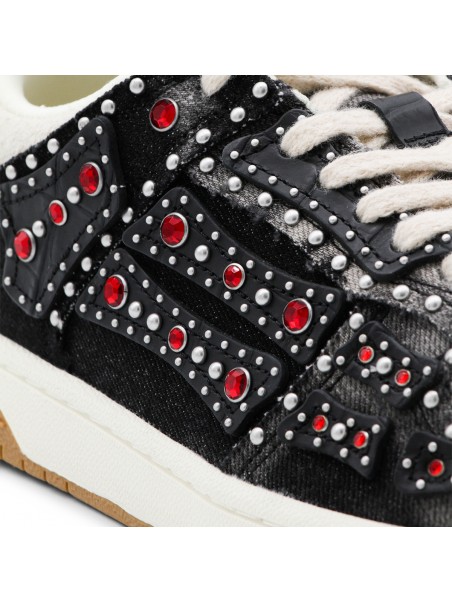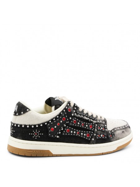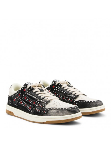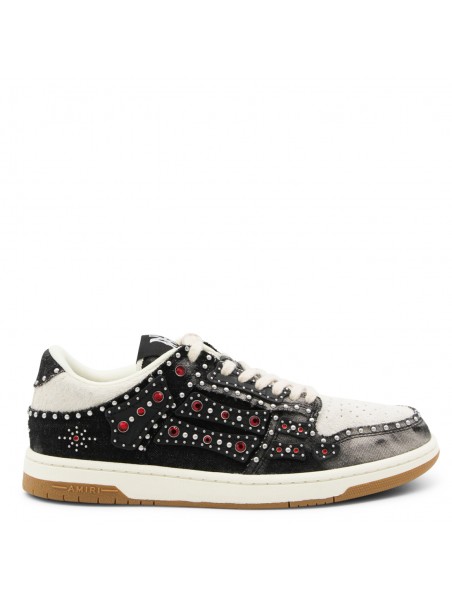 Black sneakers from Amiri featuring round toe, lace up fastening, all over studs details and rubber sole.