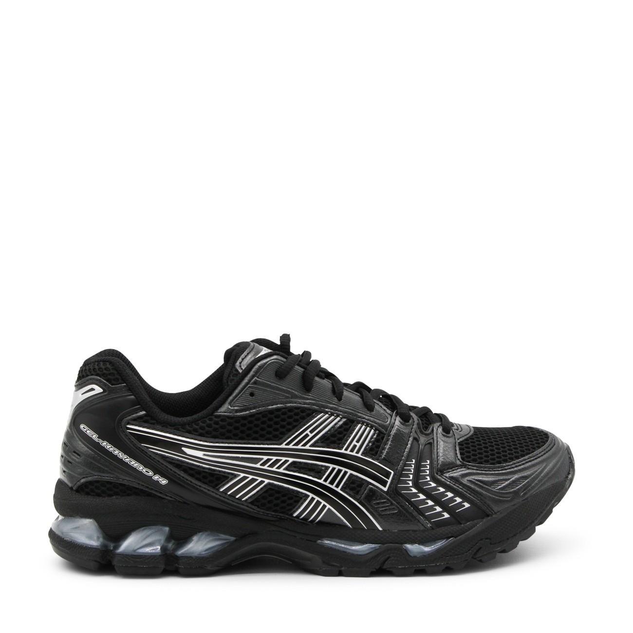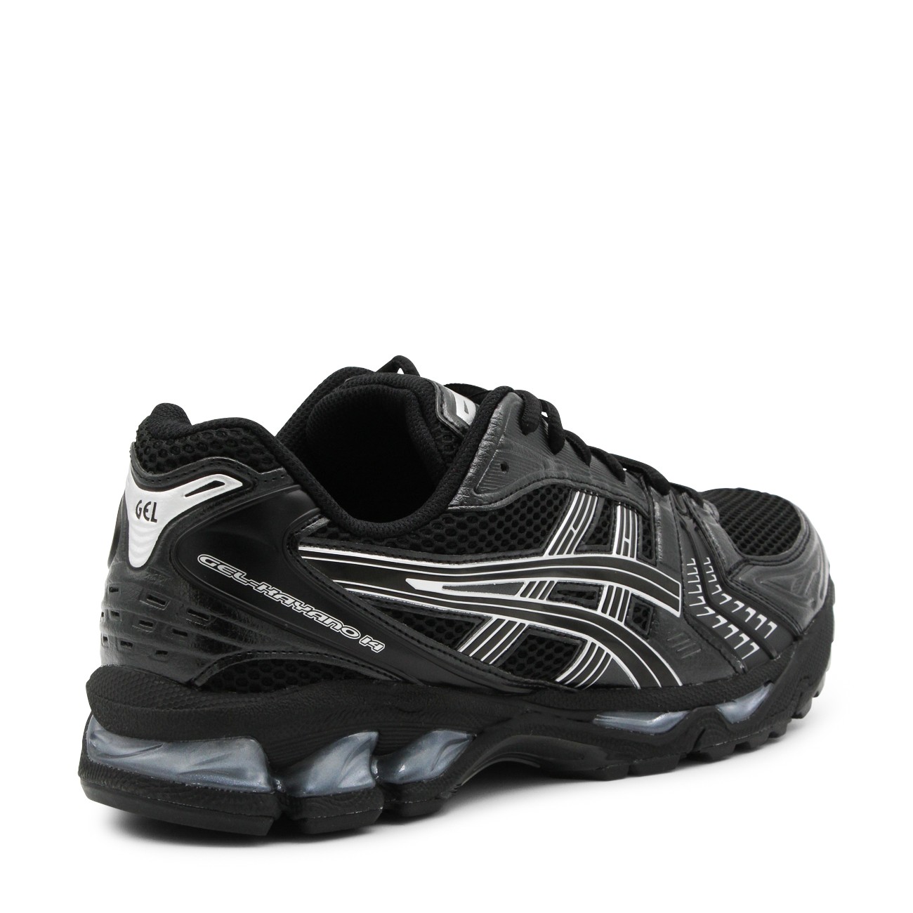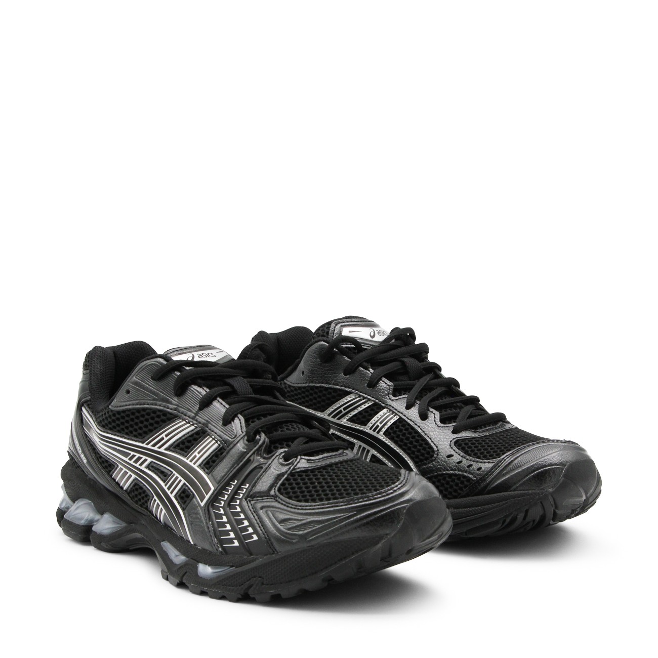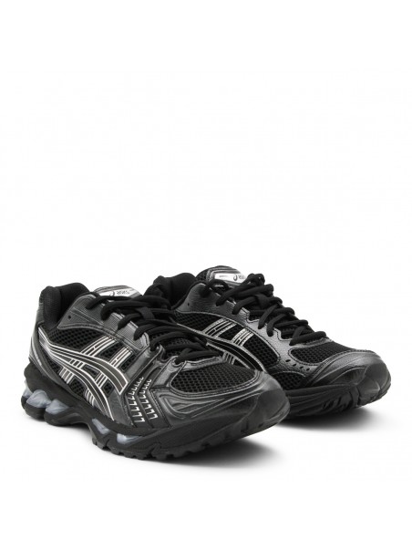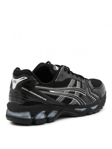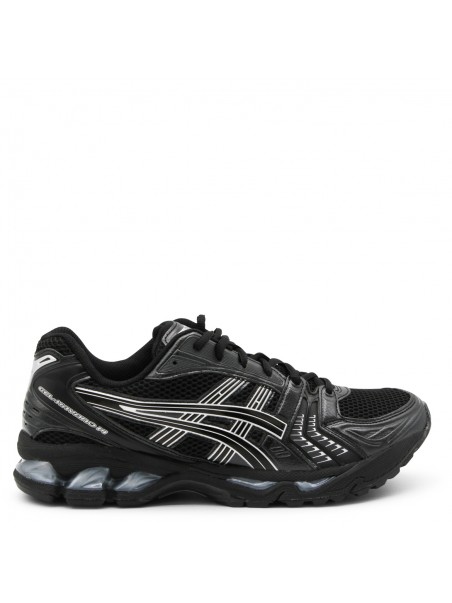 Black sneakers from Asics featuring round toe, lace up fastening, all over silver tone details and rubber sole.