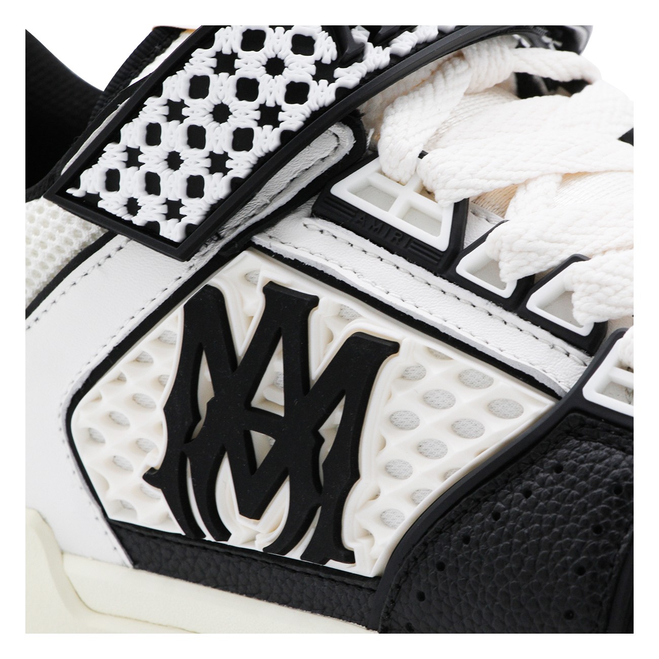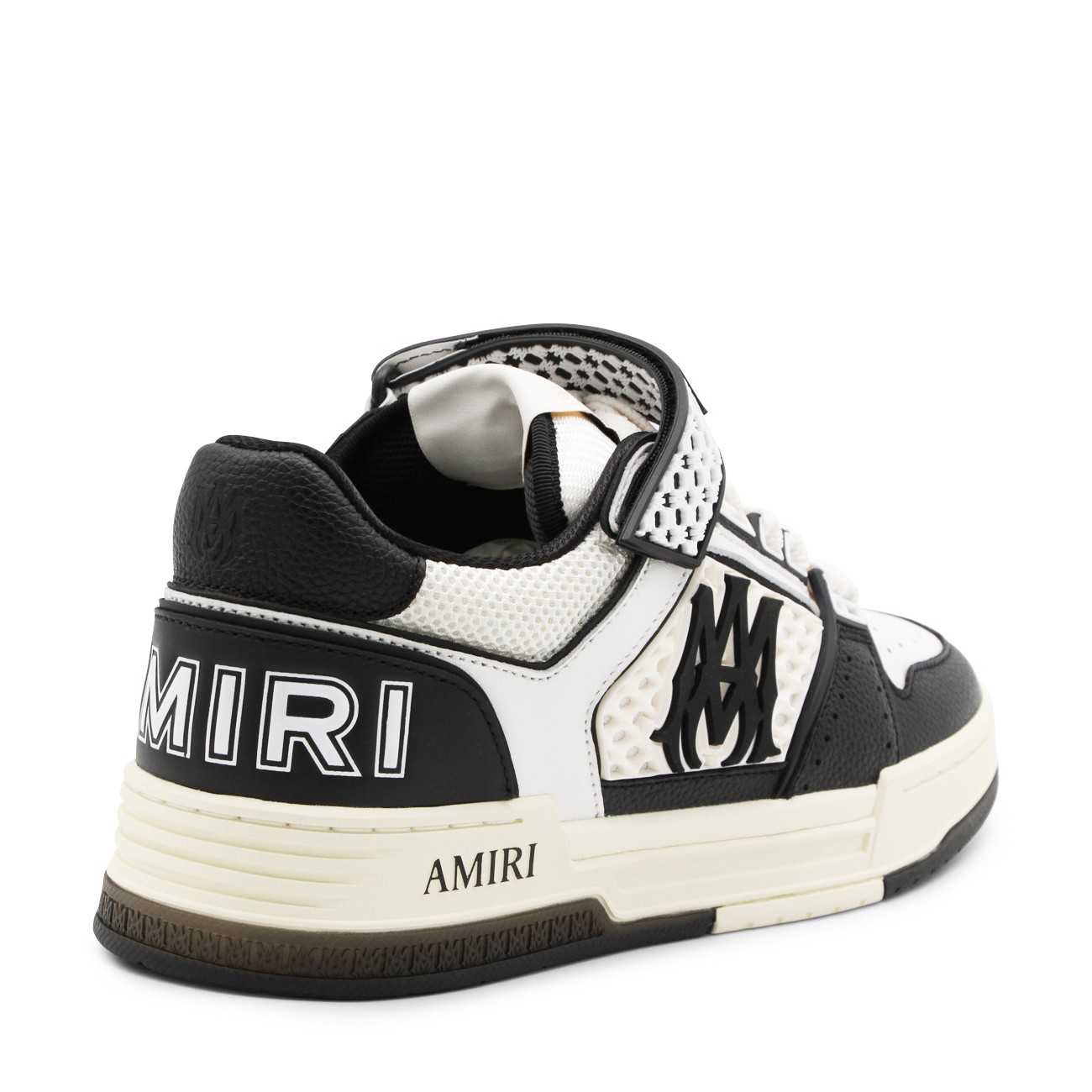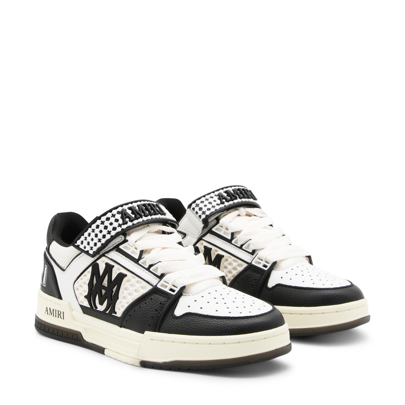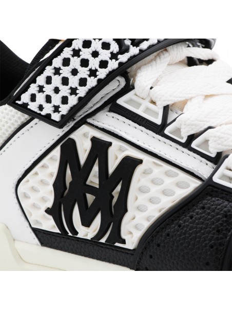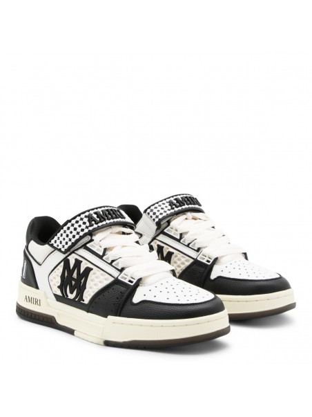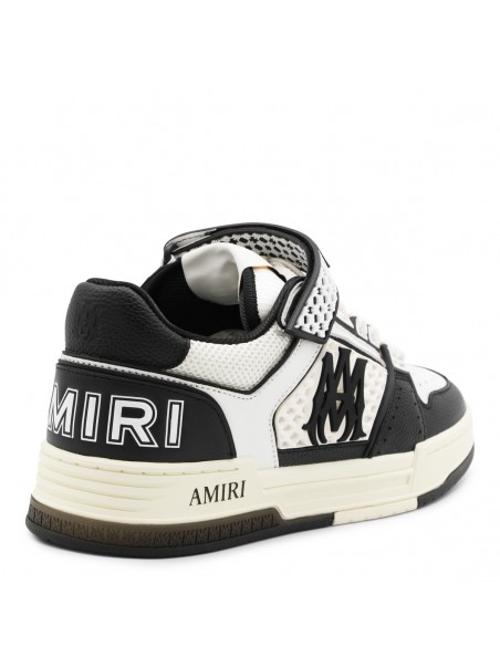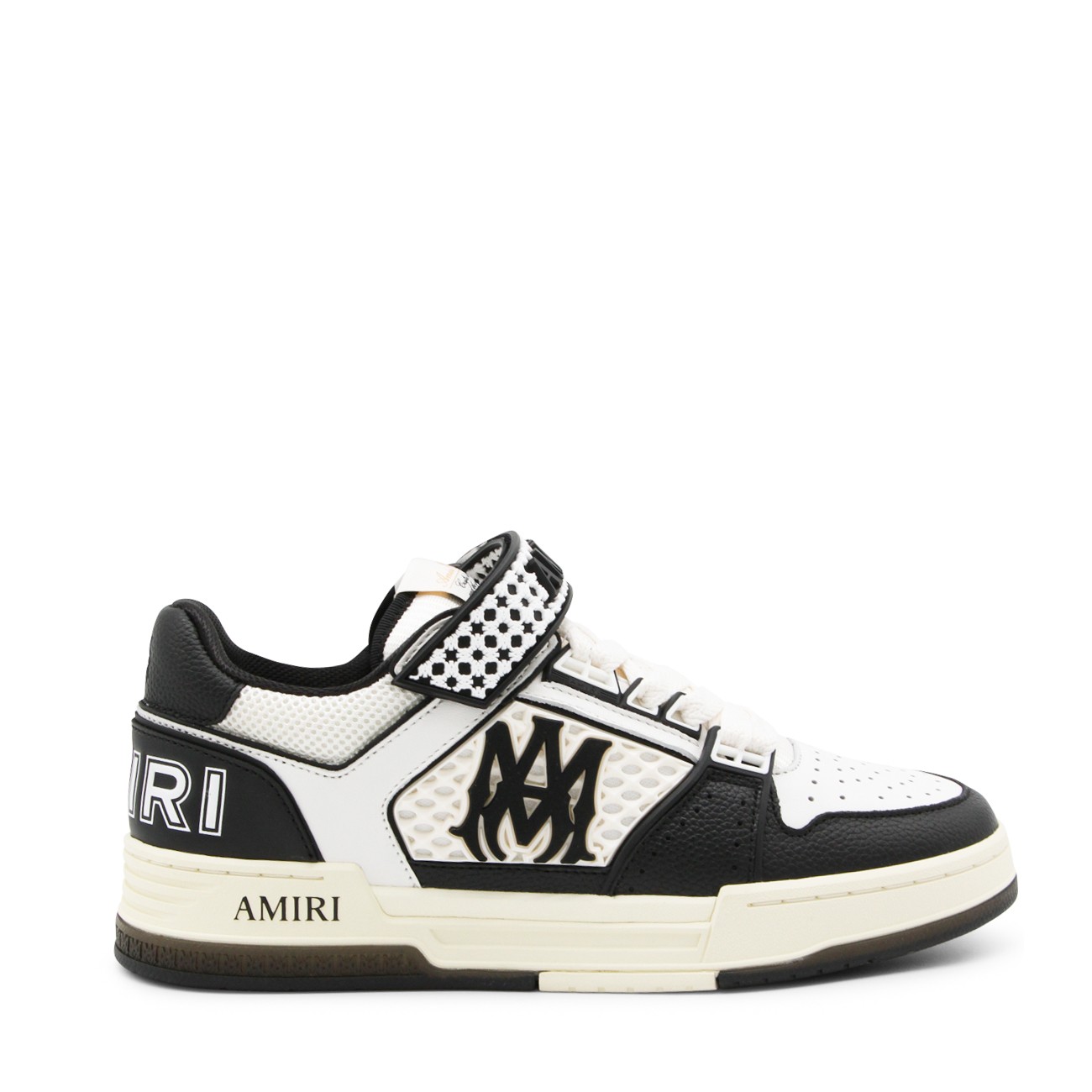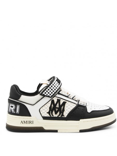 Black leather sneakers from Amiri featuring round toe, lace up fastening, strap closure, lateral logo, white details and rubber sole.