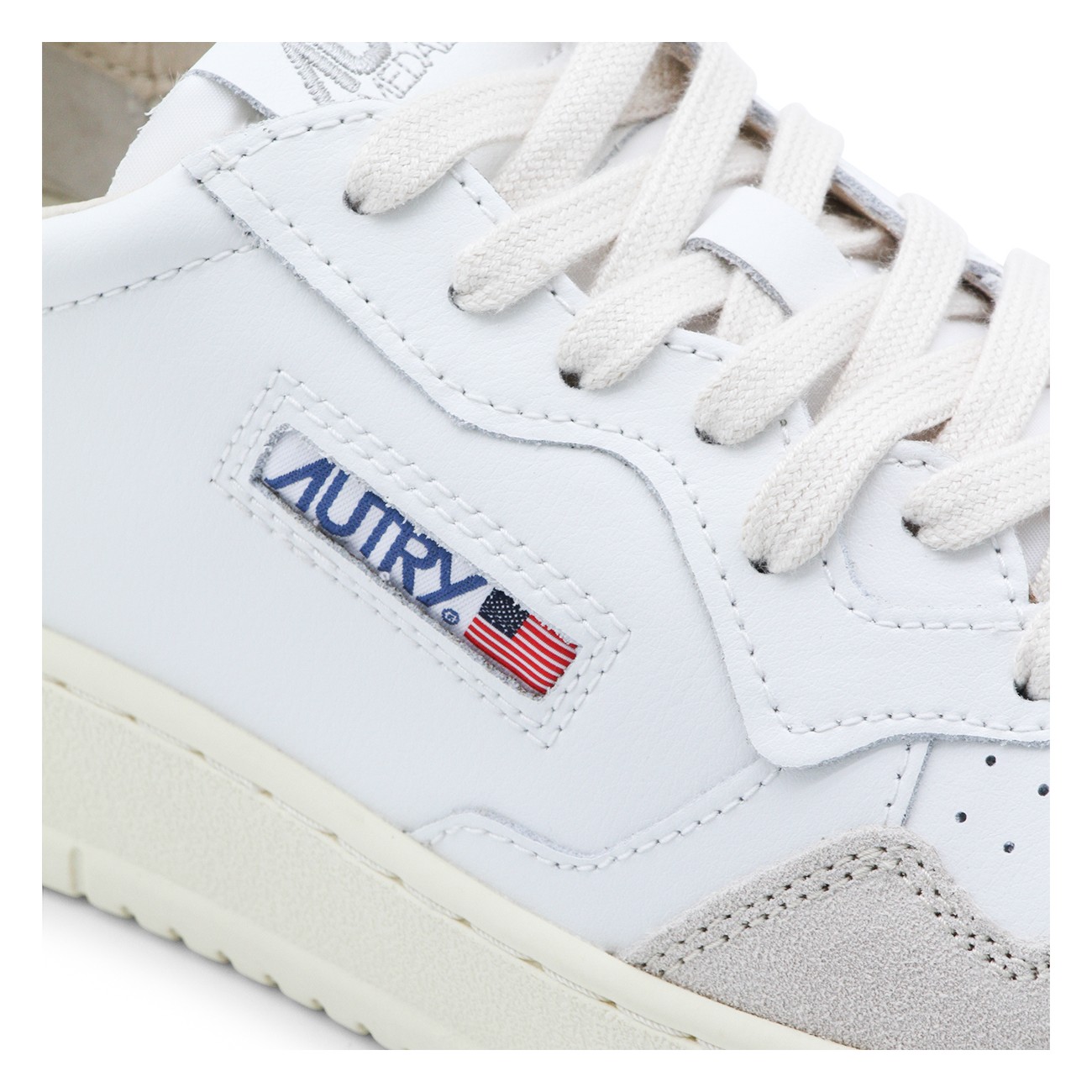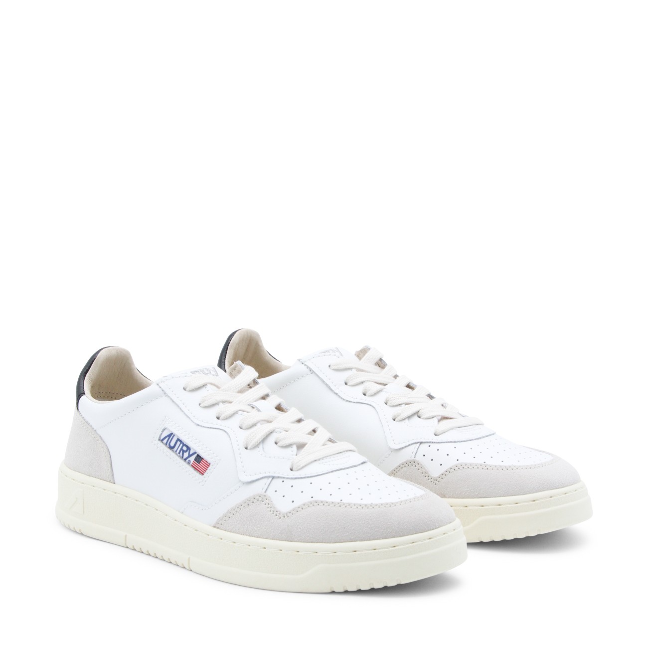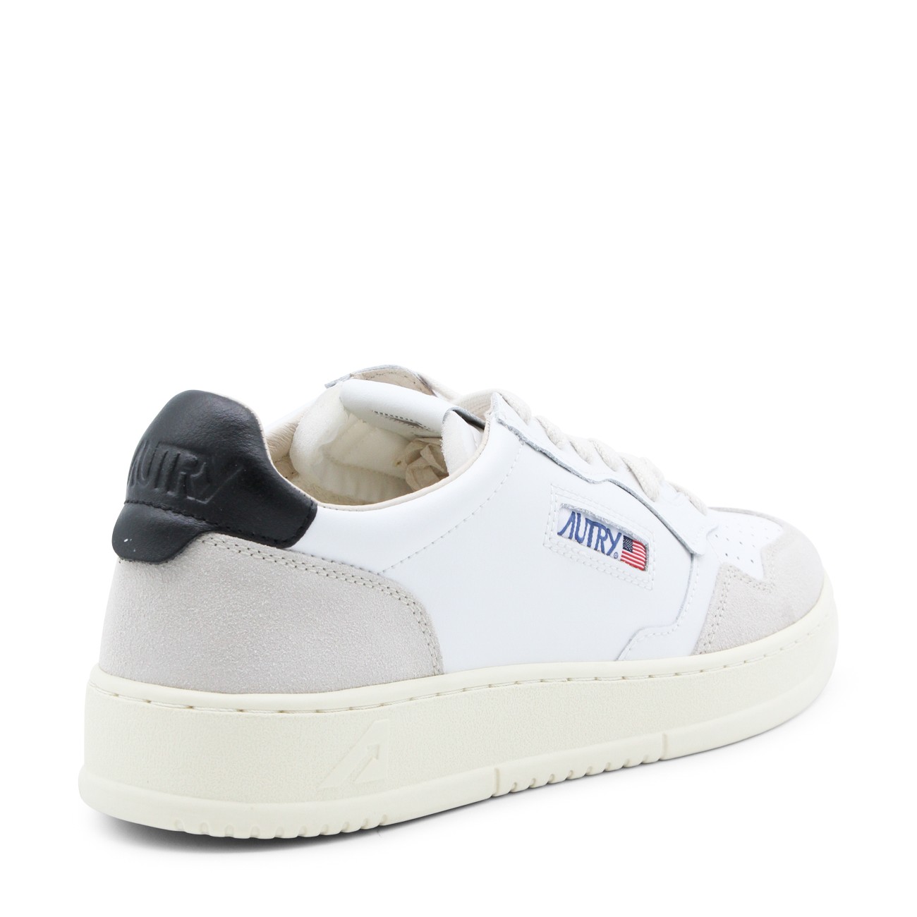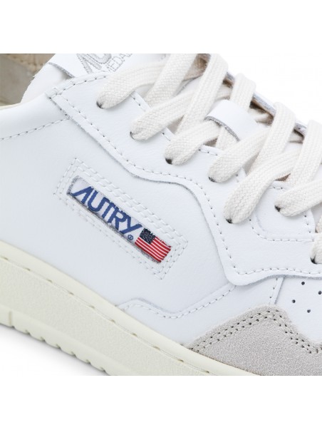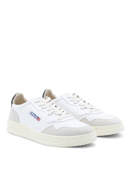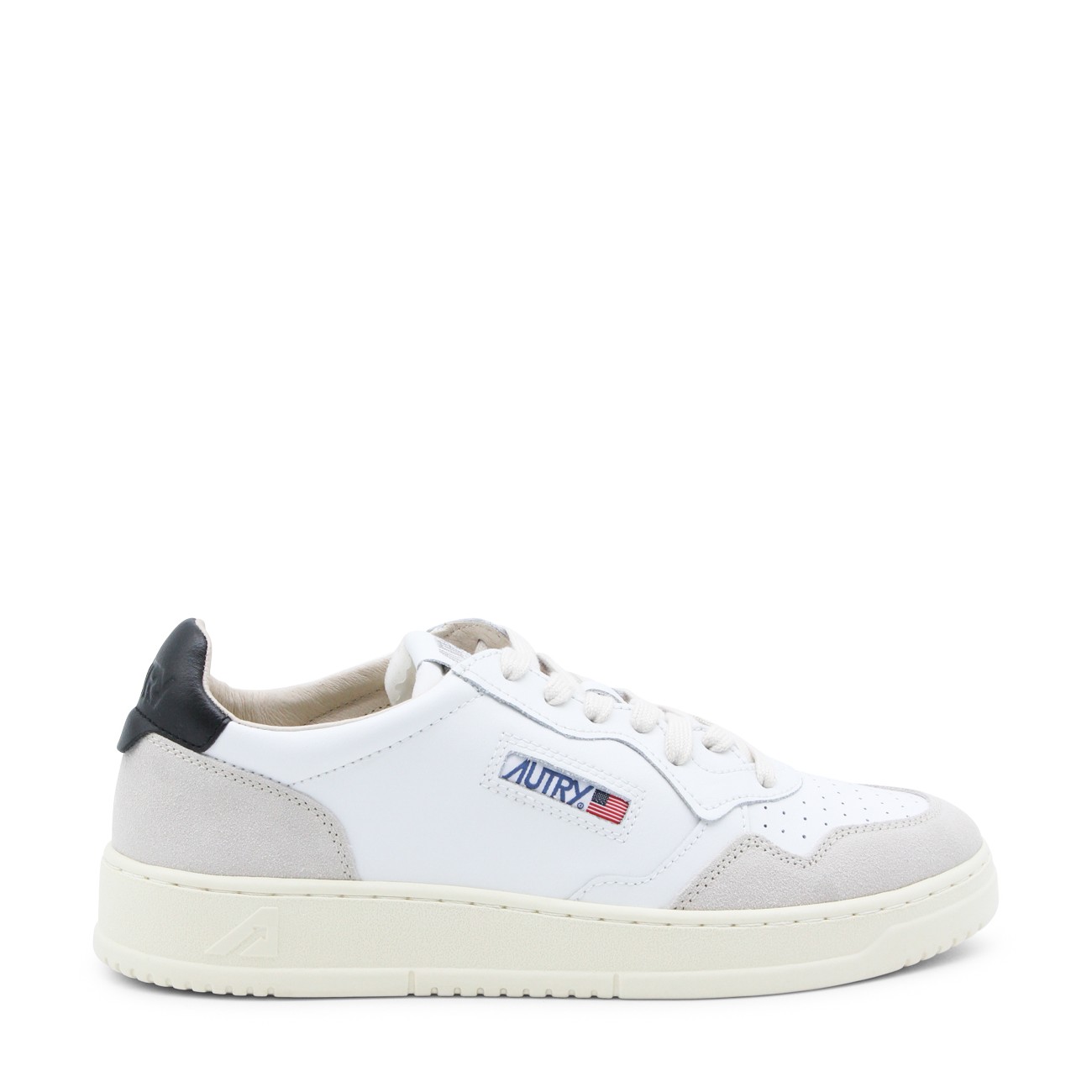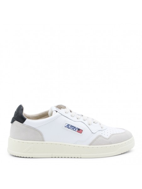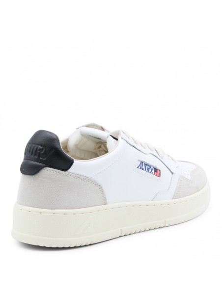 White and black leather sneakers from Autry featuring round toe, lace-up fastening, lateral logo, back detail and flat rubber sole.