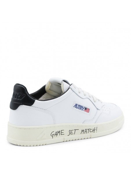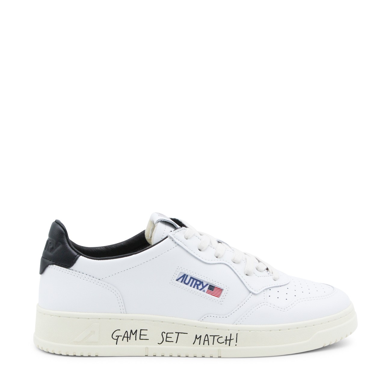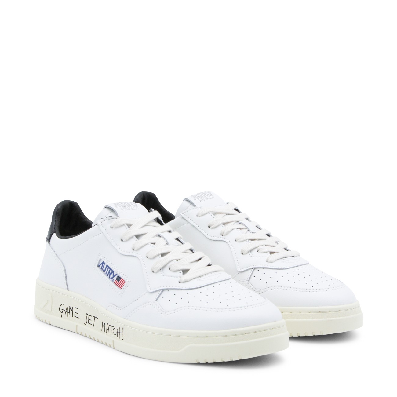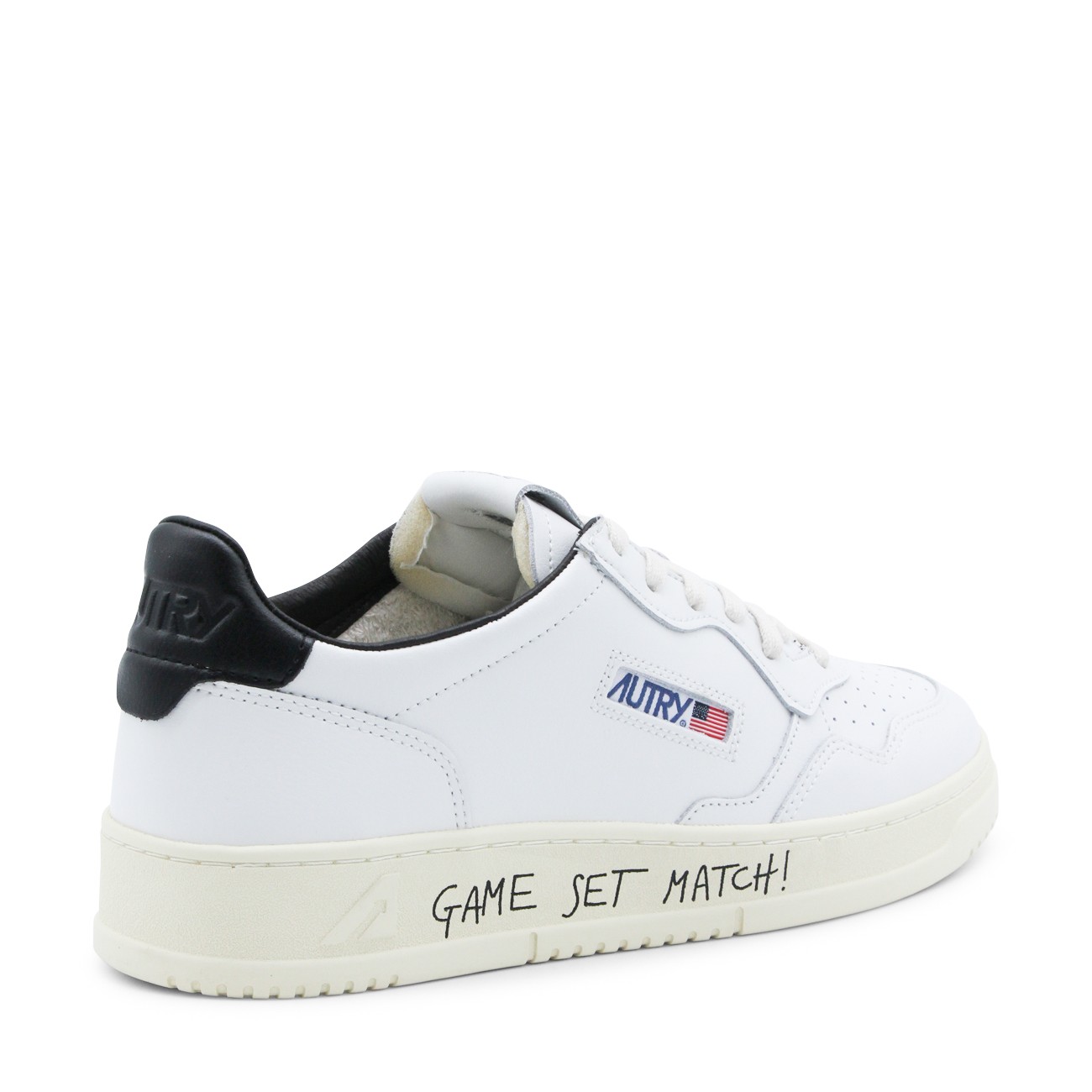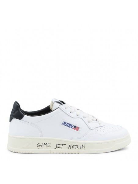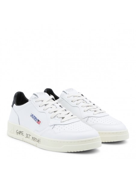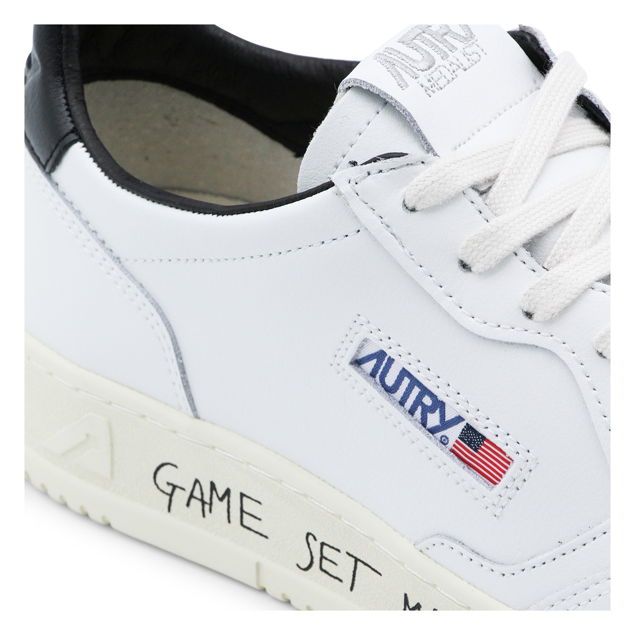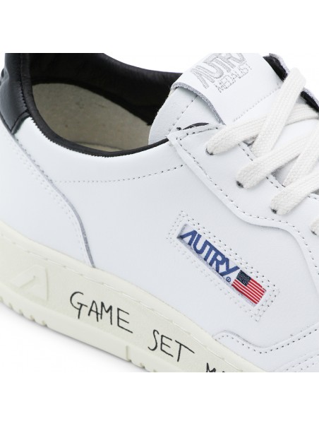 White and black leather sneakers from Autry featuring round toe, front lace-up fastening, side logo print, panelled design, sole detail and flat rubber sole.