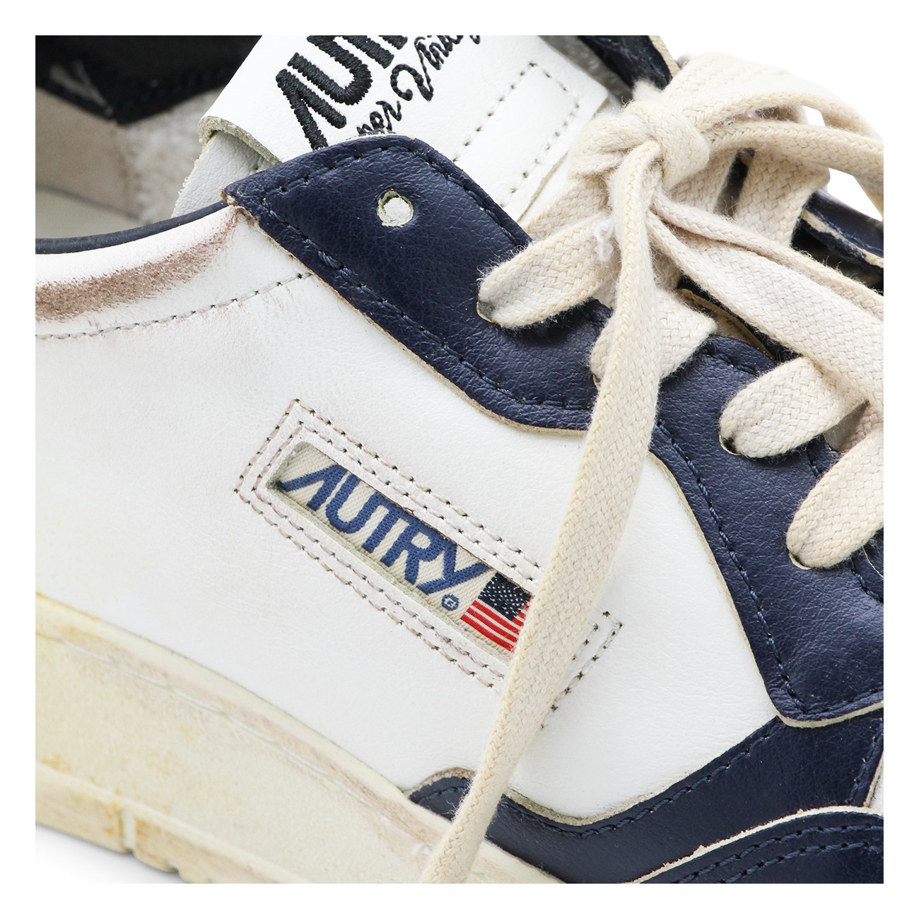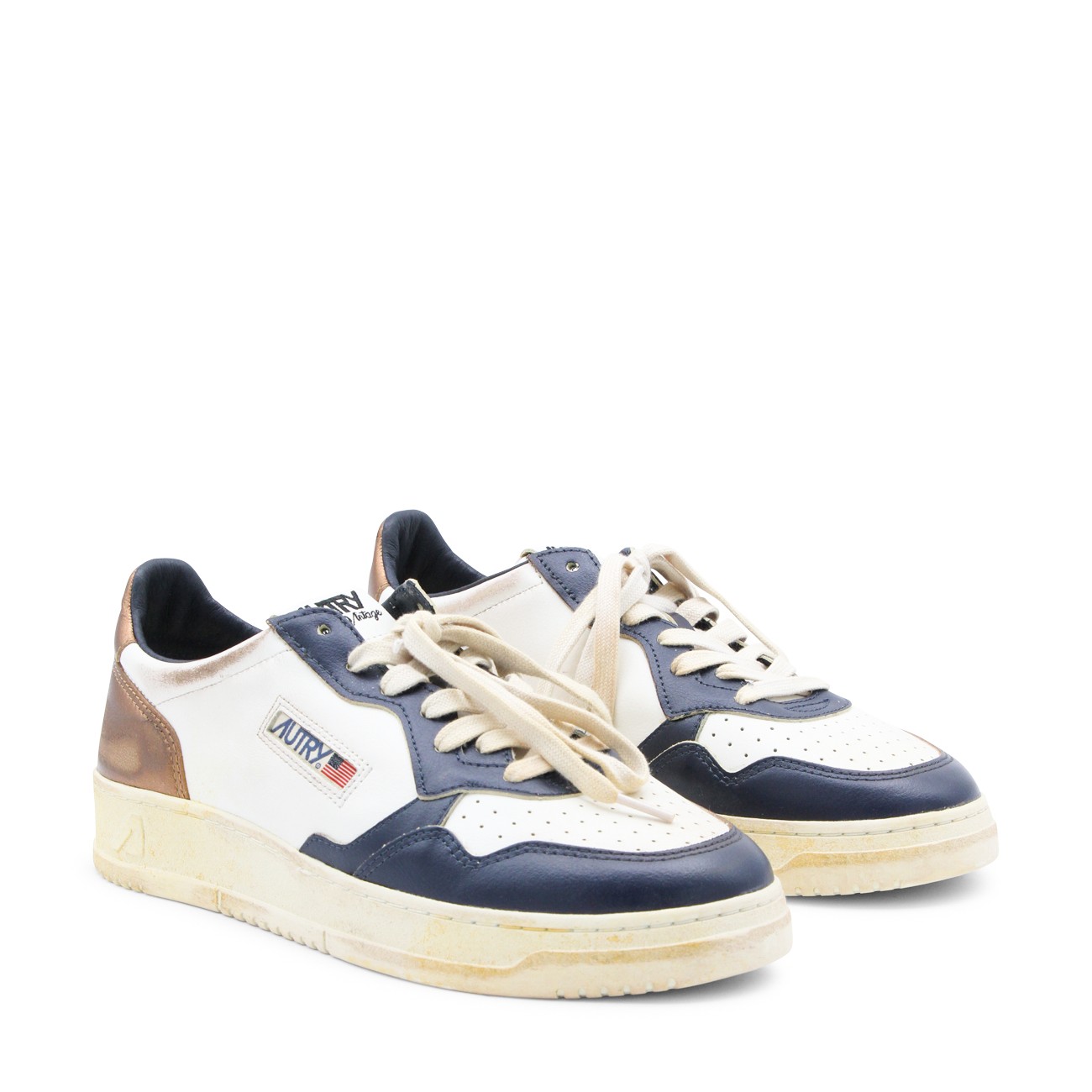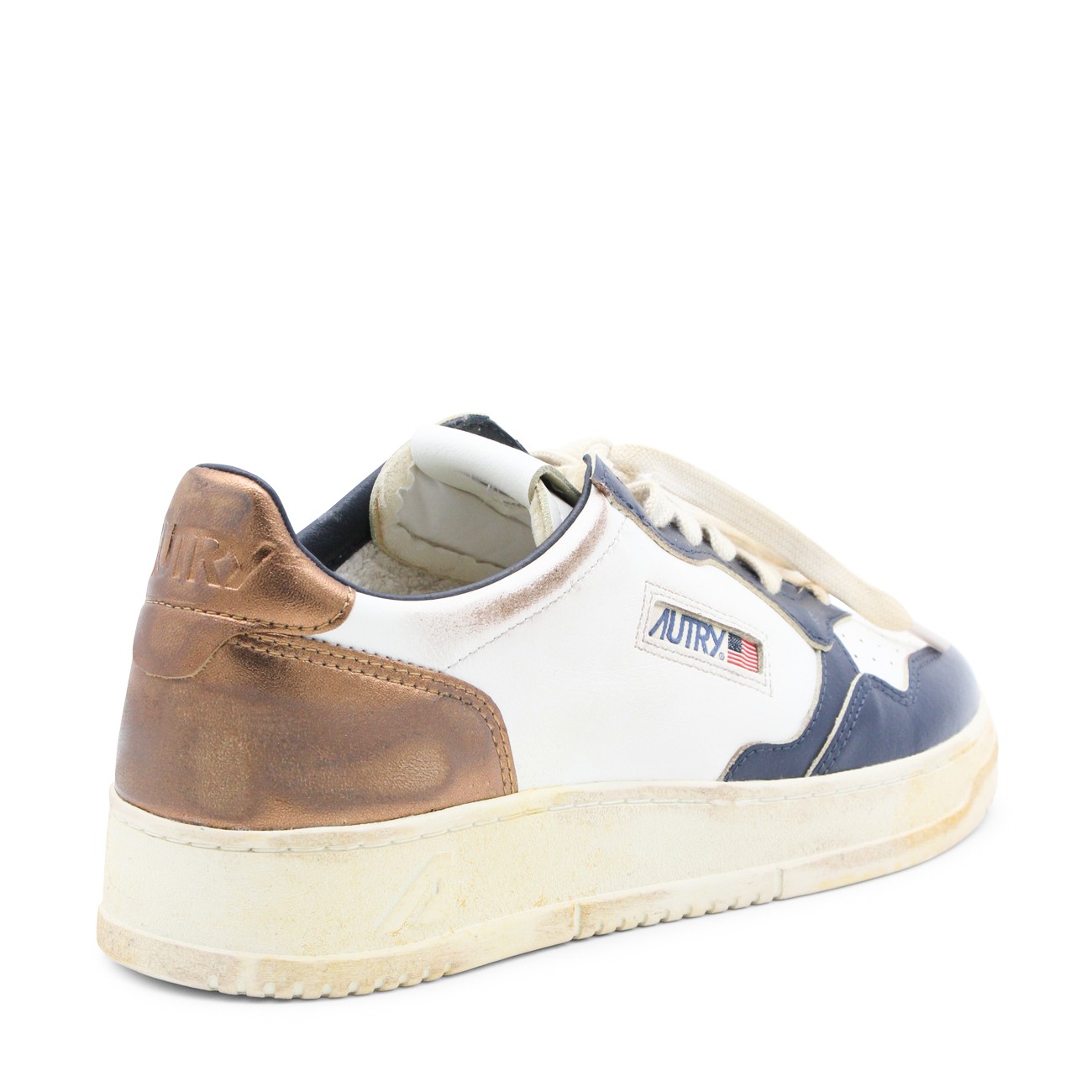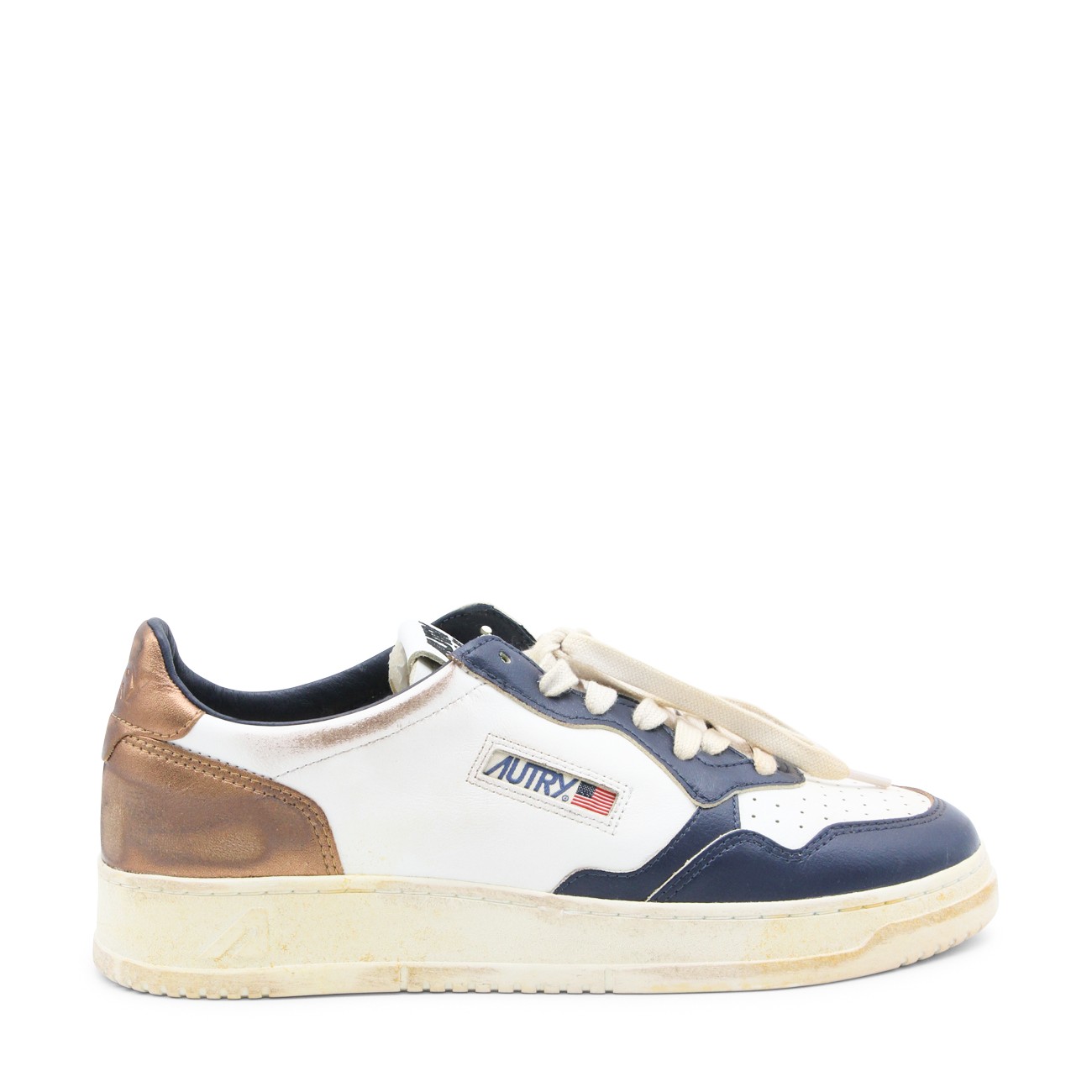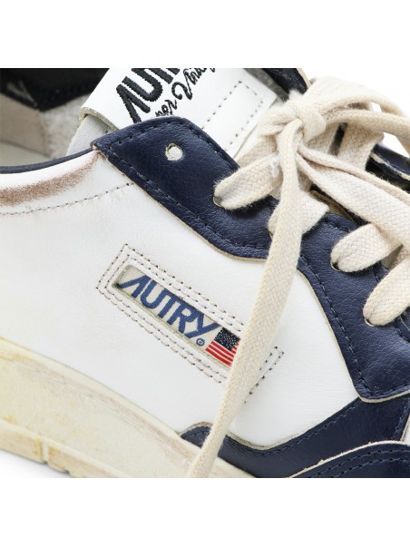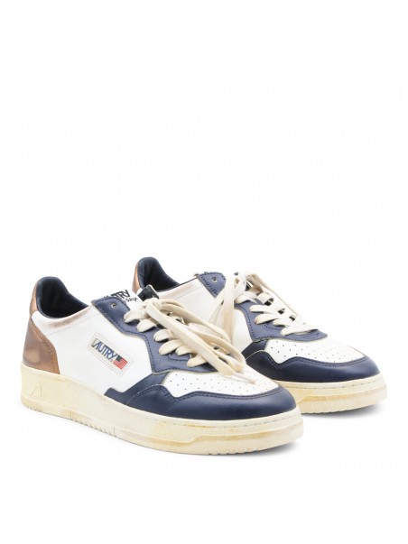 White and blue leather Medalist sneakers from Autry featuring panelled design, logo patch to the side, logo patch at the tongue, branded heel counter, branded insole, perforated toebox, round toe, front lace-up fastening and flat rubber sole.