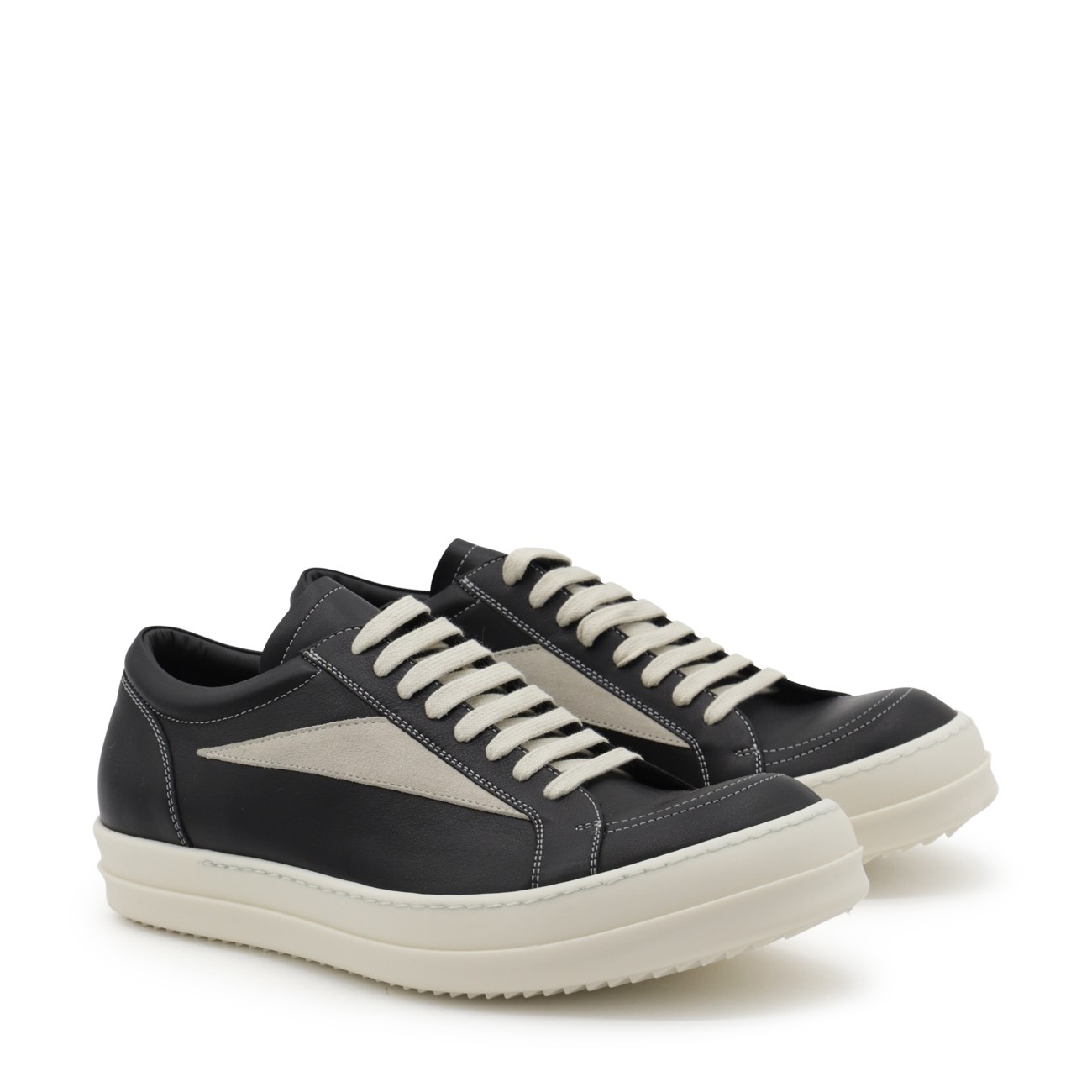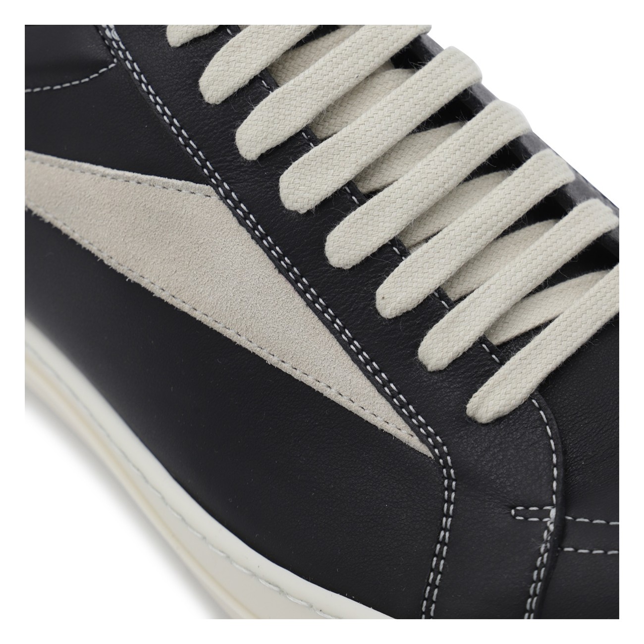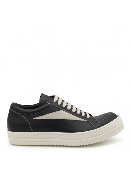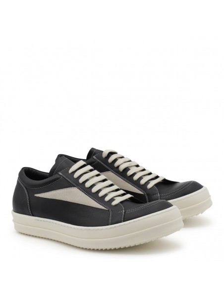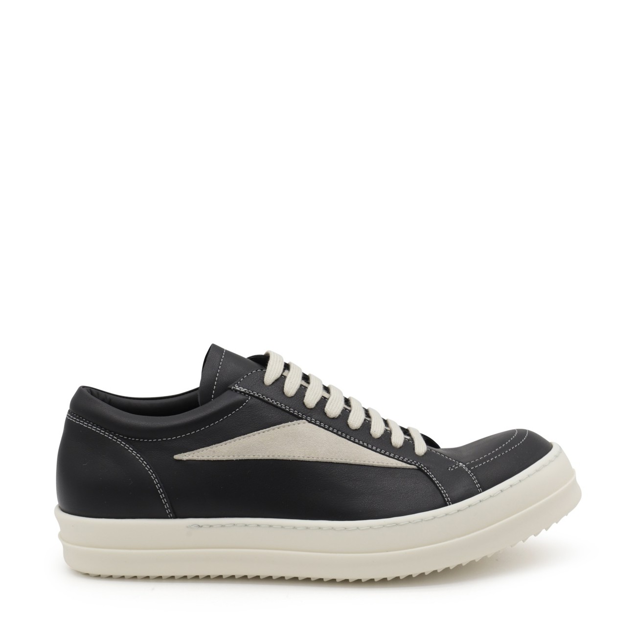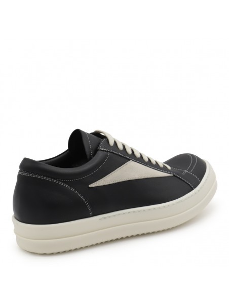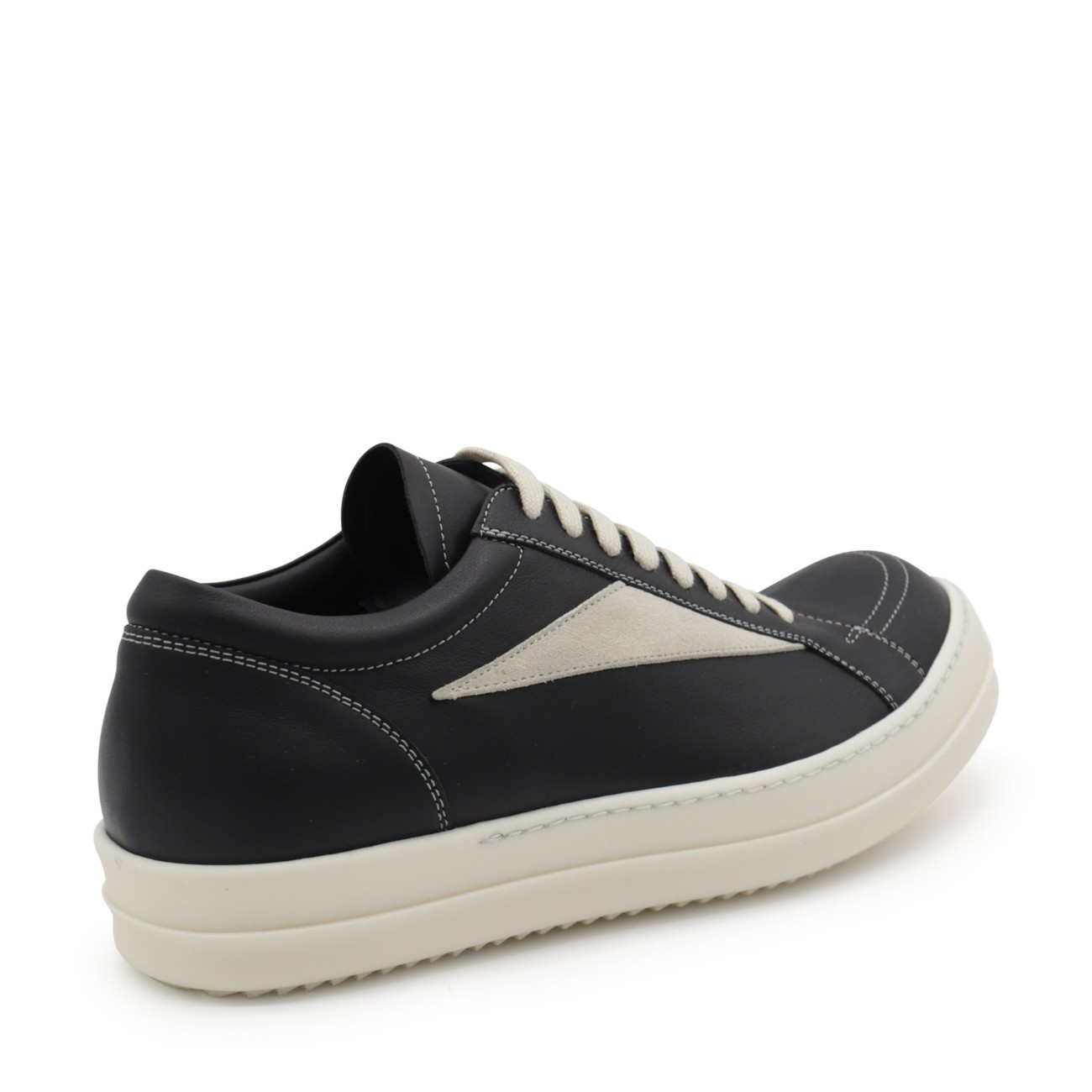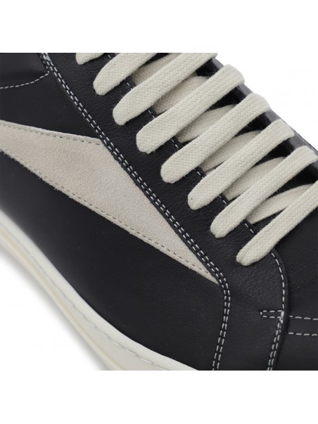 Black and white leather sneakers from Rick Owens featuring round toe, cotton lace-up fastening, white lateral detail and rubber sole.