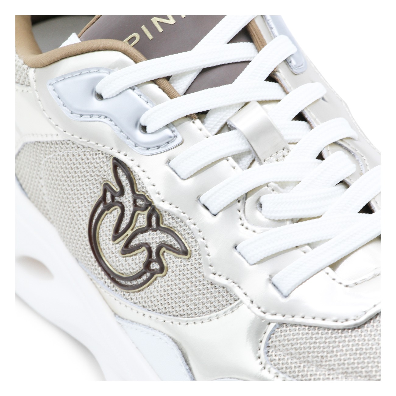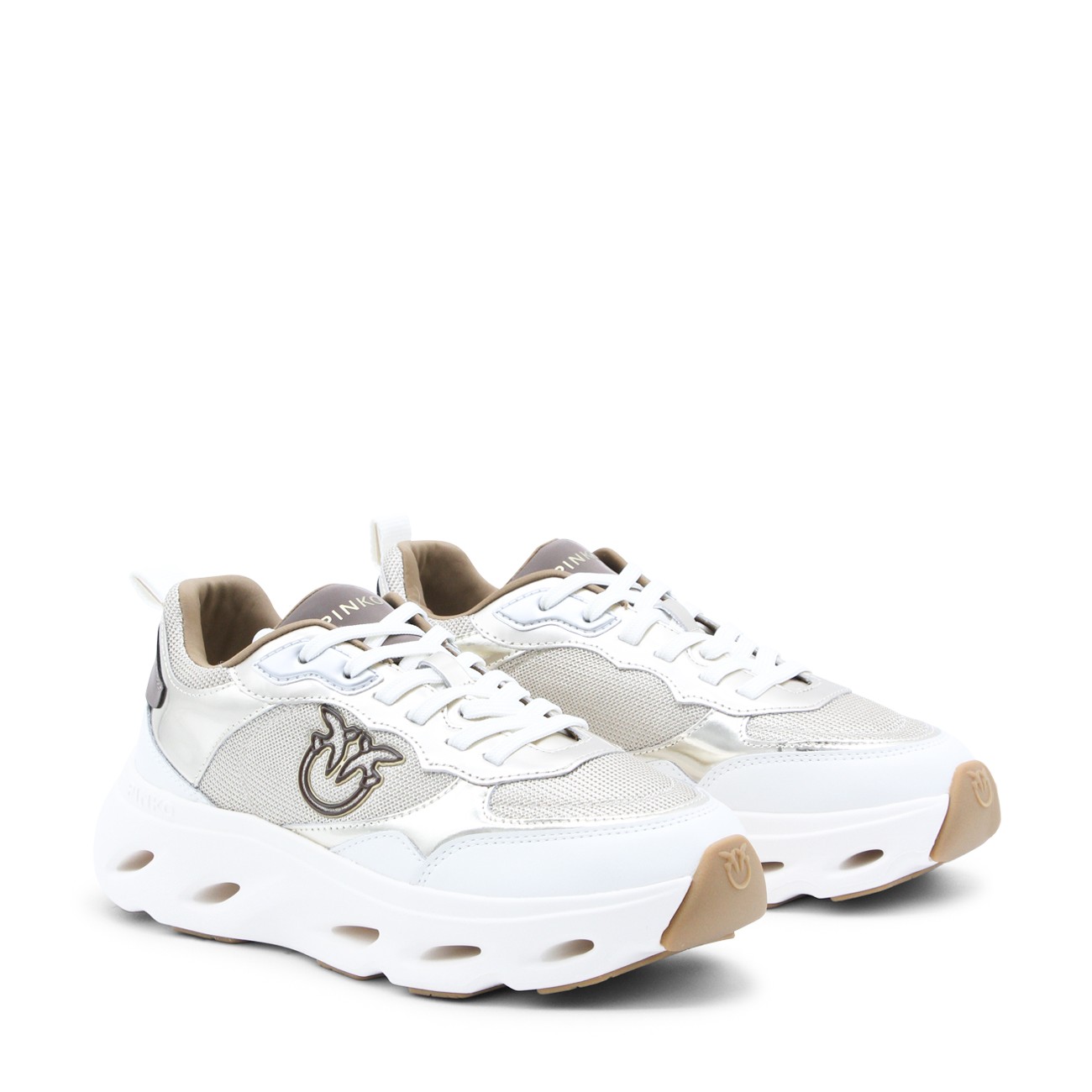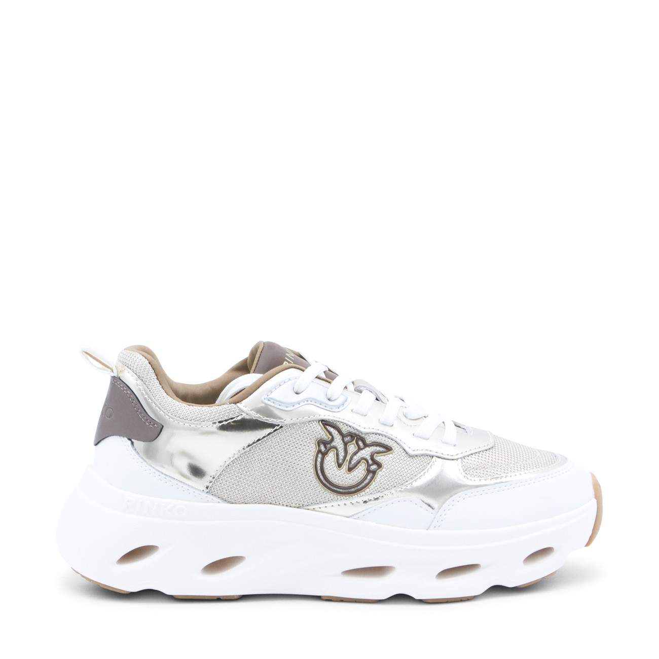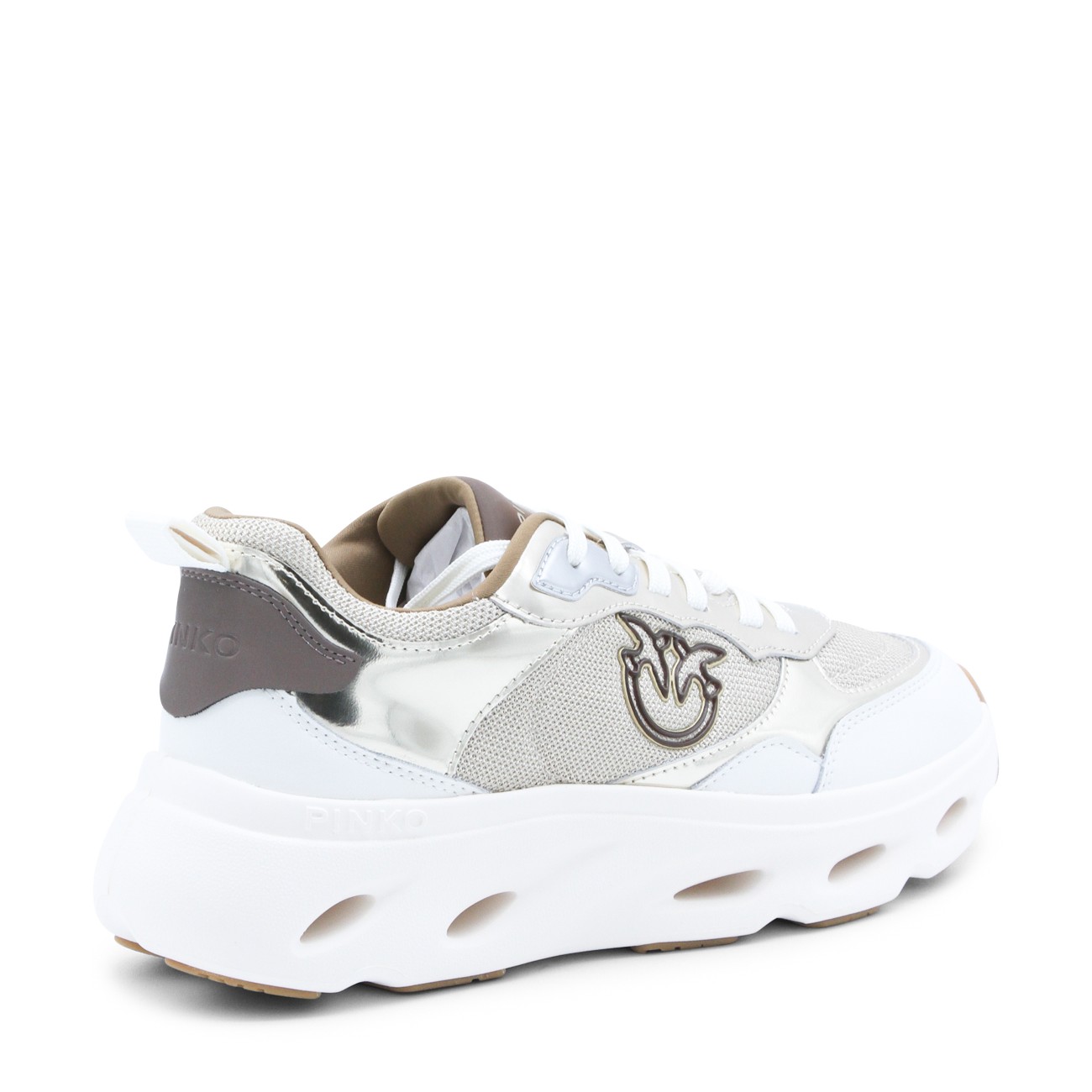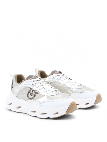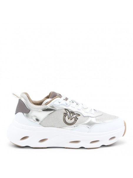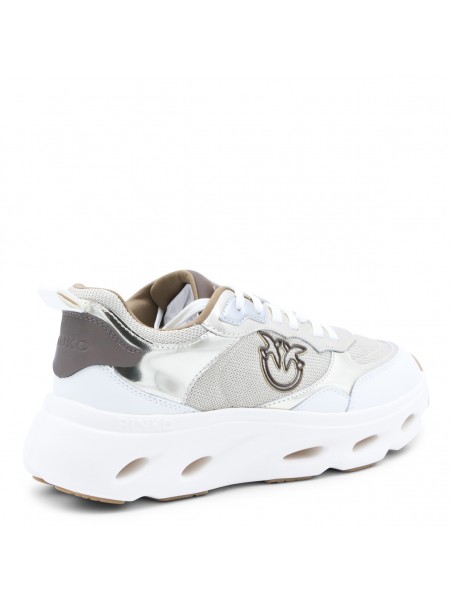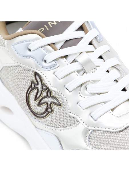 Platinum leather Pink 09 sneakers from Pinko featuring round toe, cotton lace-up fastening, contrasting inserts, logo on the tongue, lateral embossed logo and rubber sole.