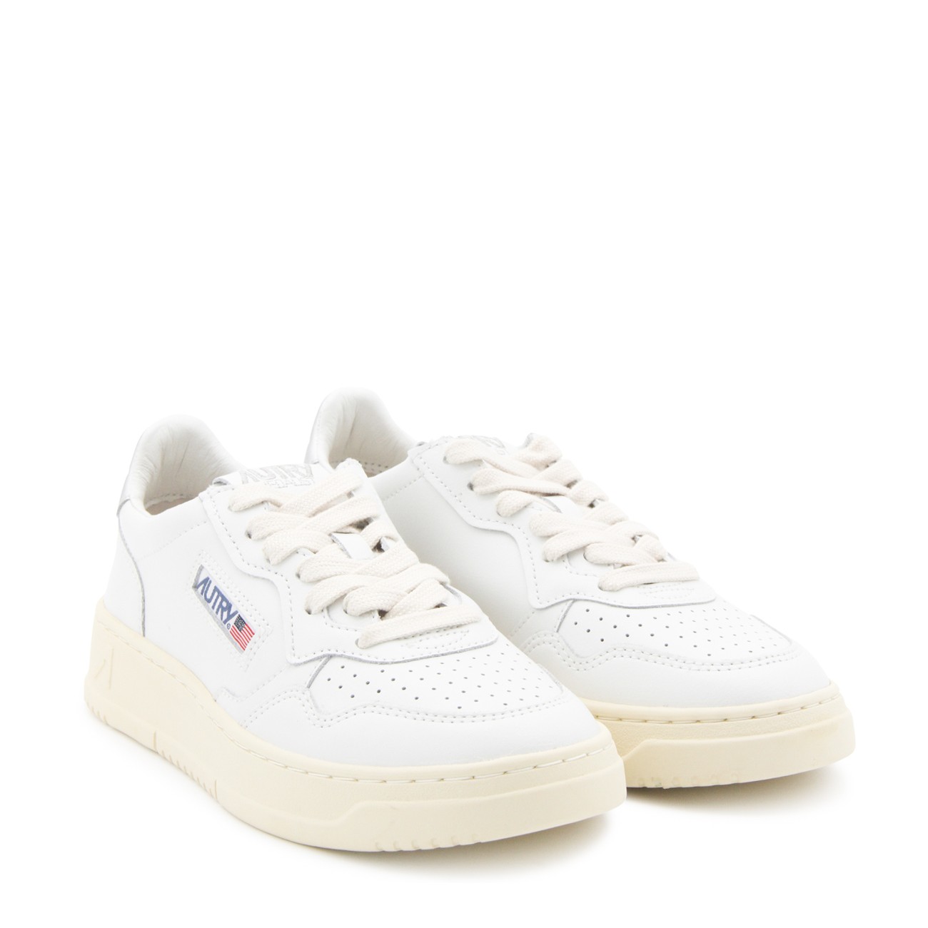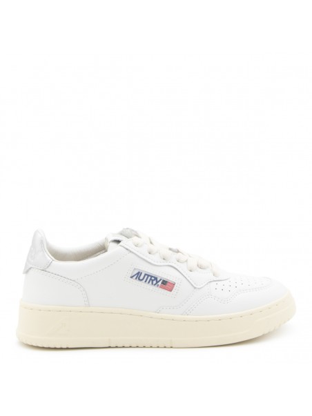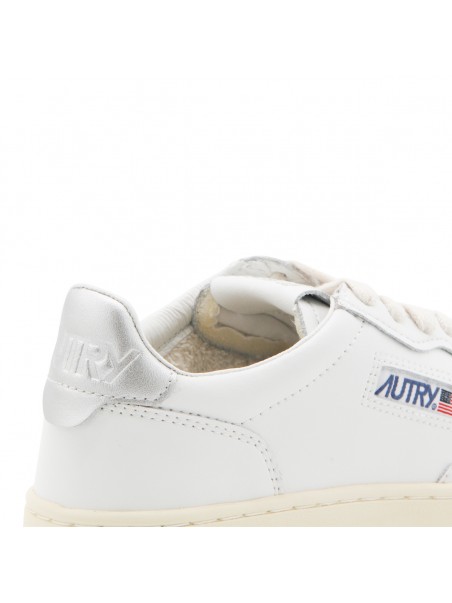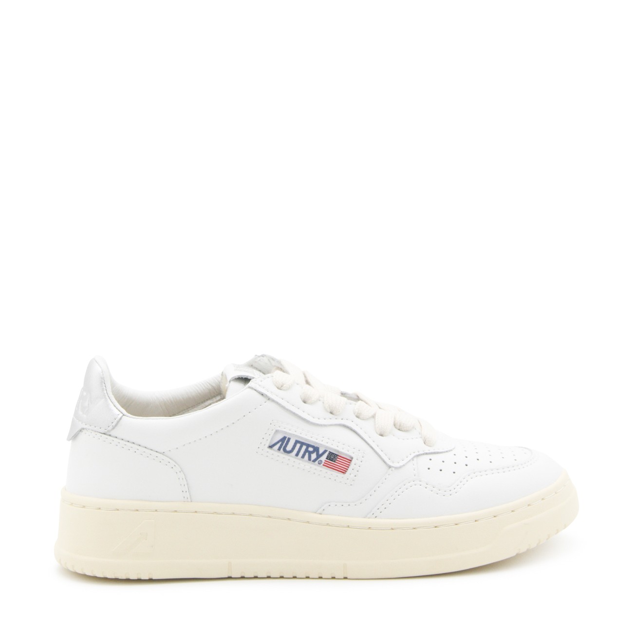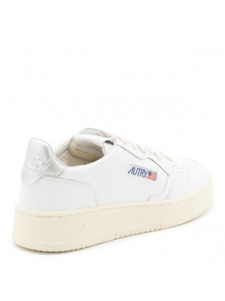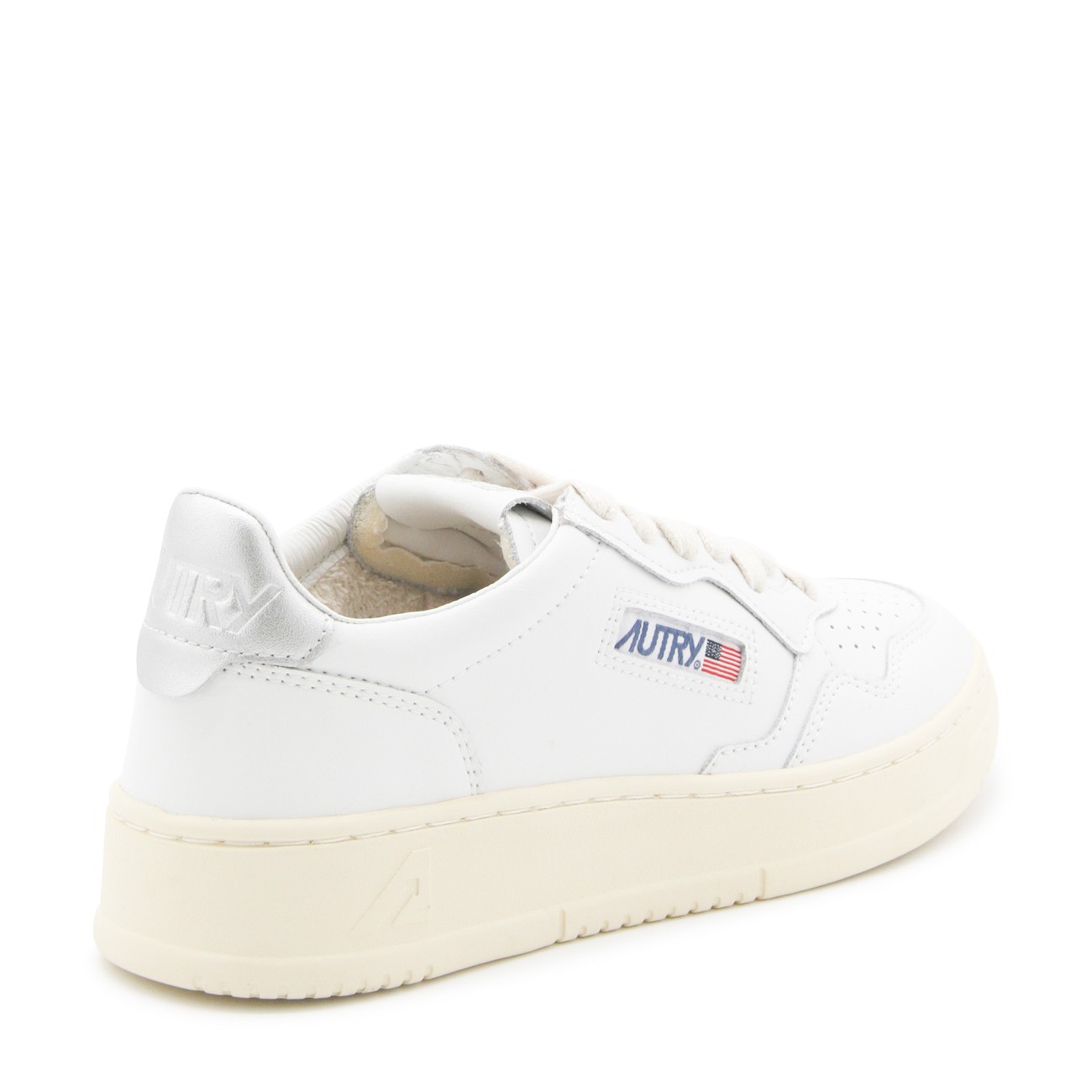 White and silver leather 01 low top sneakers from Autry featuring rubber sole, round toe, perforated details, logo label and silver metal leather counter on the heel.