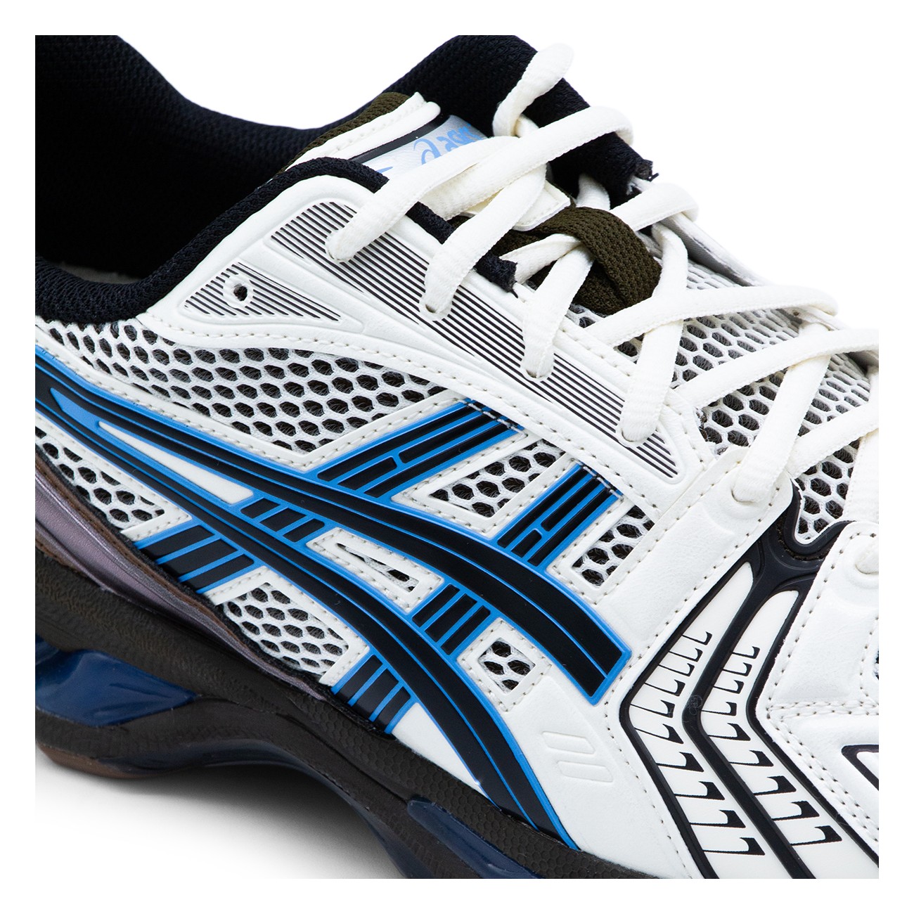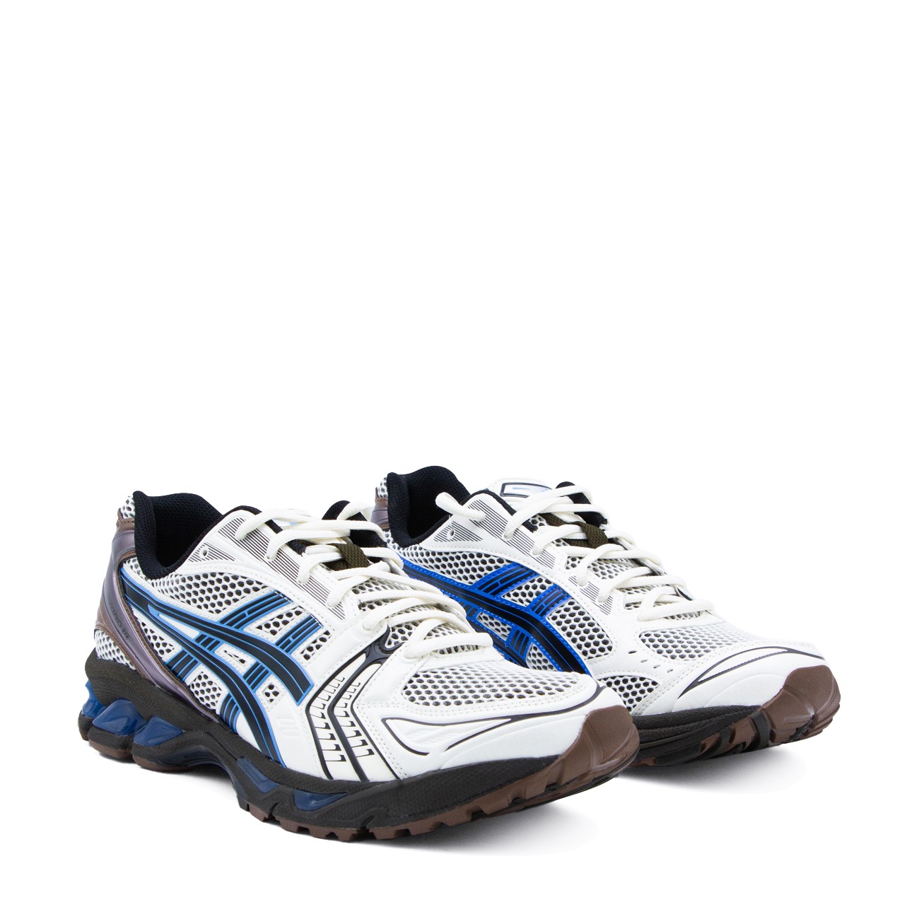 Cream and blue Gel-Kayano 14 sneakers from Asics featuring round toe, cotton lace-up fastening, two-tone inserts, gel underfoot technology and rubber sole.