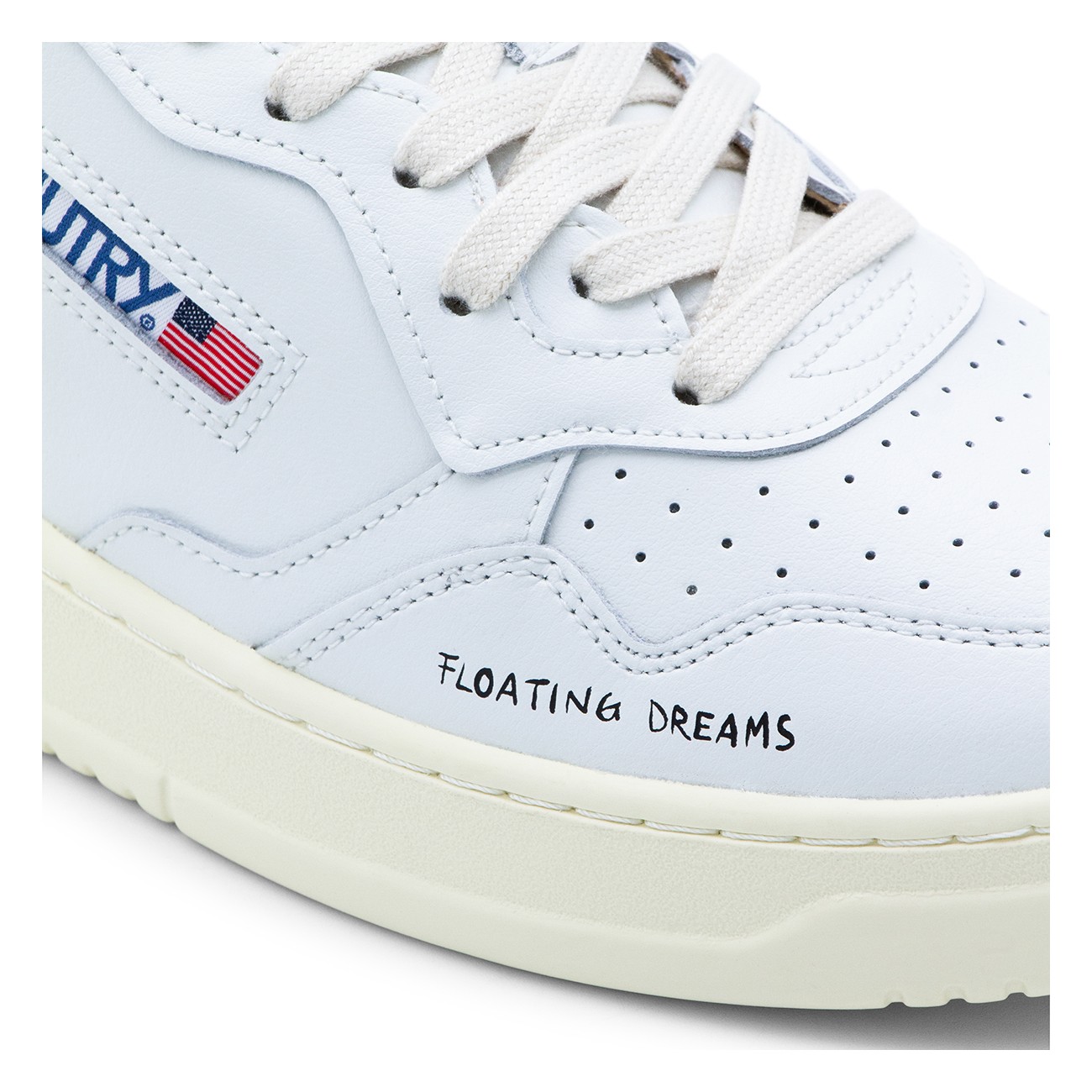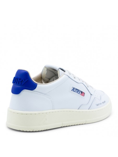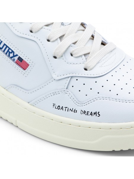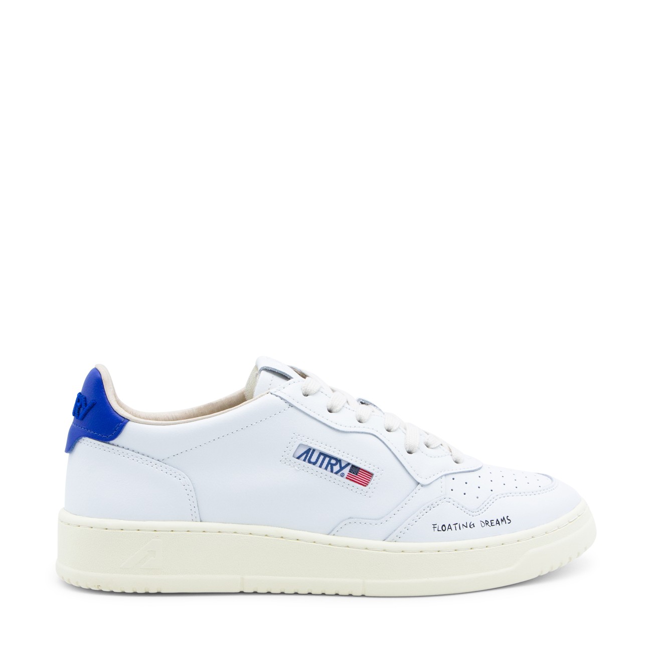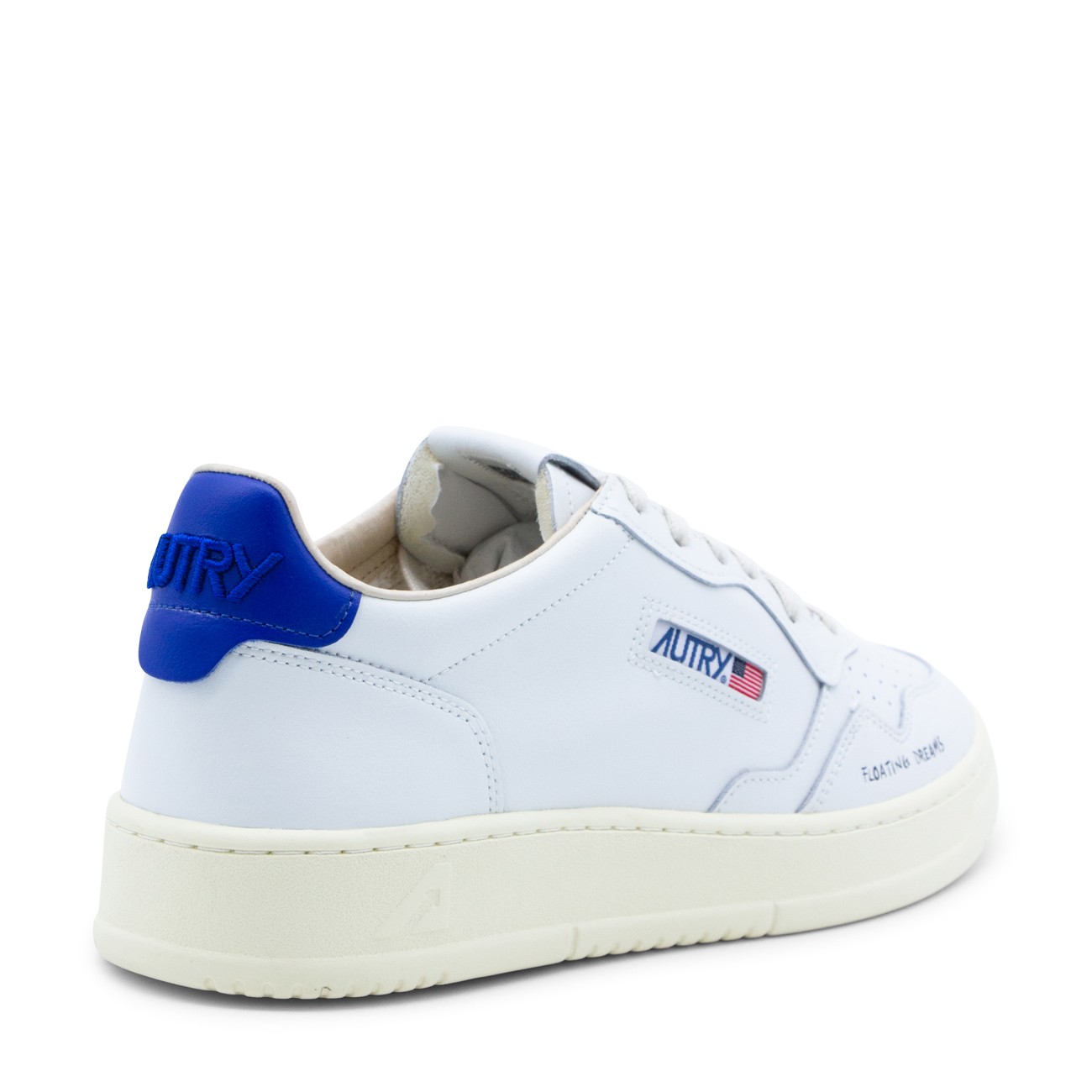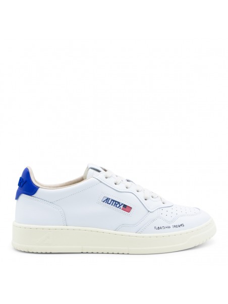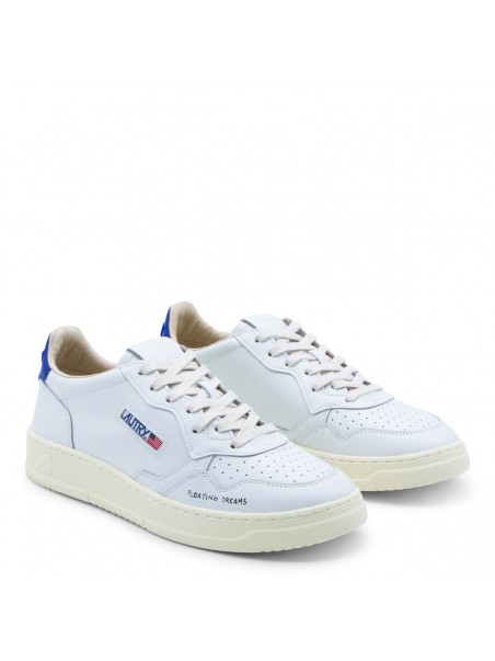 White and blue sneakers from Autry featuring round toe, laces fastening, lateral logo patch and leather sole.