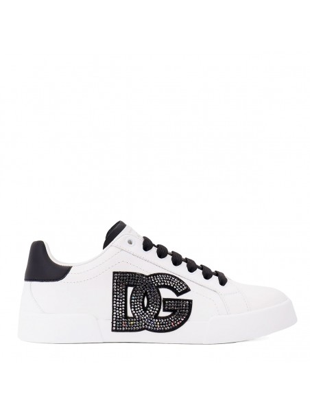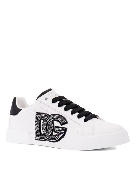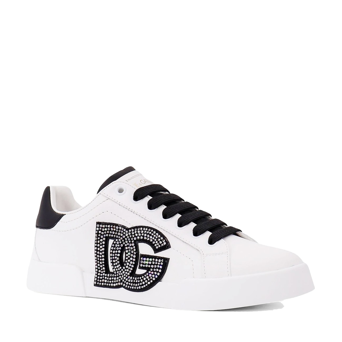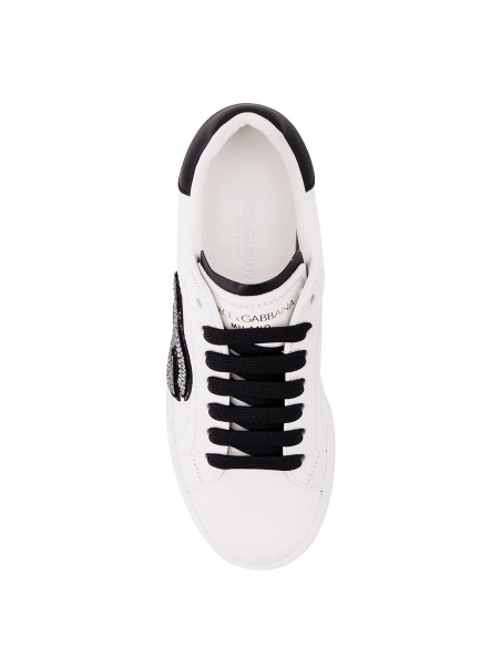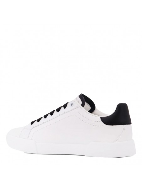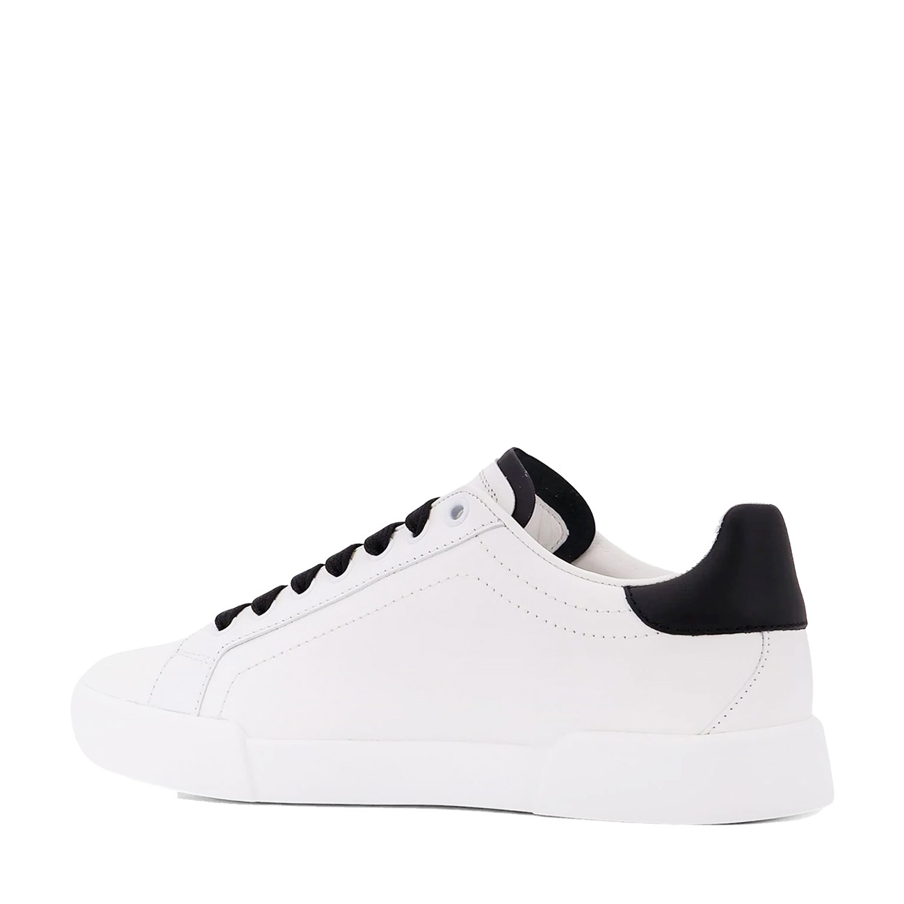 White and black leather Portofino Light Strobel sneakers from Dolce & Gabbana featuring round toe, cotton lace-up fastening, lateral DG patch, logo label on the tongue and contrasting details.