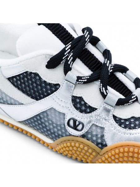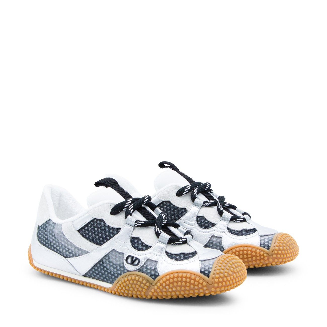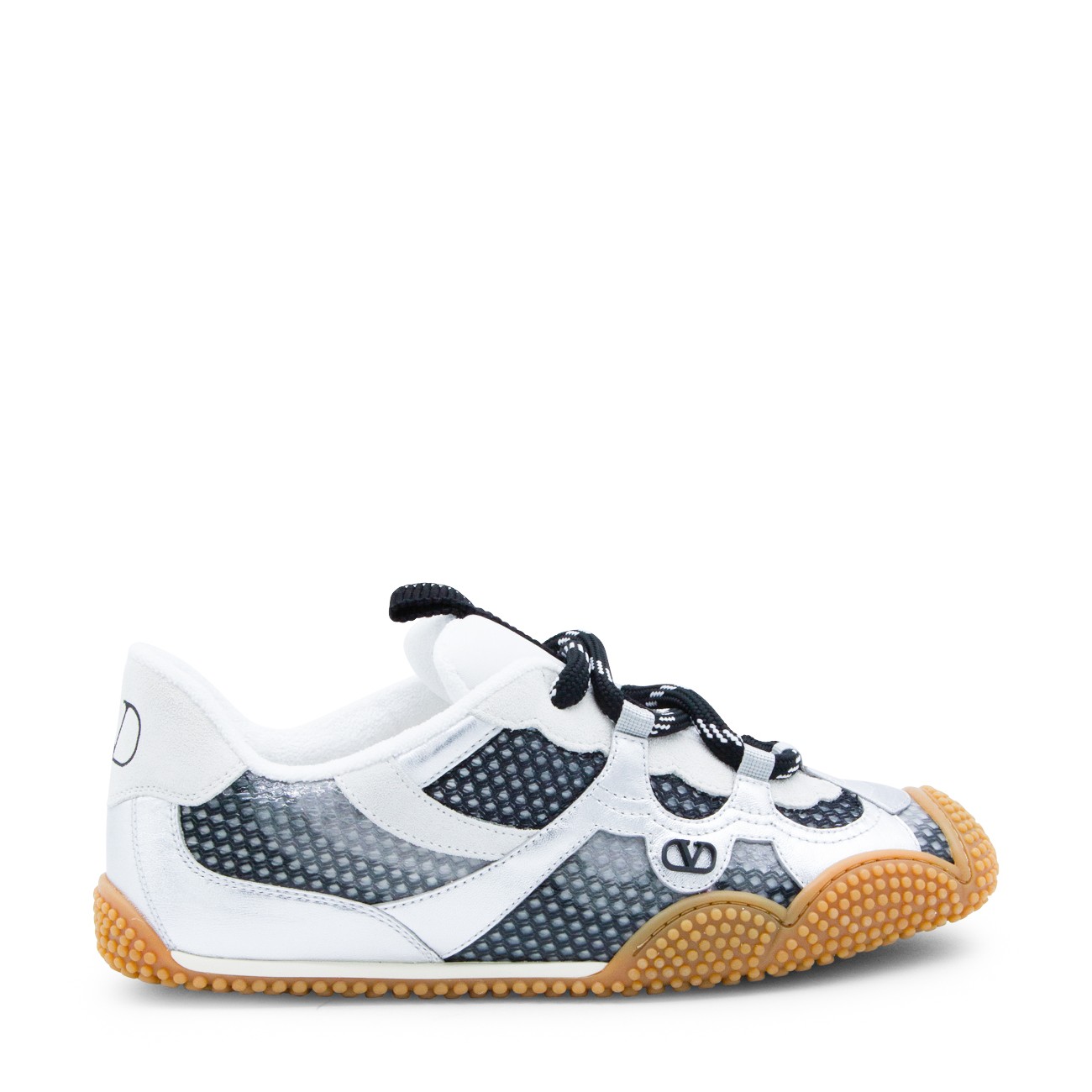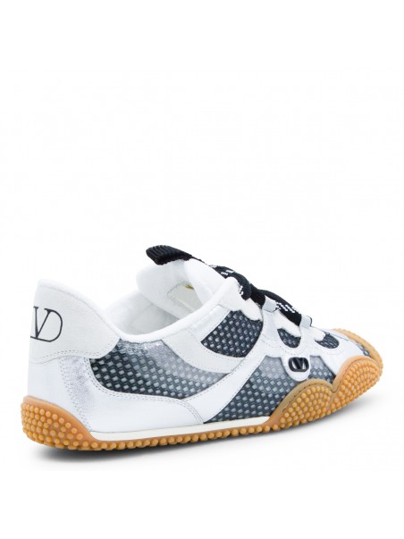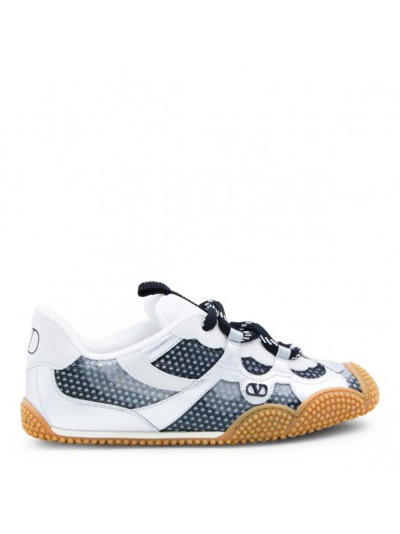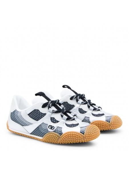 White and black leather Amphibia sneakers from Valentino Garavani featuring round toe, cotton lace-up fastening, lateral logo rubber detail, logo detail on the abck, striped fabric pull tab and custom rubber sole with scallops pattern.