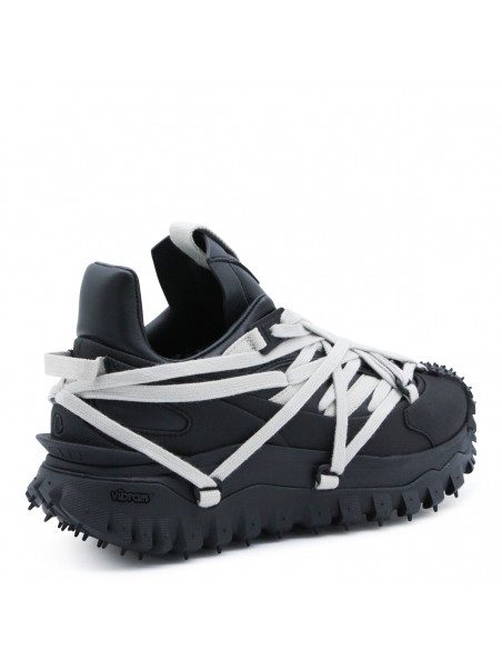 Black leather Trailgrip Megalace sneakers from Moncler + Rick Owens featuring pointed toe, Megalace clsoure, mesh lining and Vibram Megagrip rubber sole.