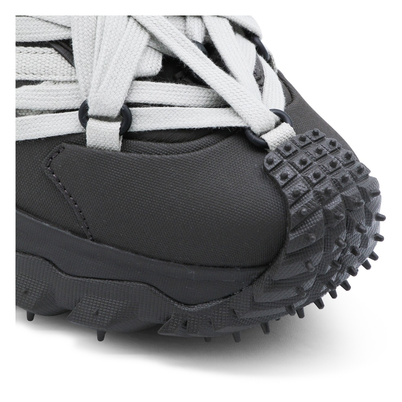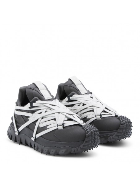 Dark grey leather Trailgrip Megalace sneakers from Moncler + Rick Owens featuring pointed toe, Megalace clsoure, mesh lining and Vibram Megagrip rubber sole.