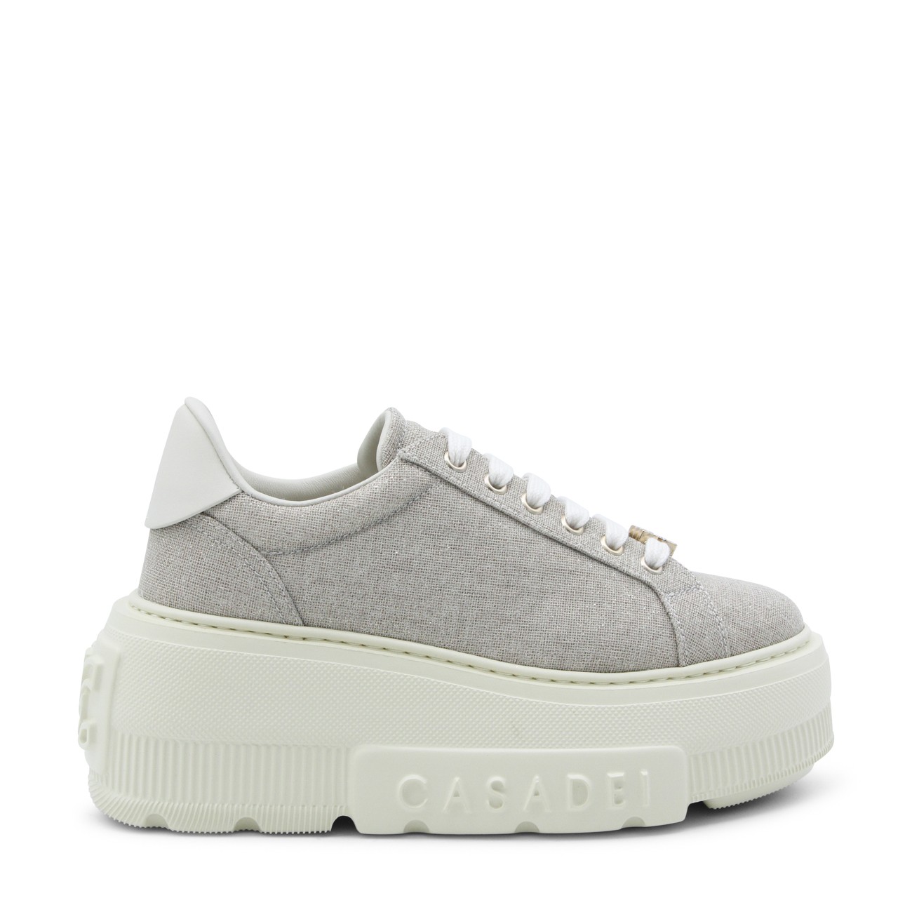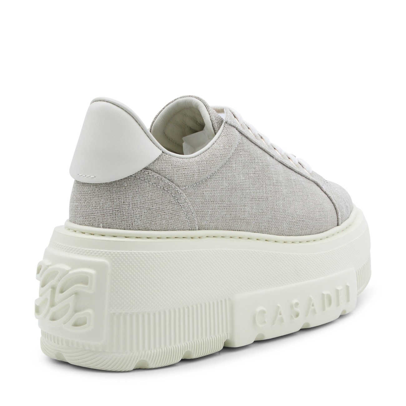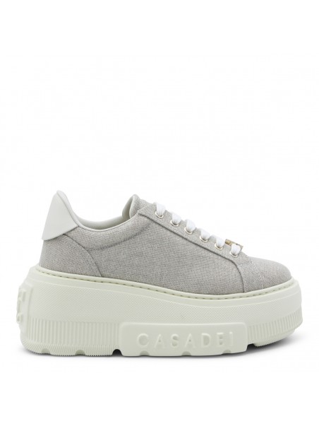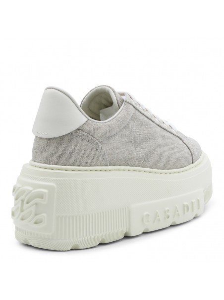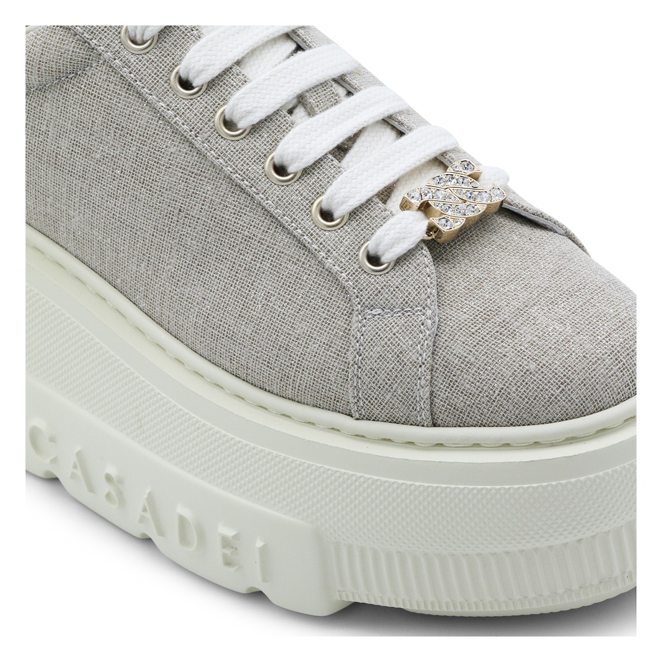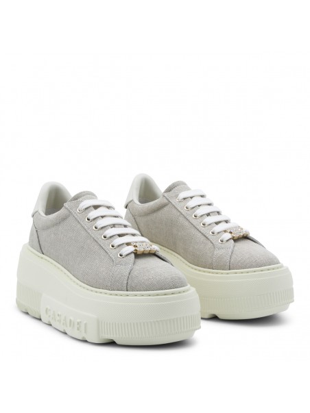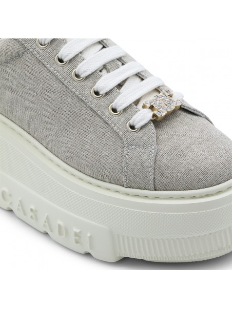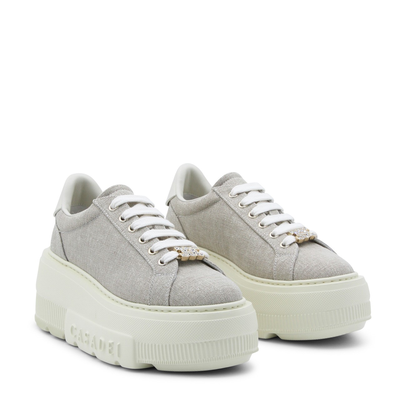 Beige leather Nexus Solar Eclipse sneakers from Casadei featuring round toe, cotton lace-up fastening, logo rhinestone-embellished metal buckle, glittery bamboo and milk fabric, rubber logo patch and rubber sole.