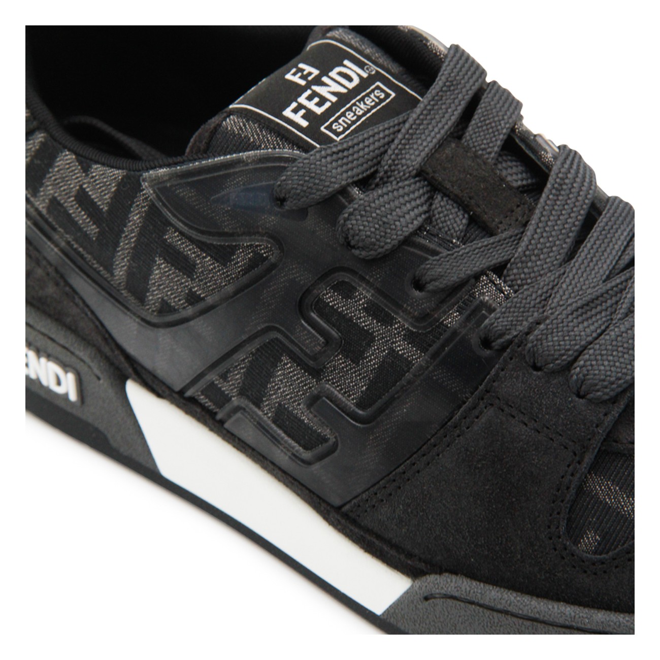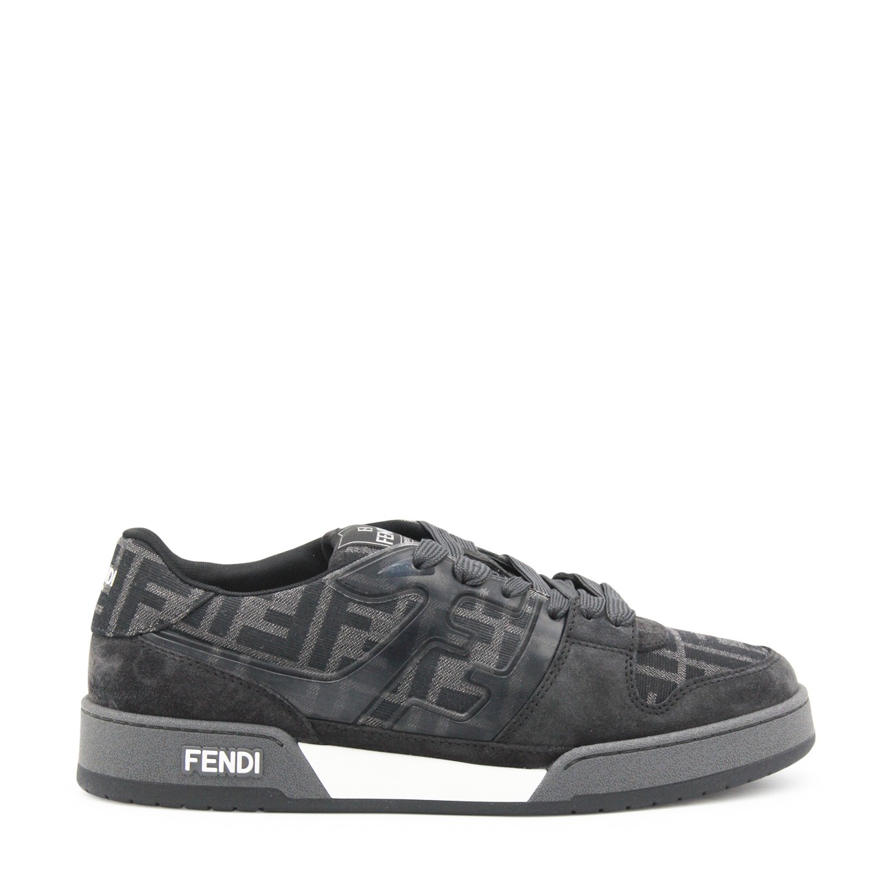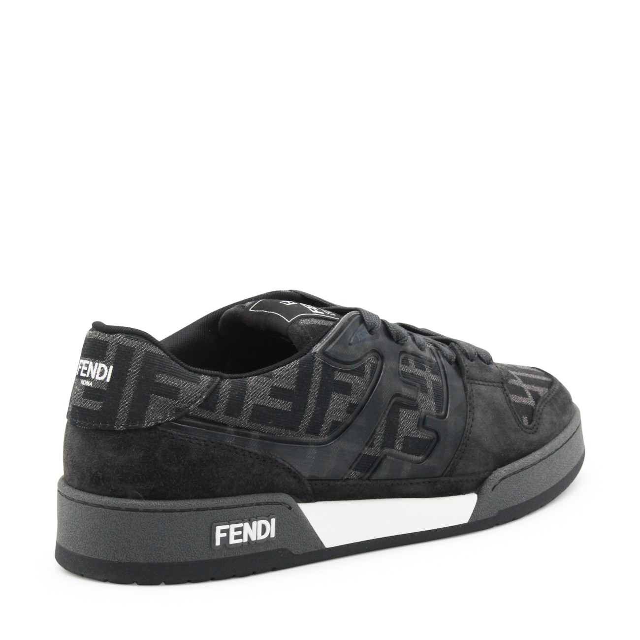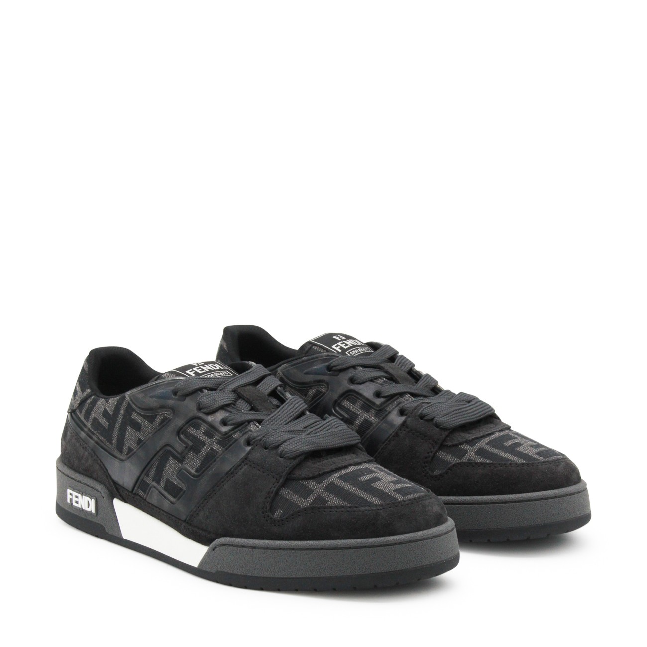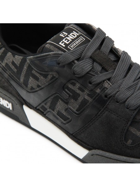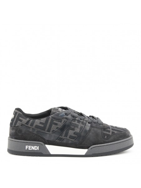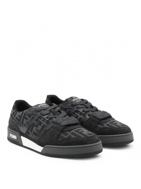 Black and grey suede Match sneakers from Fendi featuring round toe, cotton lace-up fastening, all over monogram, logo on the tongue, rubber sole and logo on the sole.