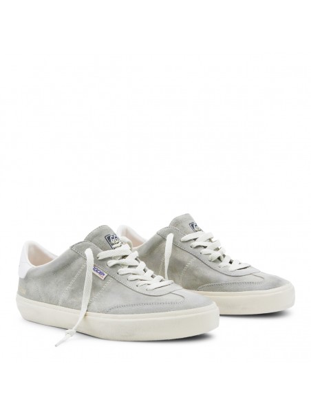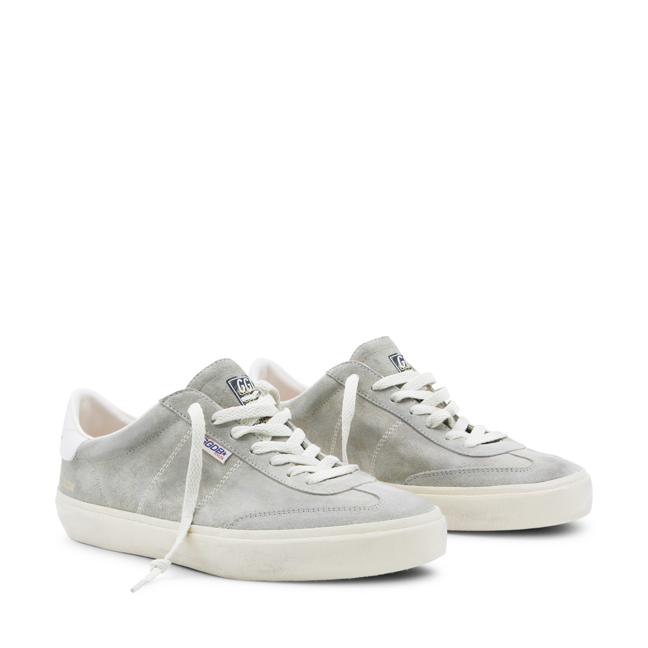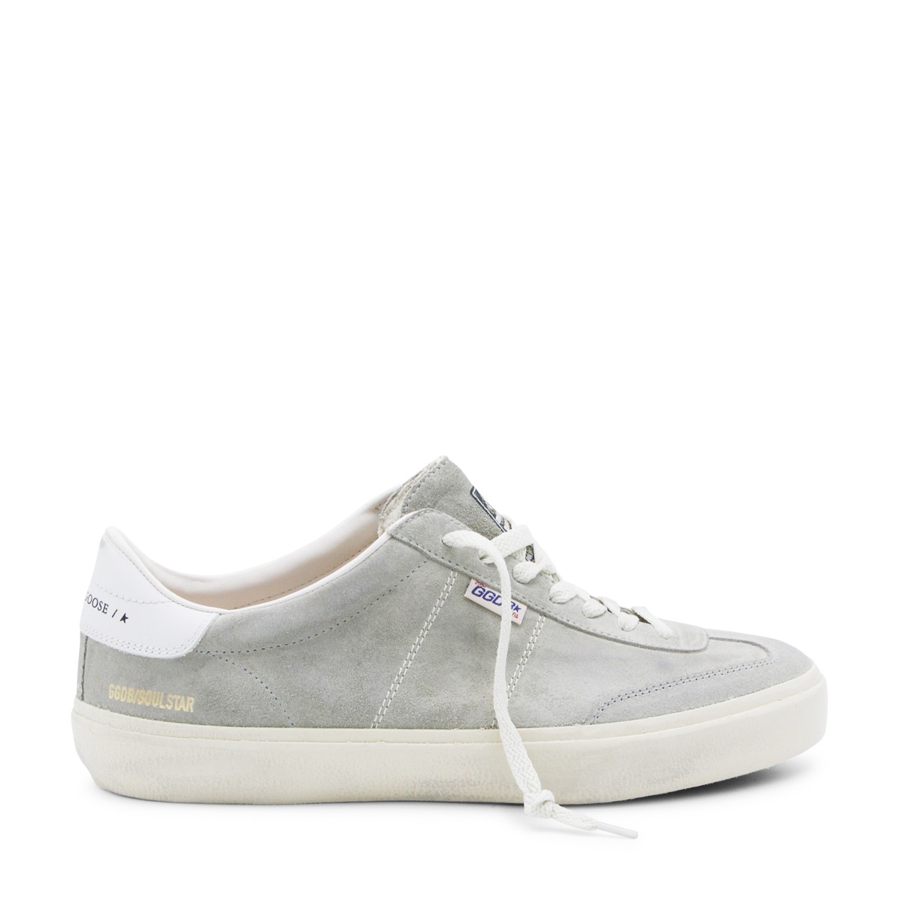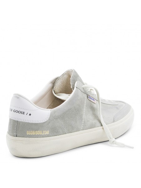 Grey leater Soul-Star sneakers from Golden Goose featuring round toe, cotton lace-up fastening, grey suede upper, white leather heel tab, vintage treatment and rubber sole.