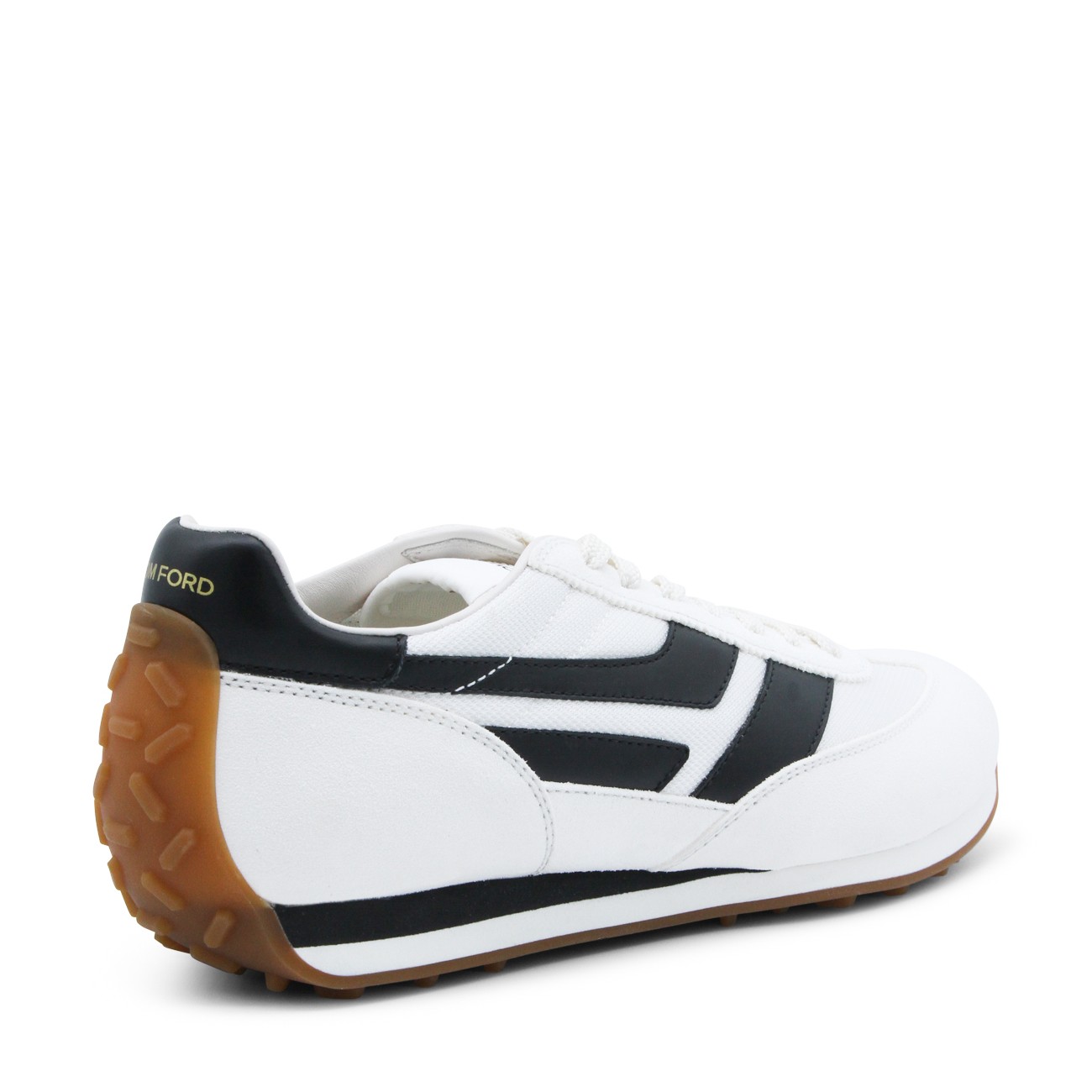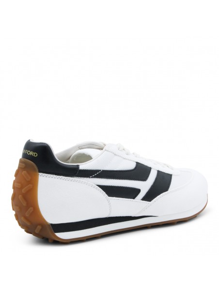 White and black leather Mick sneakers from Tom Ford featuring pointed toe, cotton lace-up fastening, black details and rubber sole.