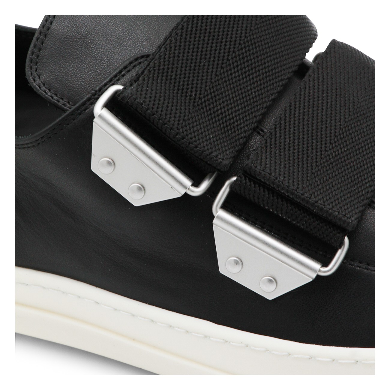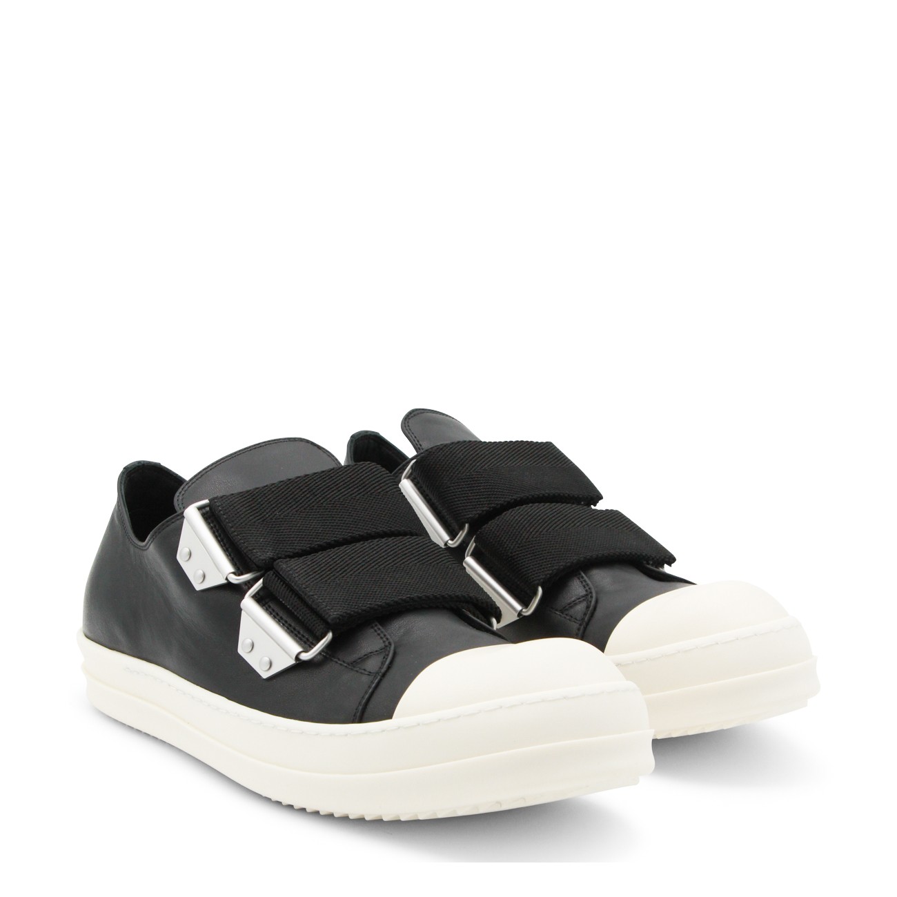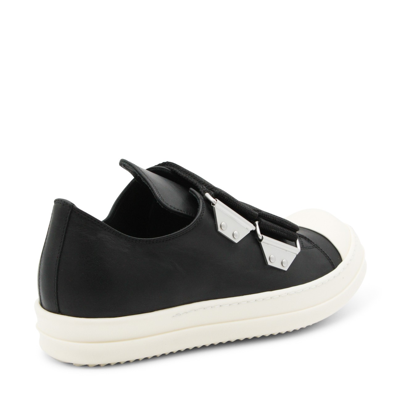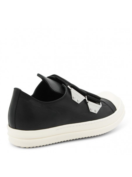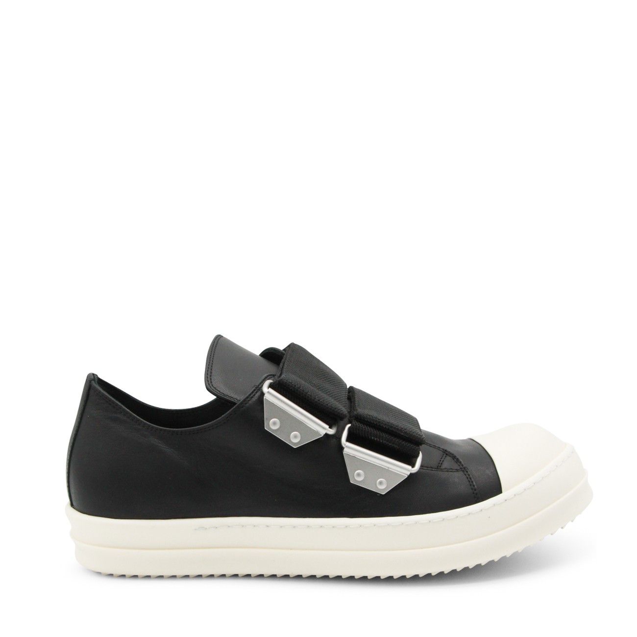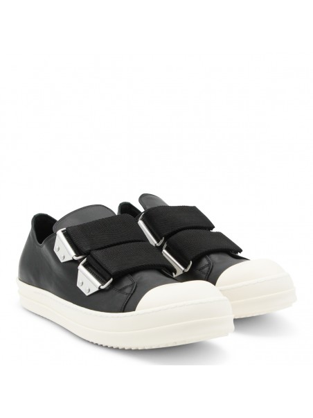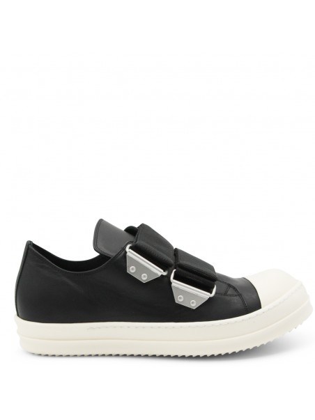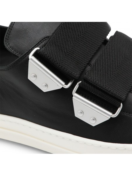 Black and milk leather sneakers from Rick Owens featuring round toe, rubber sole, adjustable straps, toe cap and regular vestibility.
