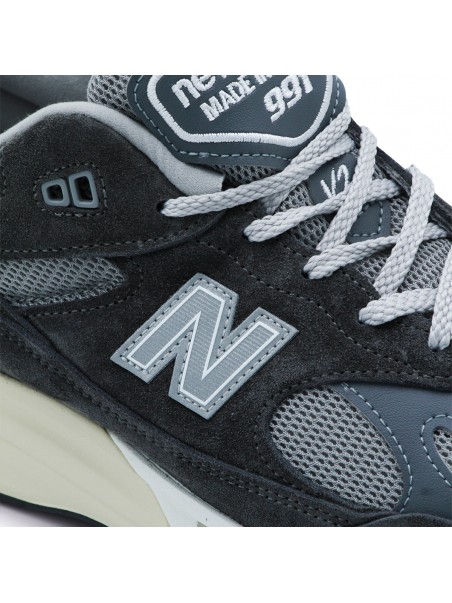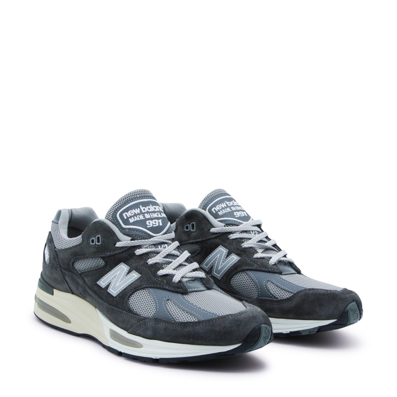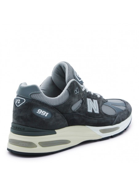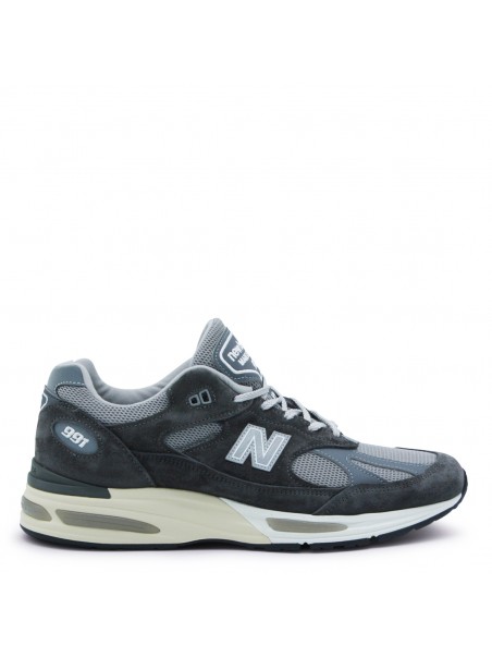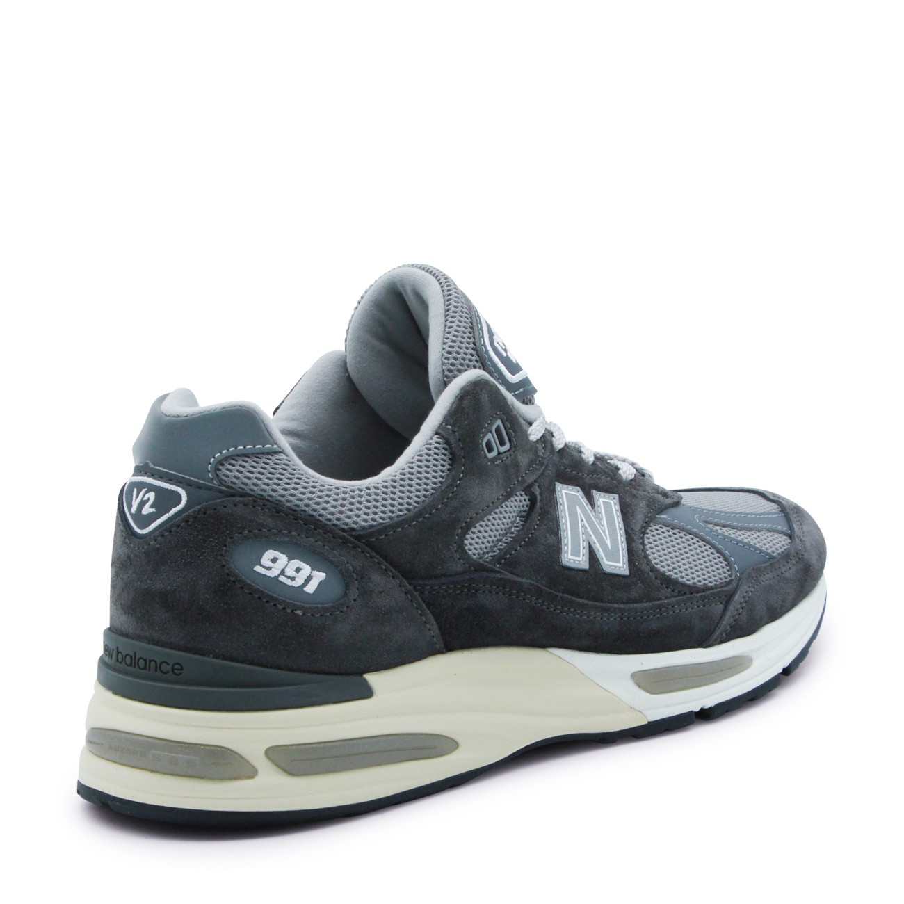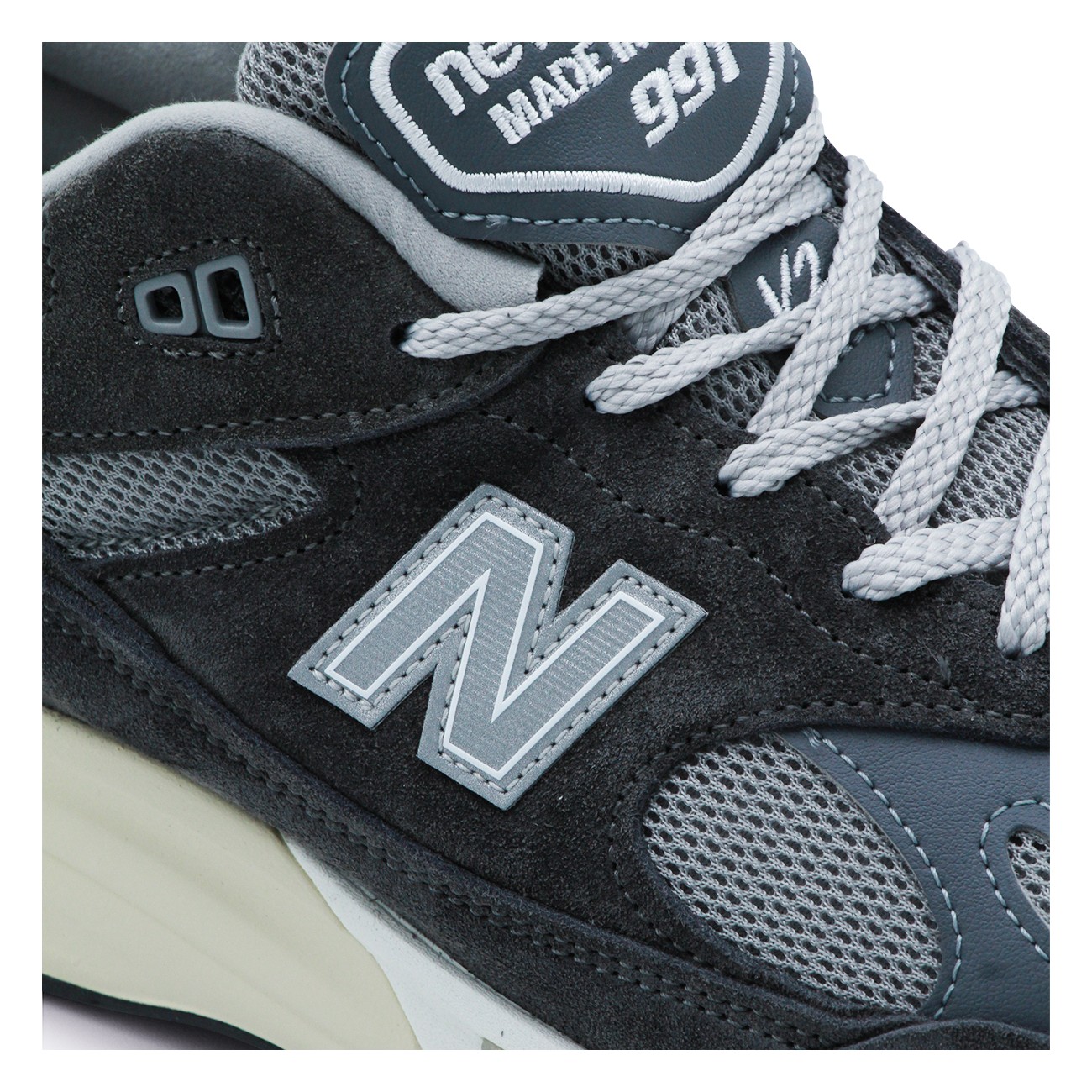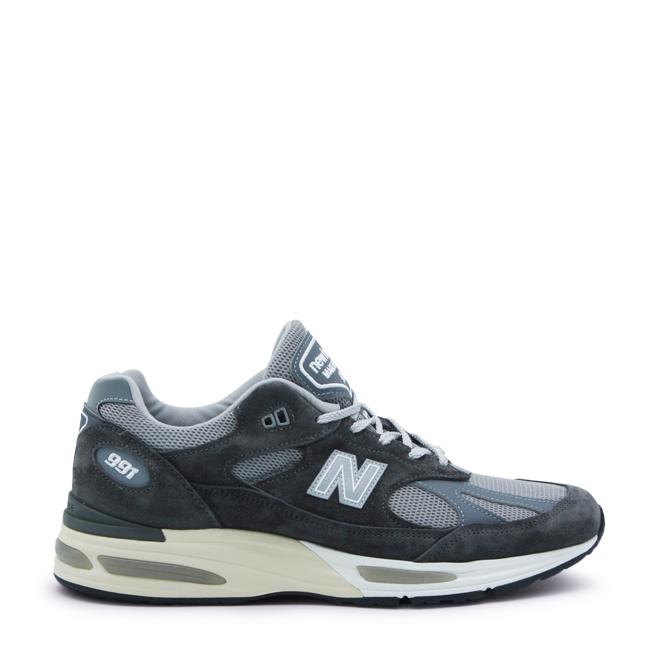 Dark grey leather 991 sneakers from New Balance featuring round toe, laces fastening, logo, paneled design, branded insole and rubber sole.
