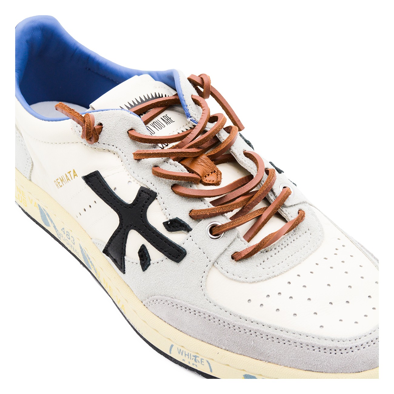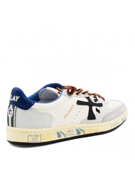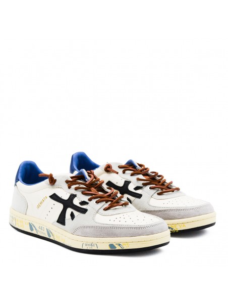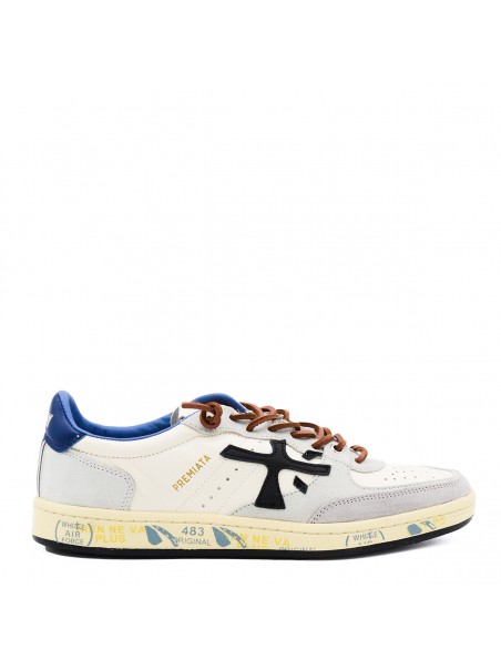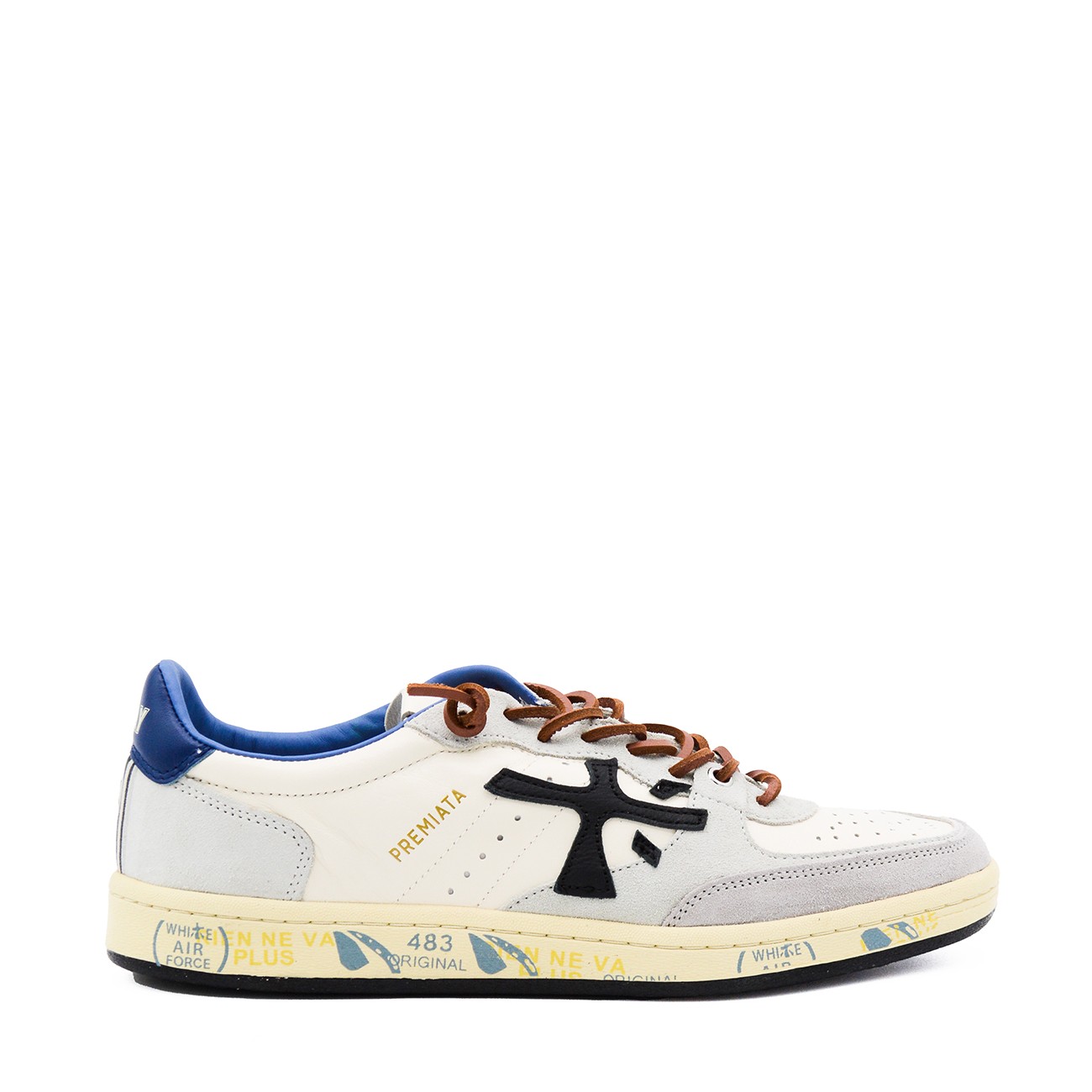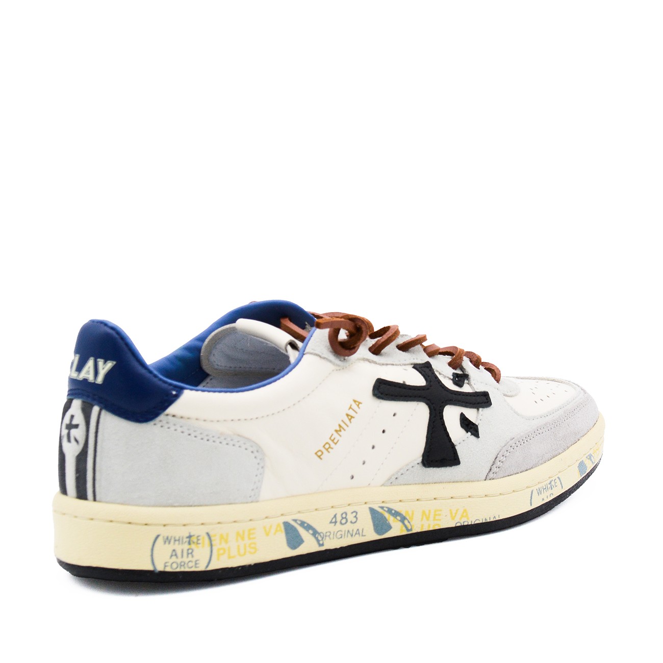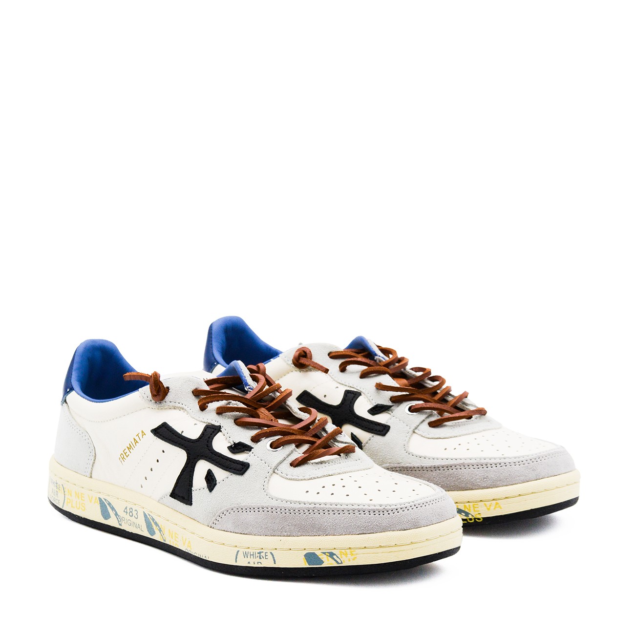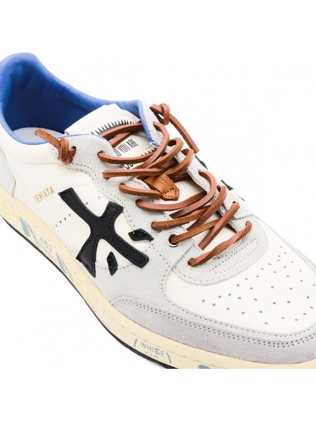 White and grey leather sneakers from Premiata featuring contrasted details, round toe, rubber sole, used effect and cotton laces.