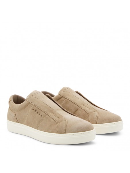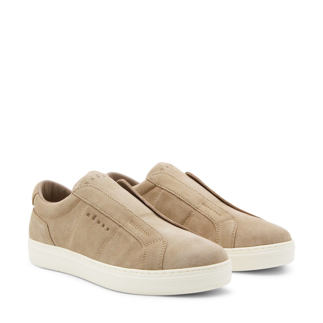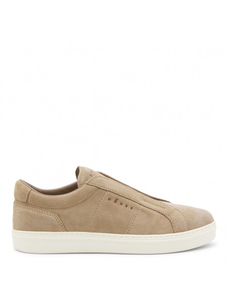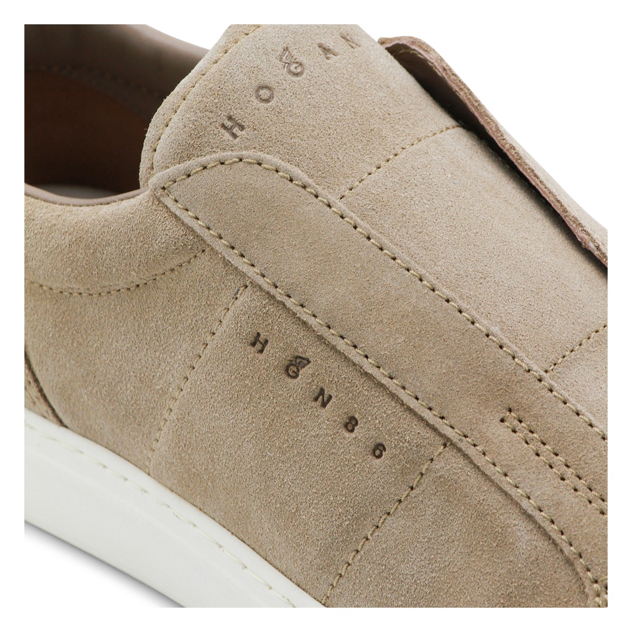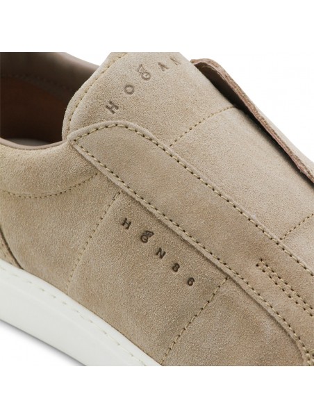 Beige suede slip on sneakers from Hogan featuring rubber sole, slip on style, branded insole and logo details.