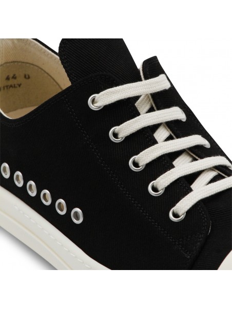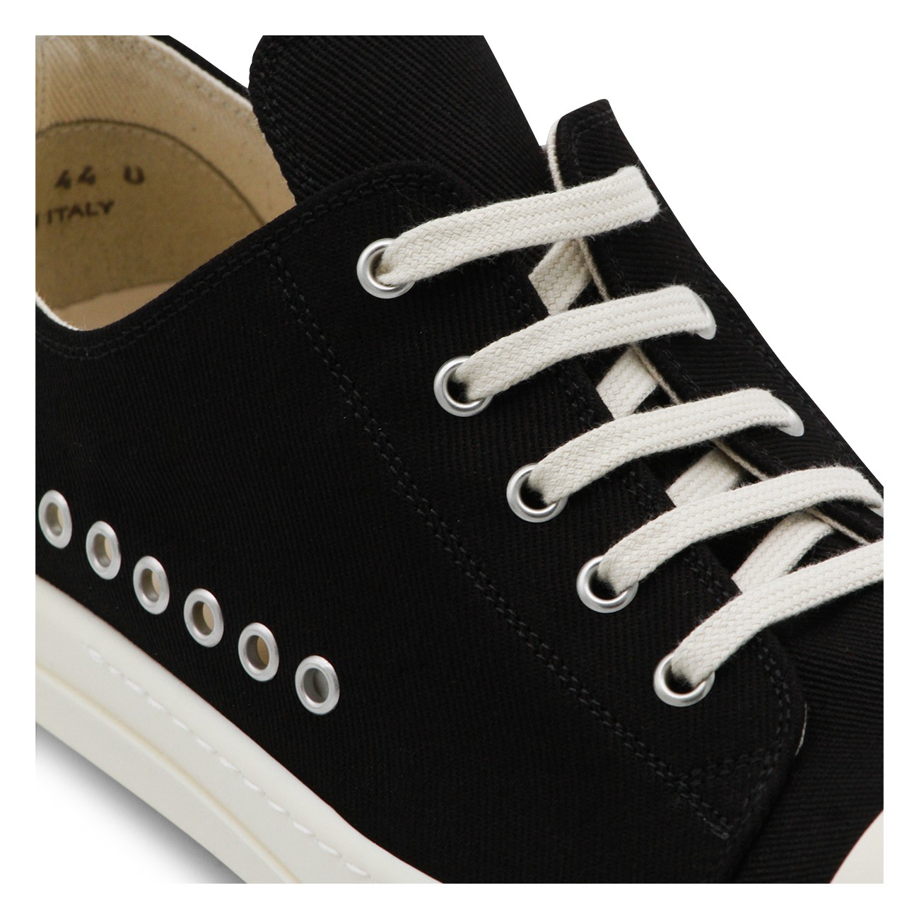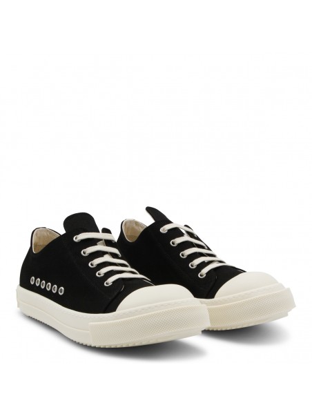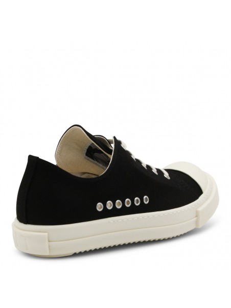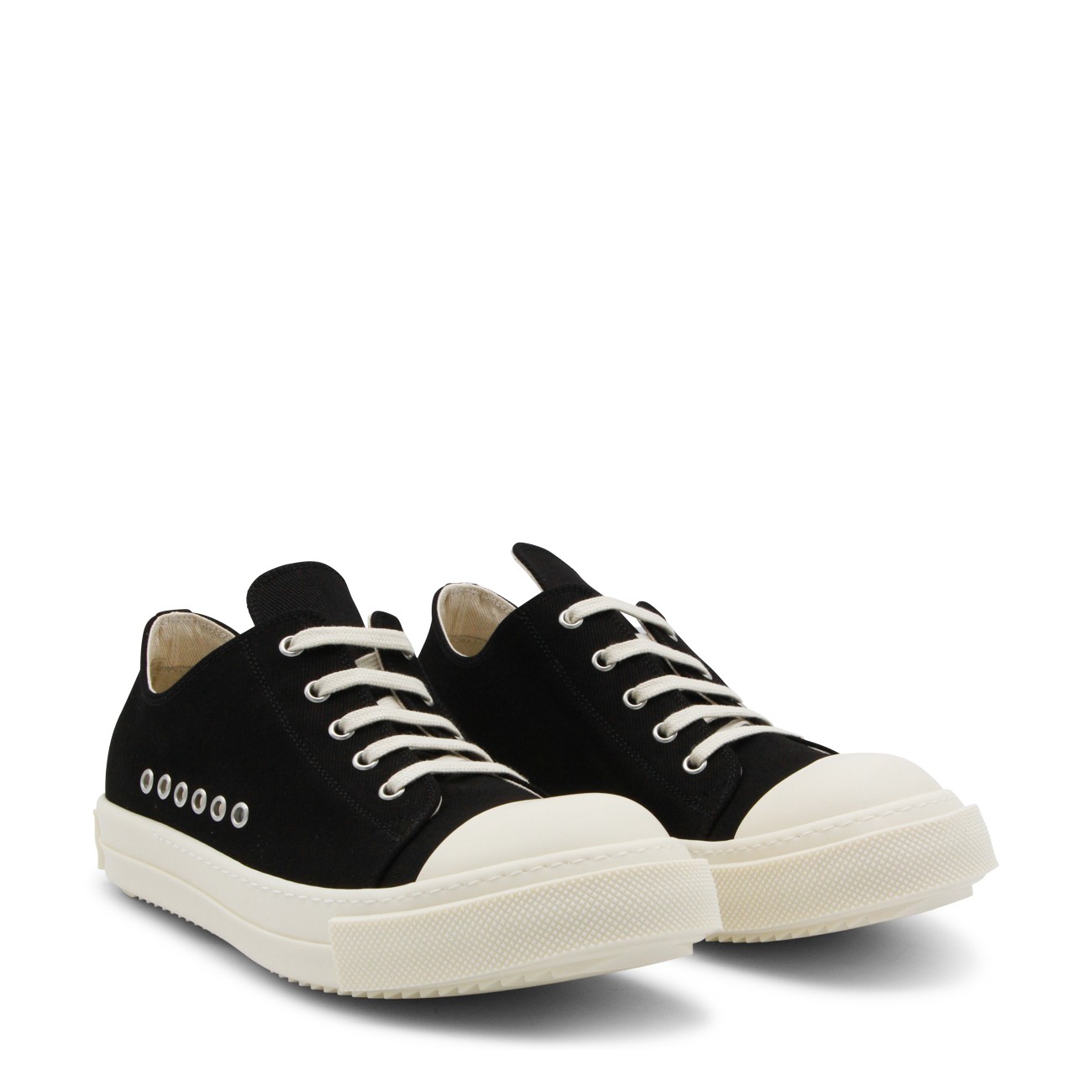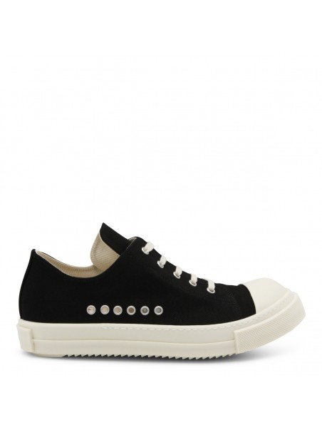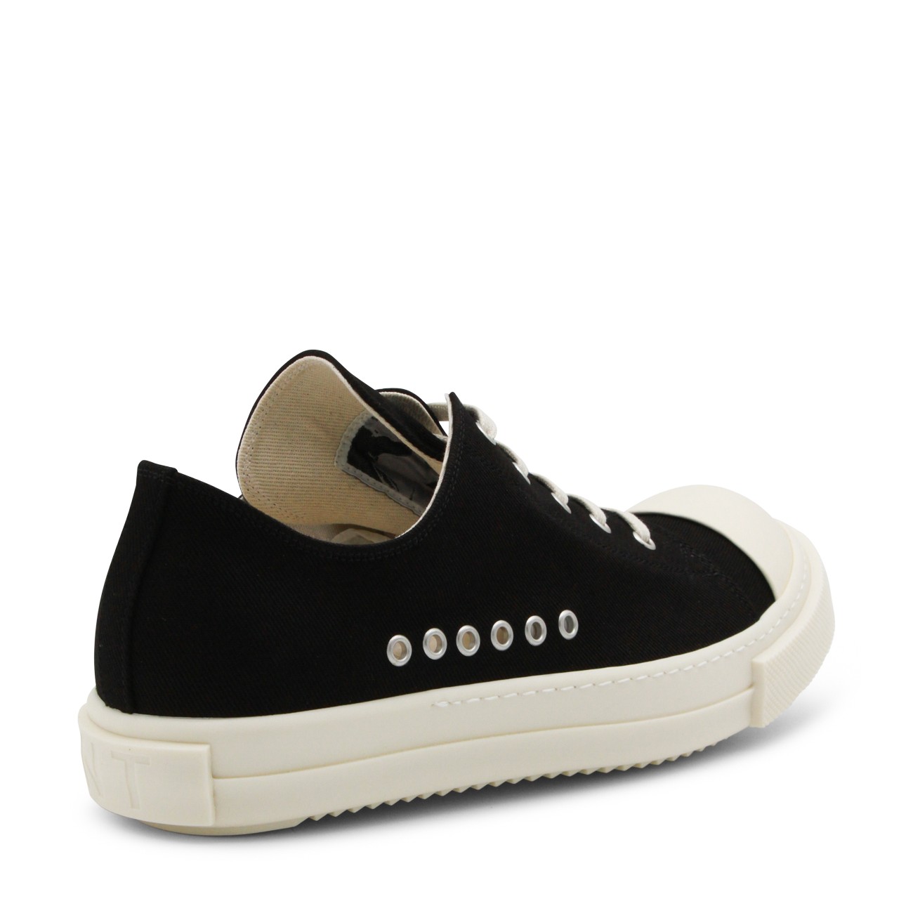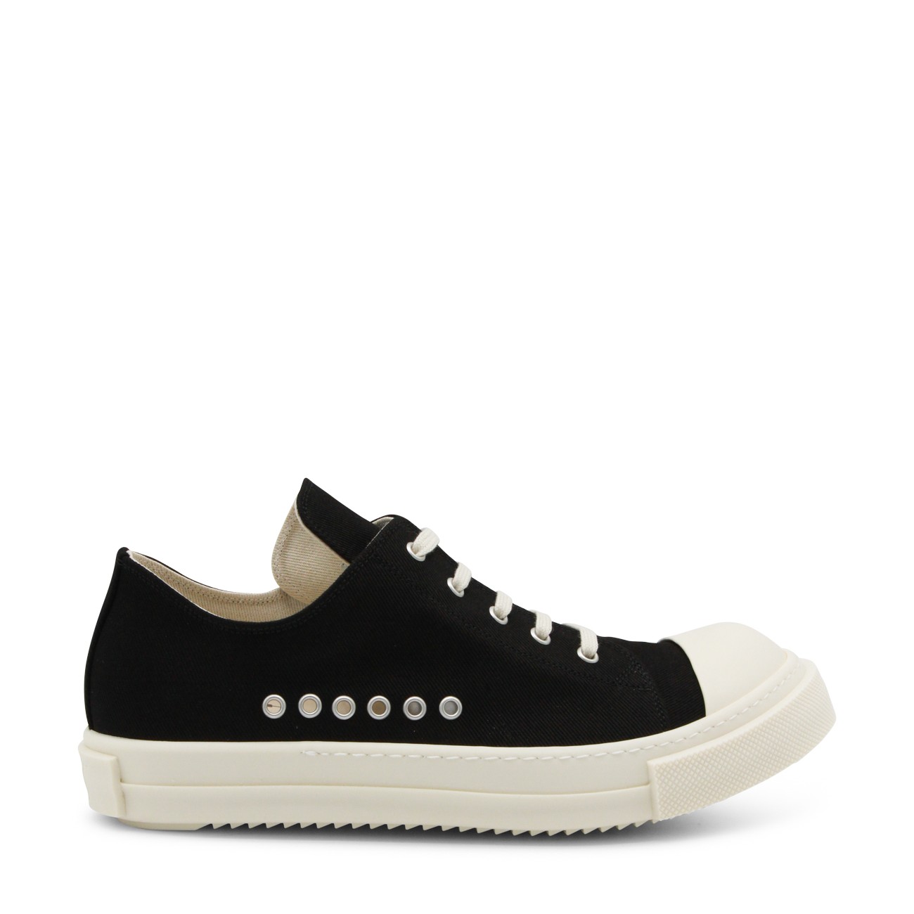 Black and milk Extreme low sneakers from Rick Owens DRKSHADW featuring rubber sole, big pointed toe, metal elements and branded sole.