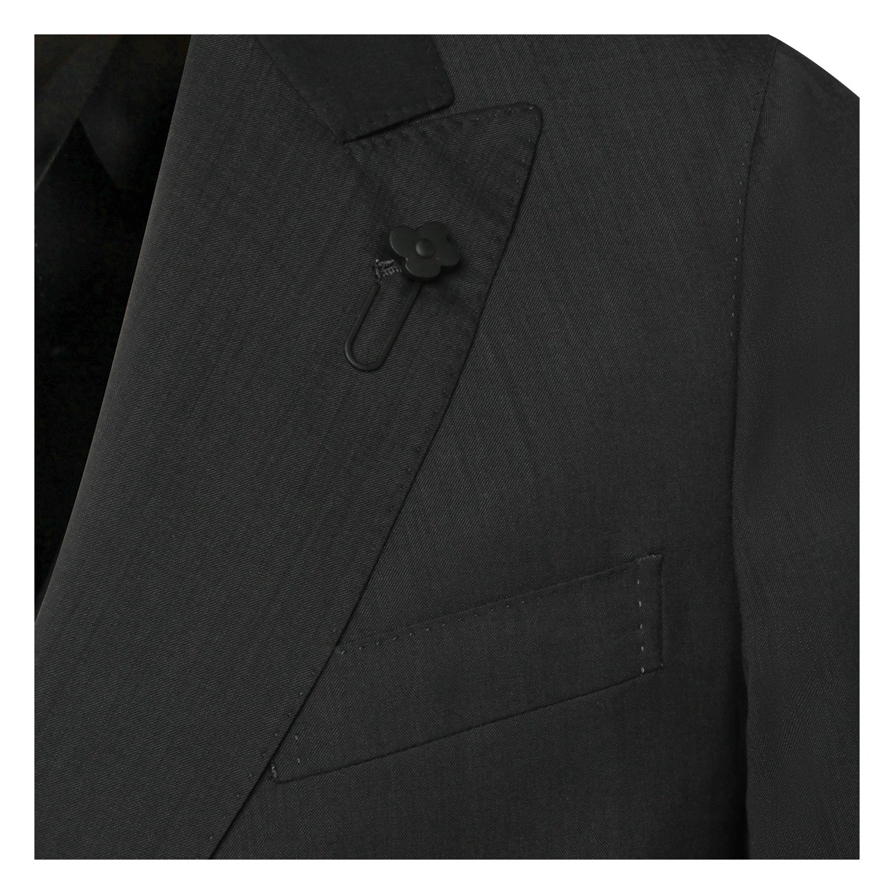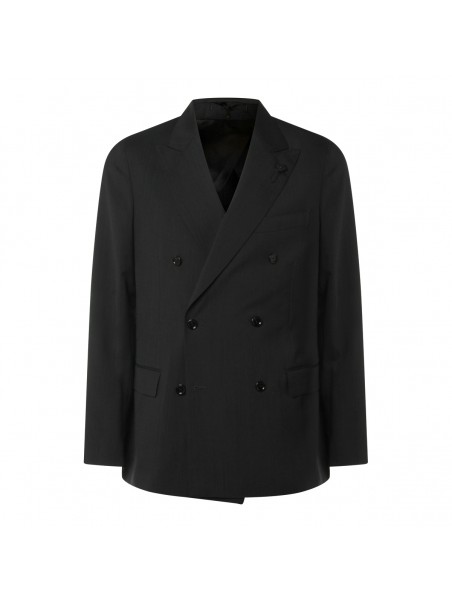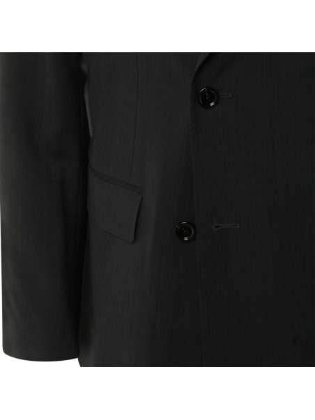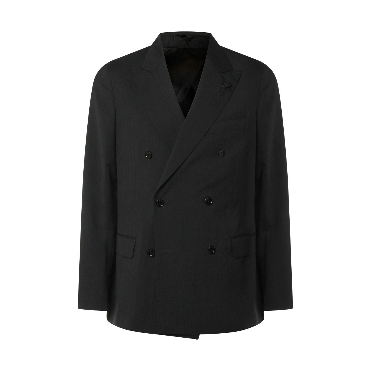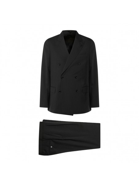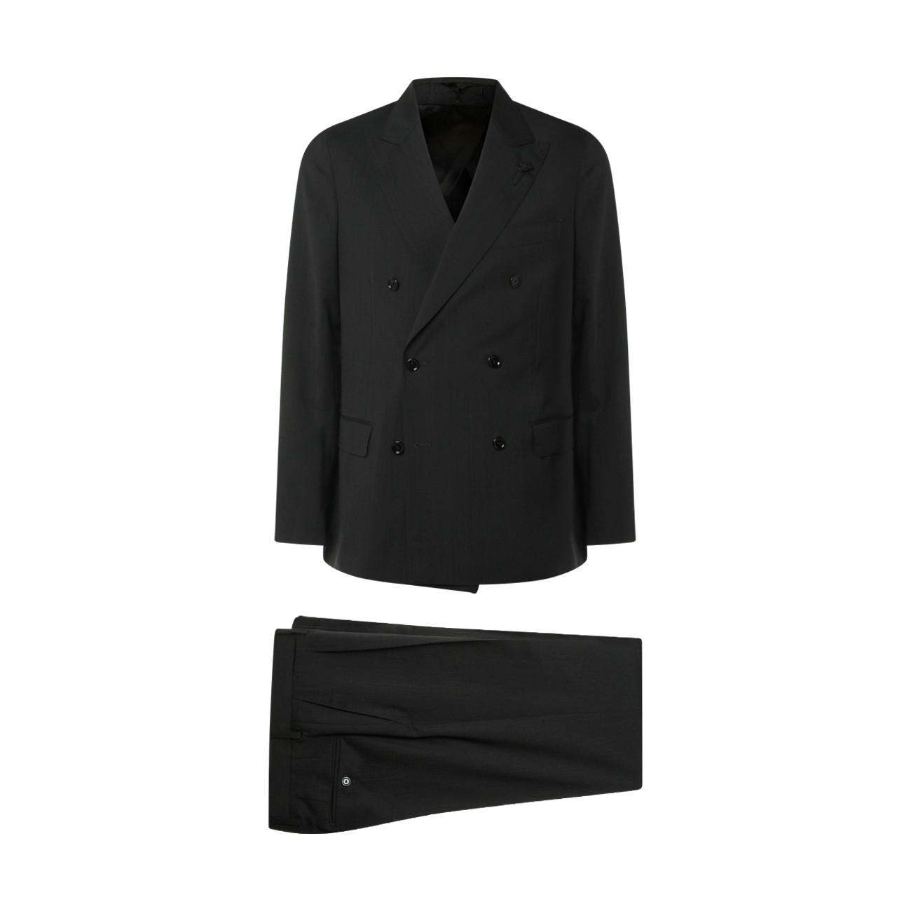 Dark grey wool suit from Lardini featuring long sleeves, double breasted fastening with buttons, pants with buttons and pockets.