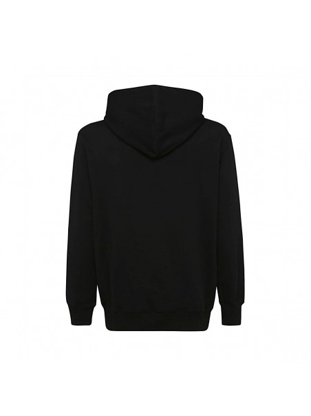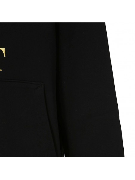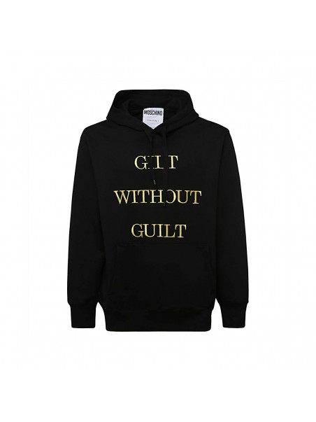 Black leather sweatshirt from Moschino featuring long sleeves, ribbed hem, ribbed cuffs, drawstring hood, front graphic print, regular fit and gold-tone.