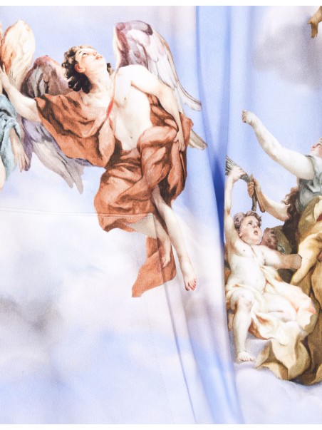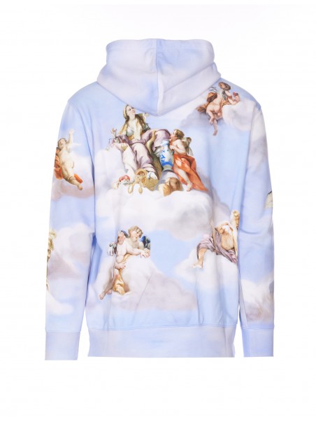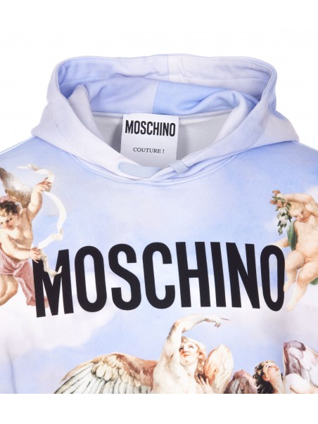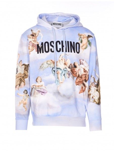 Multicolour cotton sweatshirt from Moschino featuring light blue, logo print at the chest, all-over graphic print, drawstring hood, long sleeves and fitted-cuff sleeves.