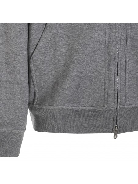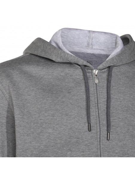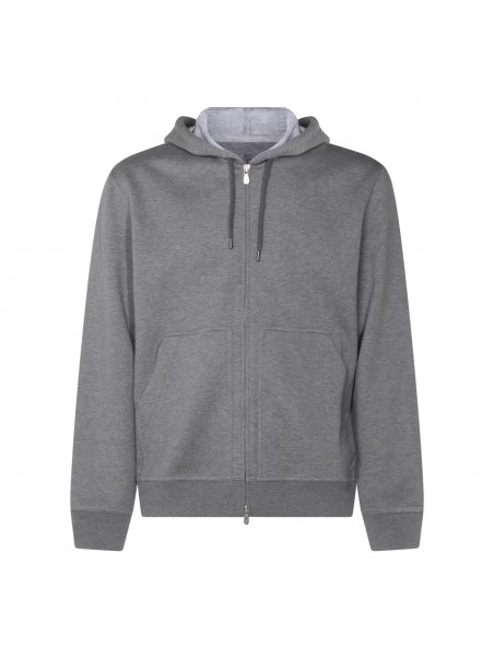 Grey cotton and cashmere blend zipped sweatshirt from Brunello Cucinelli featuring long sleeves, zip fastening, hood, ribbed cuffs and hem and regular vestiiblity.