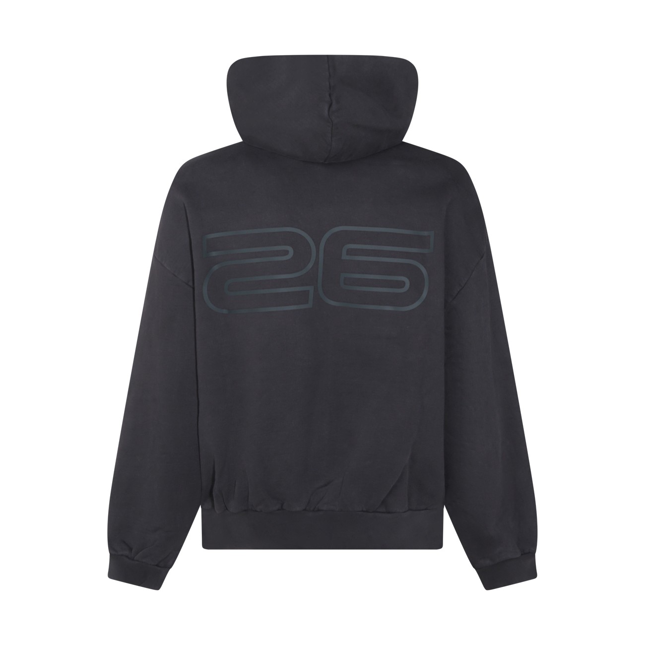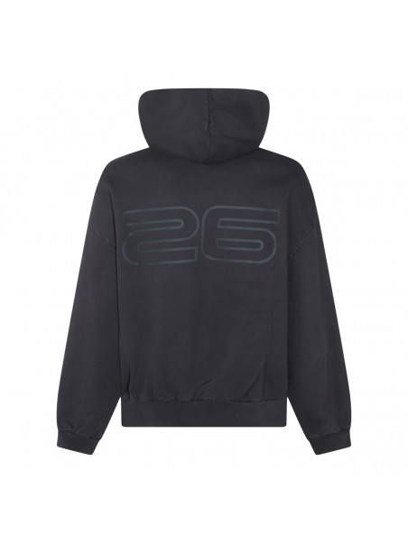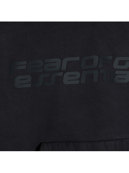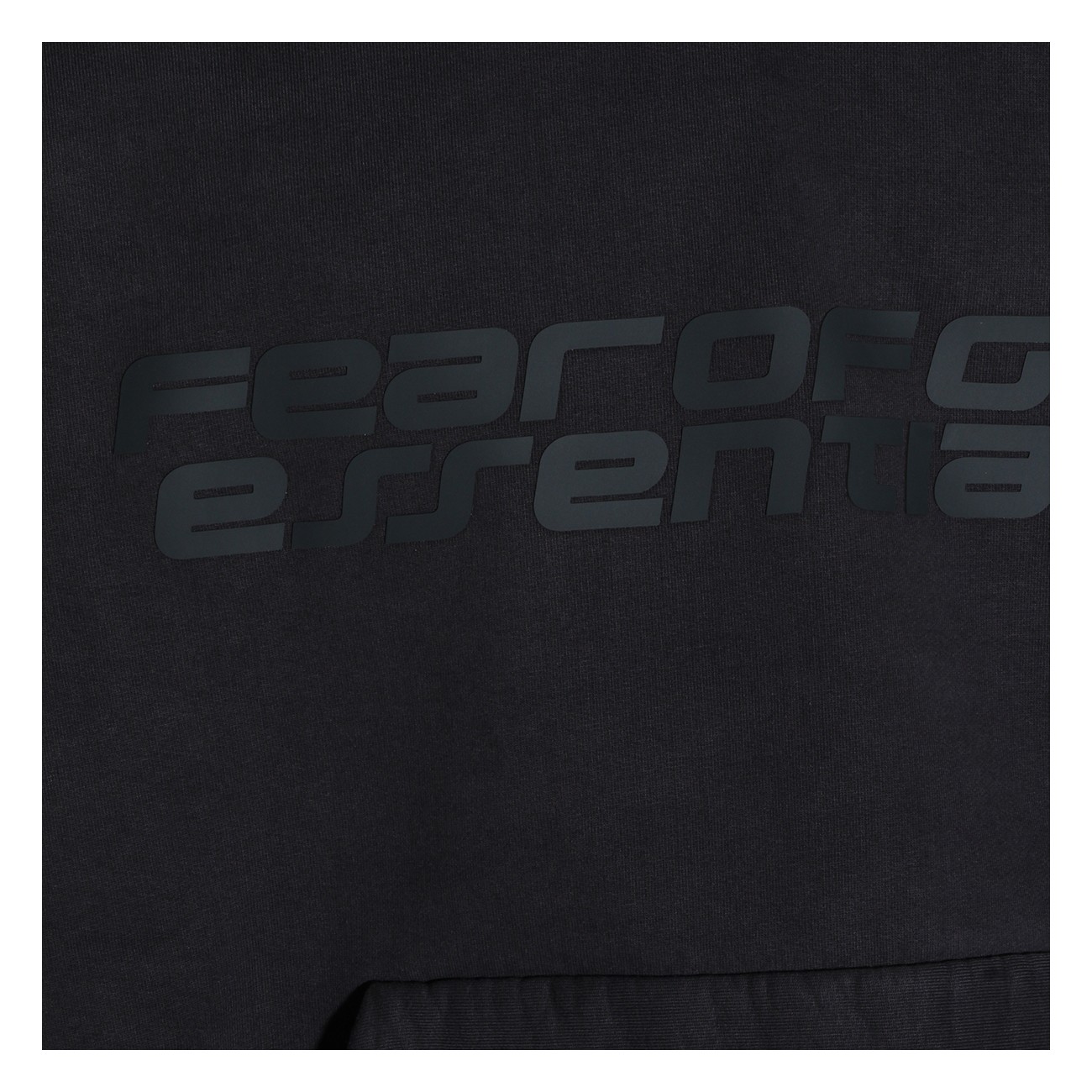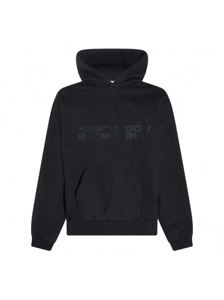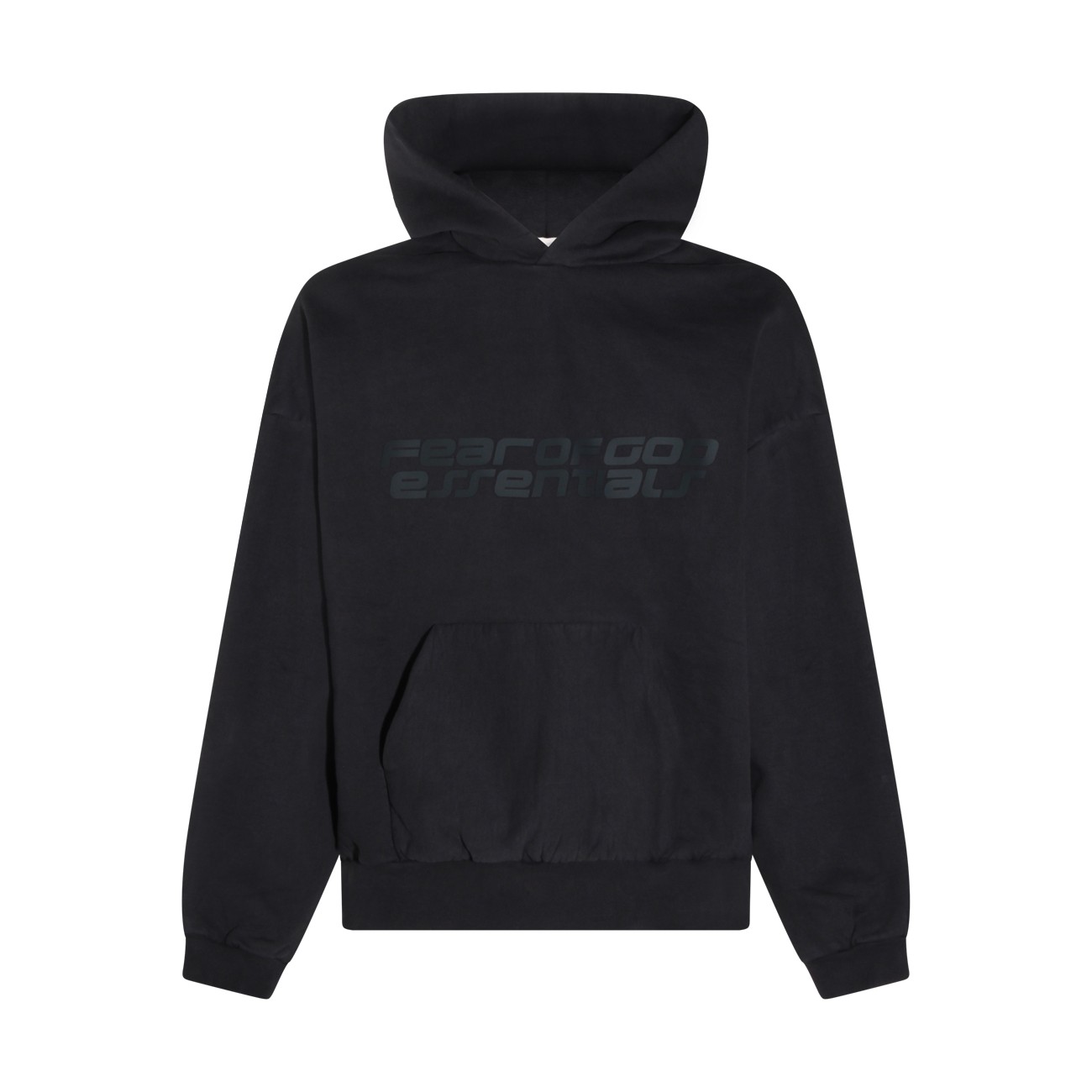 Black cotton sweatshirt from Fear Of God Essentials featuring hood, long sleeves, kangaroo pocket, hd printed logo, rib-knit cuffs and hem and oversize vestibility.
