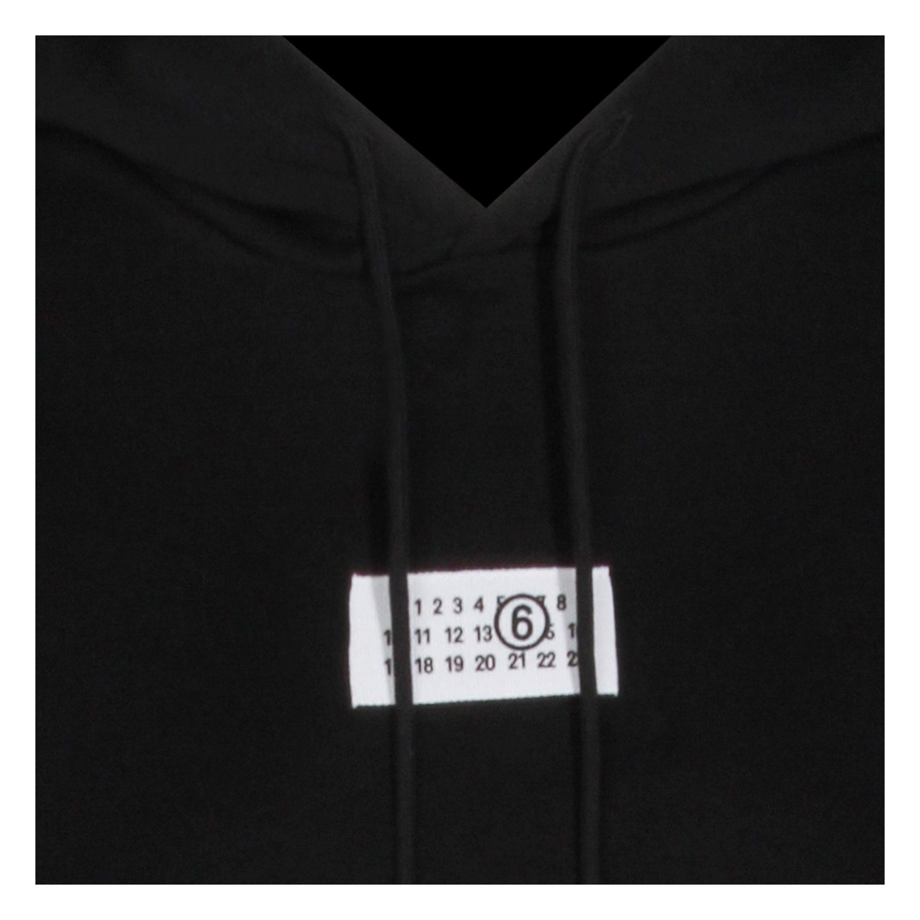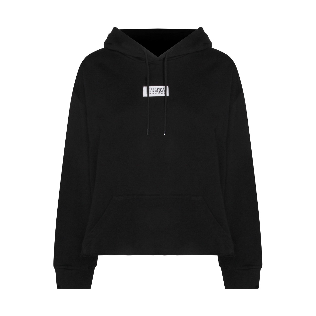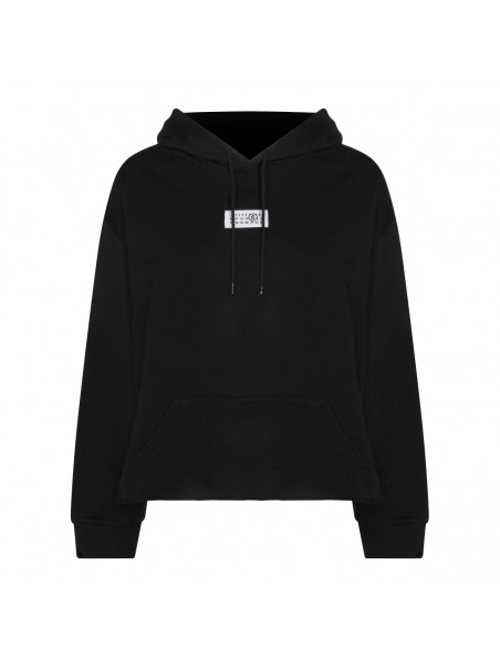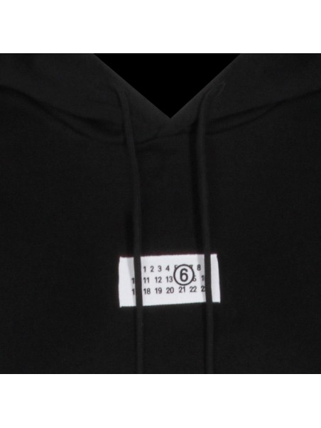 Black cotton sweatshirt from MM6 Maison Margiela featuring hooded neckline, long sleeves, kangaroo pocket, chest logo patch, back white stitch line and relaxed fit.