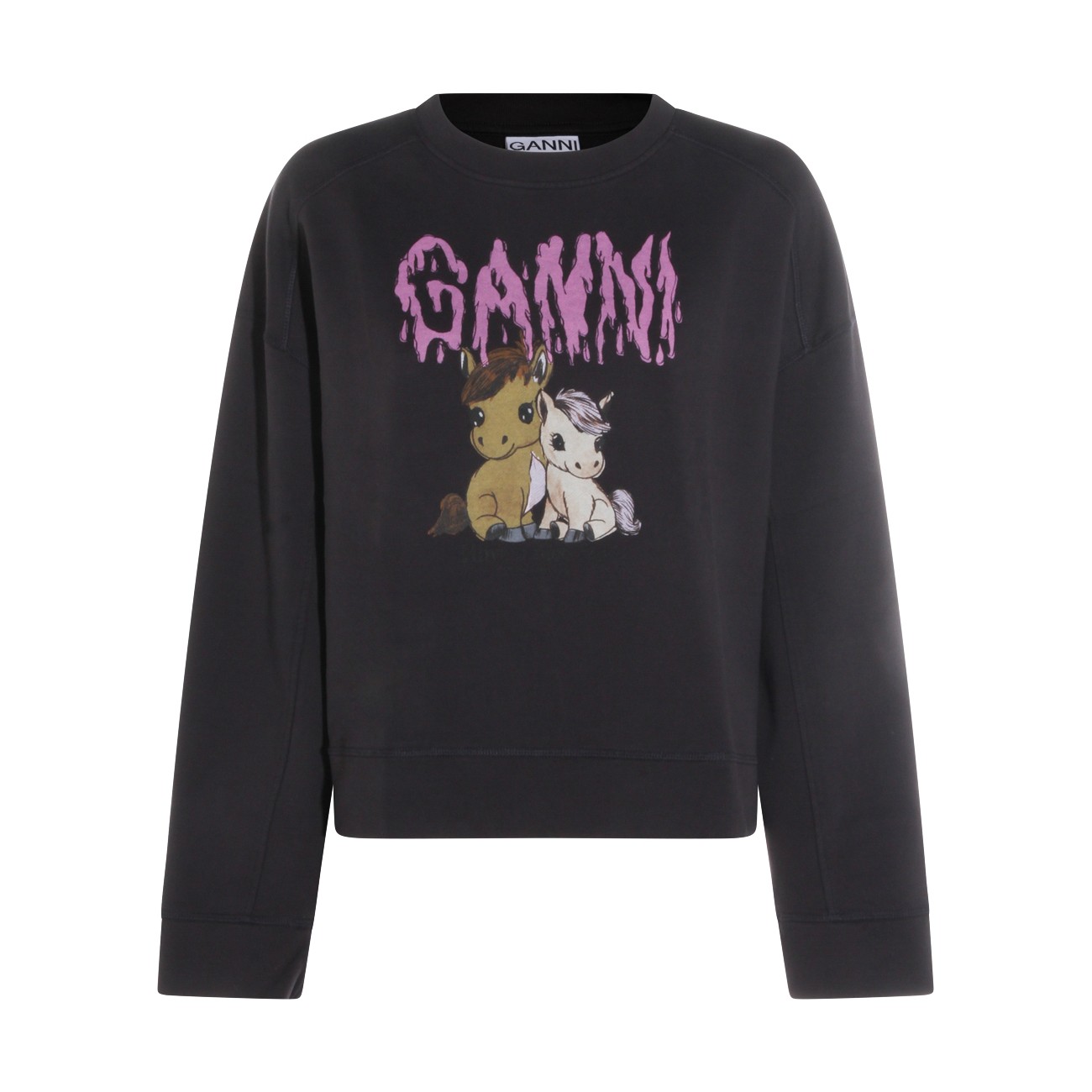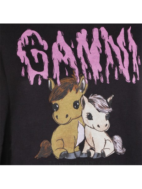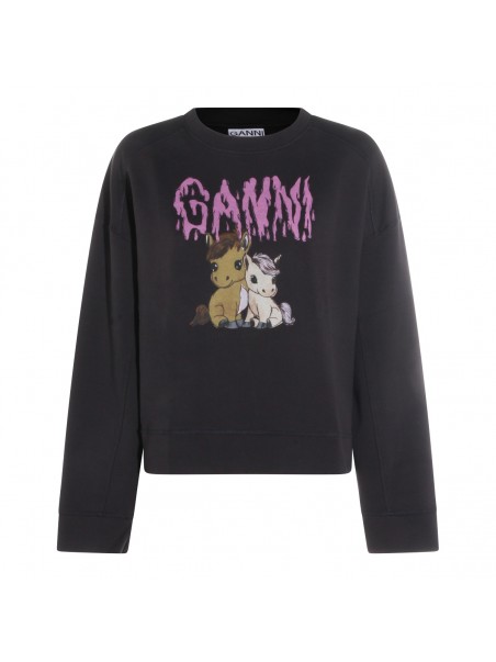Phantom cotton sweatshirt from Ganni featuring long sleeves, round neck, ribbed hems, logo insert and print at front.